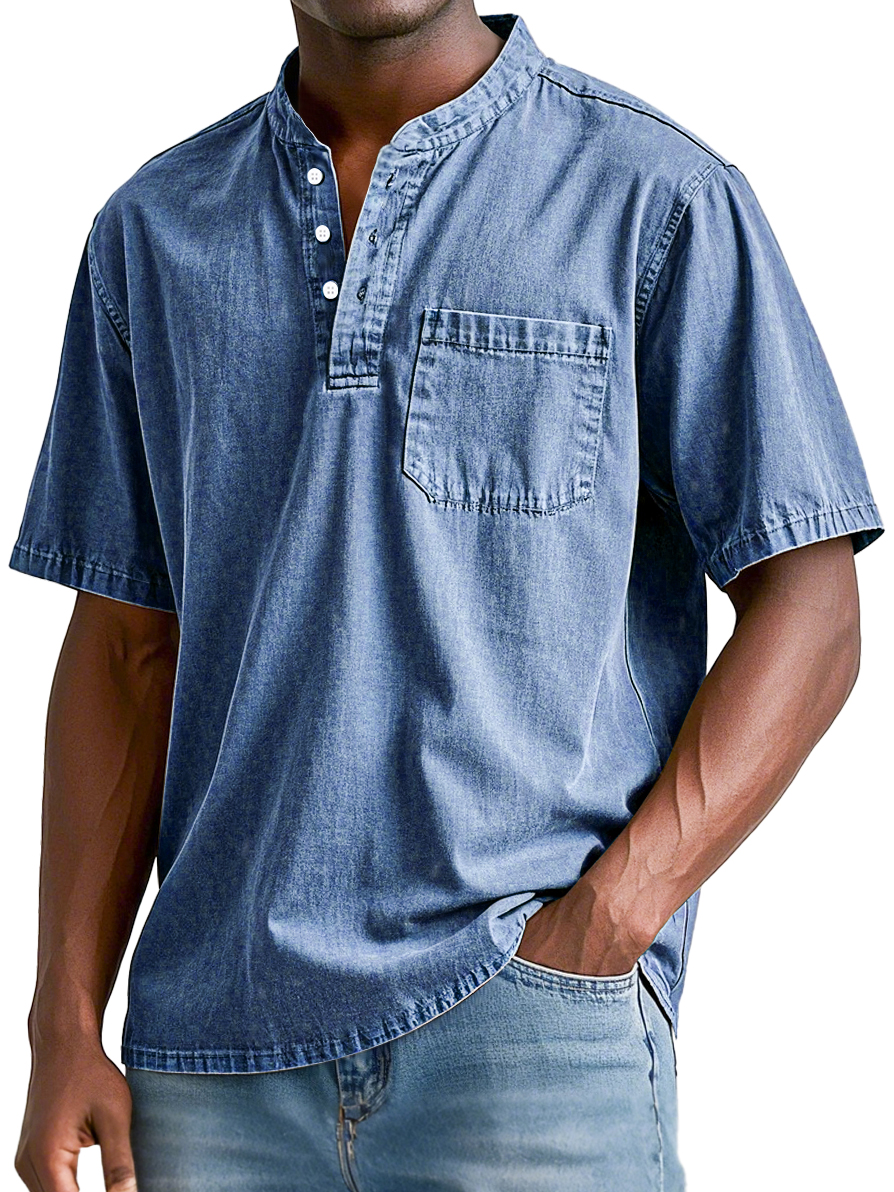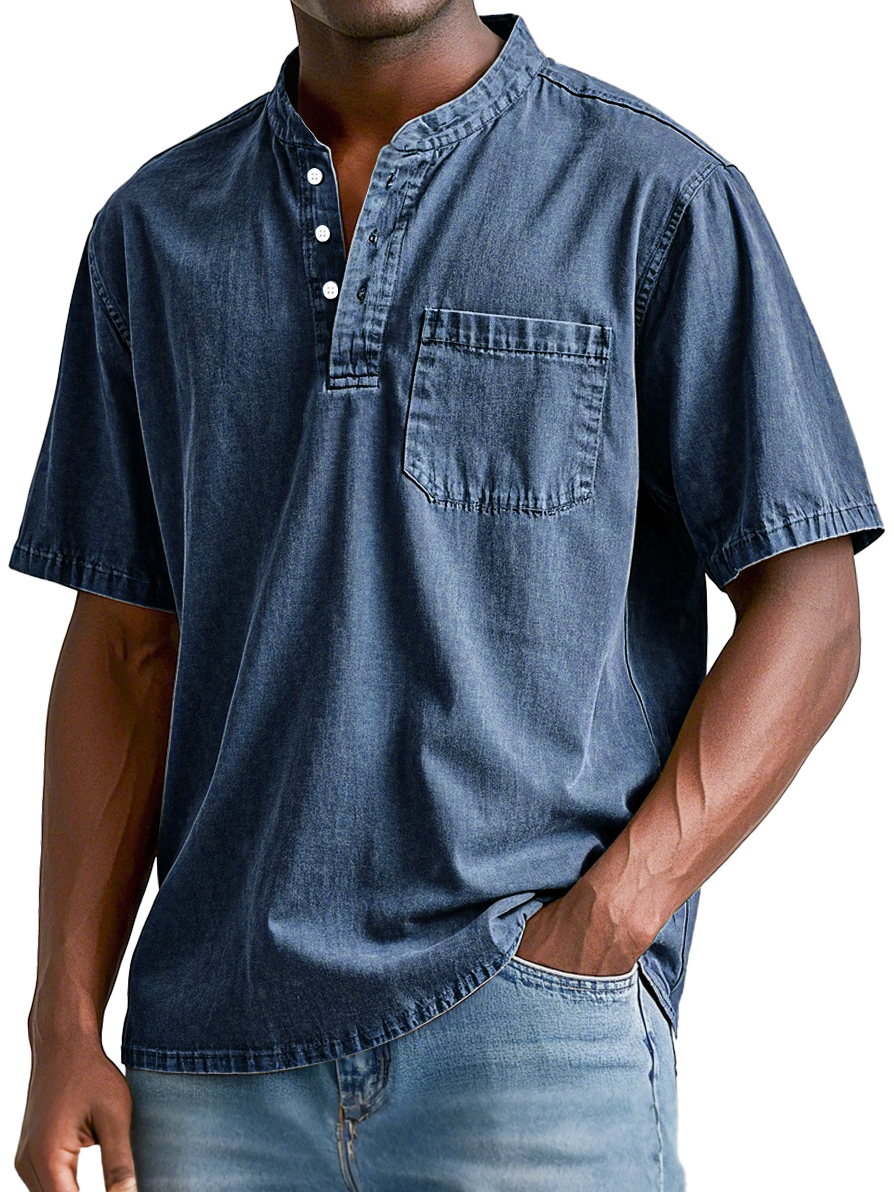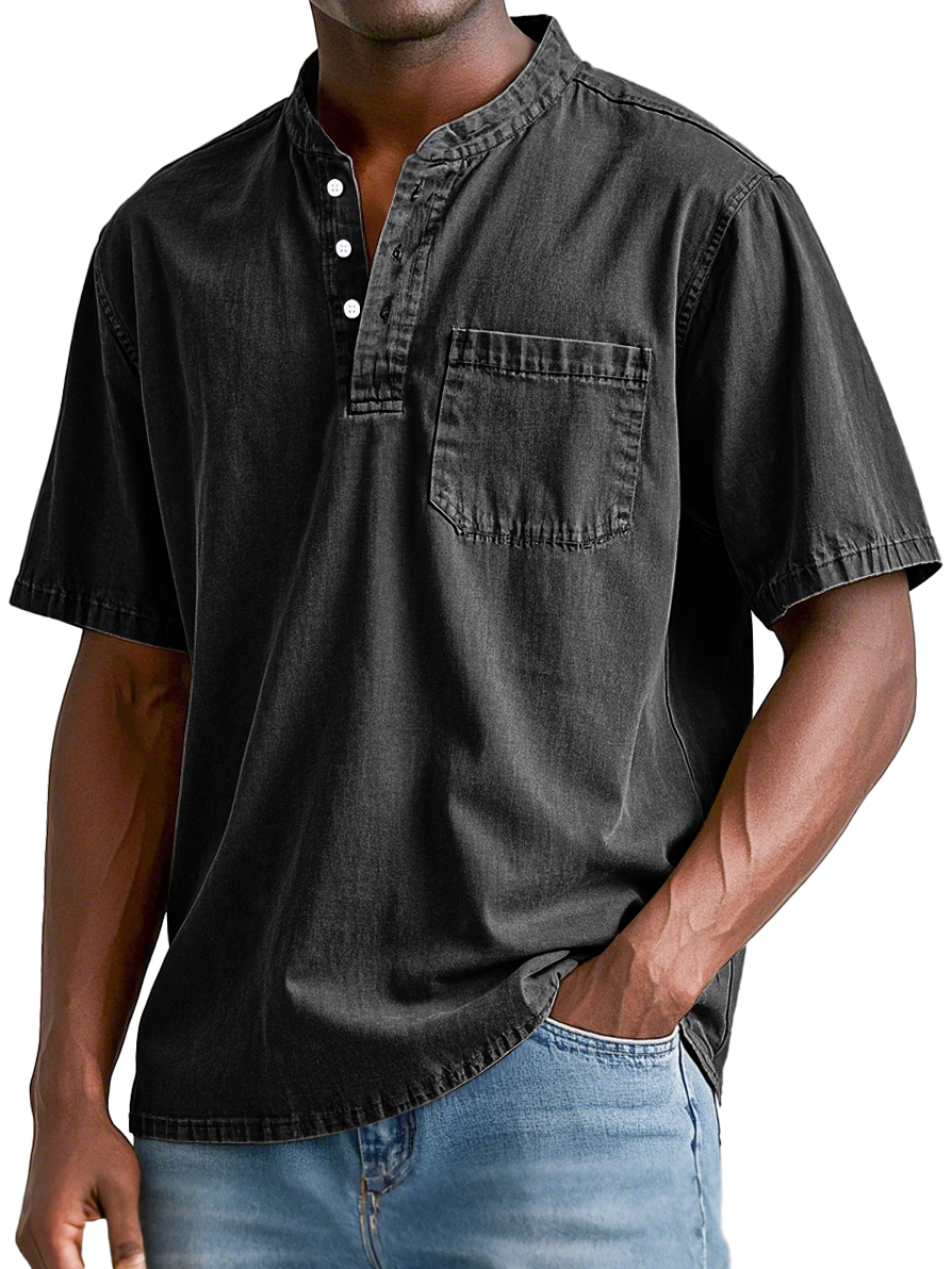 Men's Retro Stand Collar Pocket Casual Short Sleeve Henley Shirt
