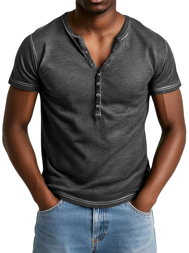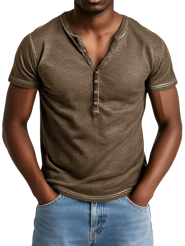 Men's Retro Washed Cotton Short-sleeved Henley Shirt