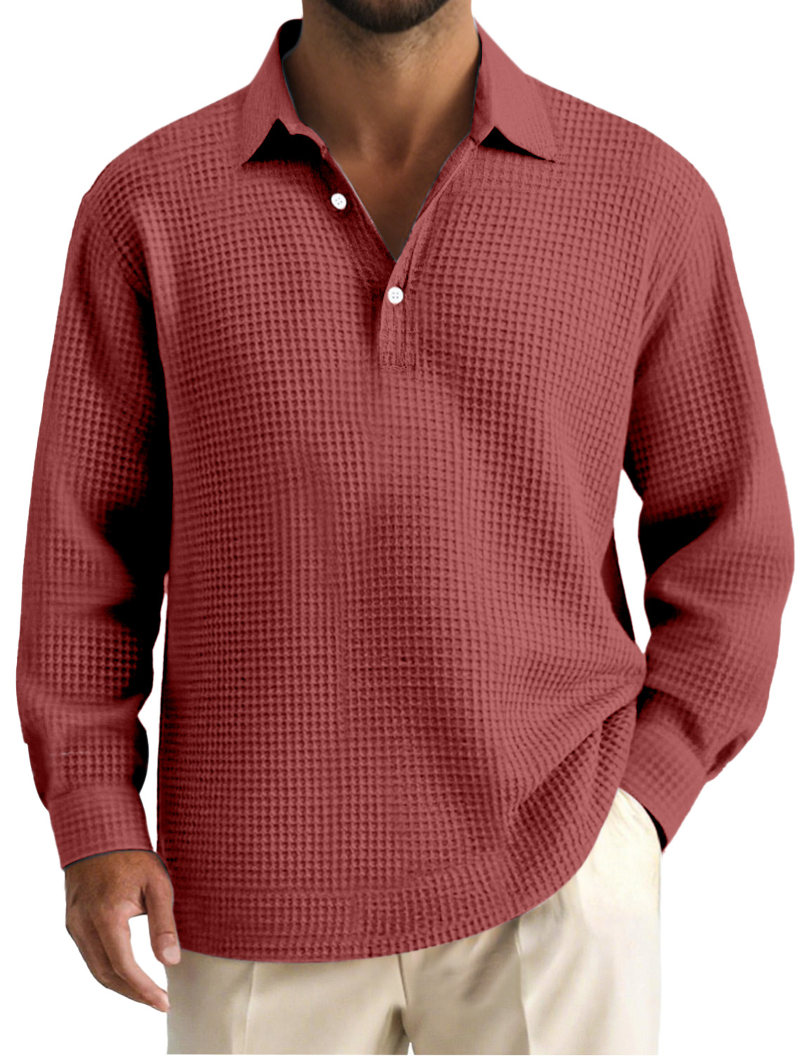 Men's Simple Solid Color Waffle Long Sleeve Polo Shirt