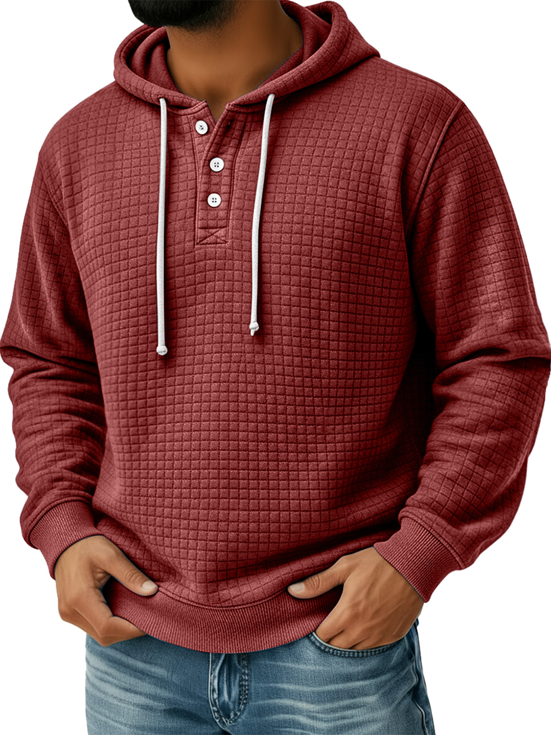 Men's Small Plaid Button Hooded Casual Loose Sweatshirt