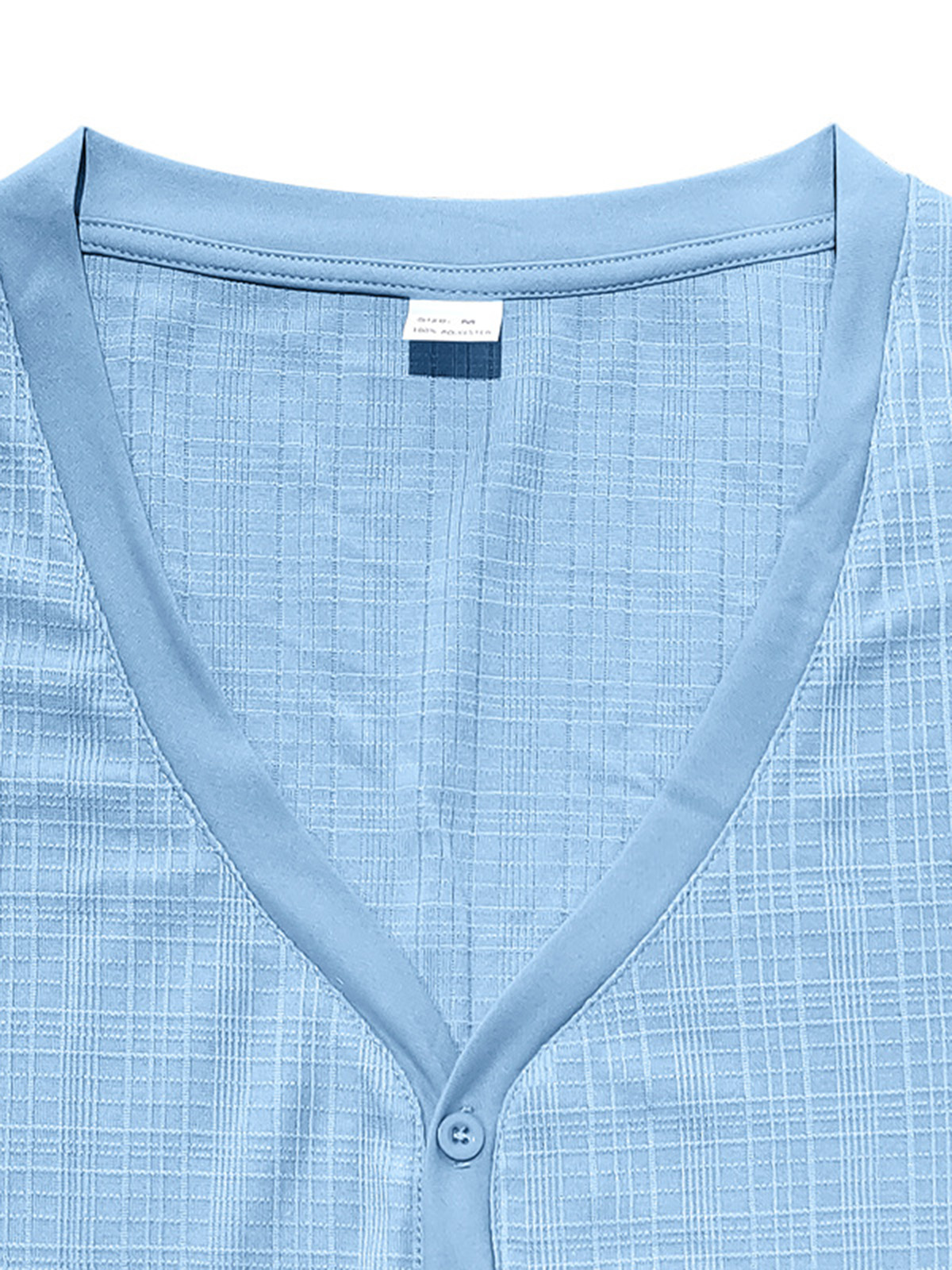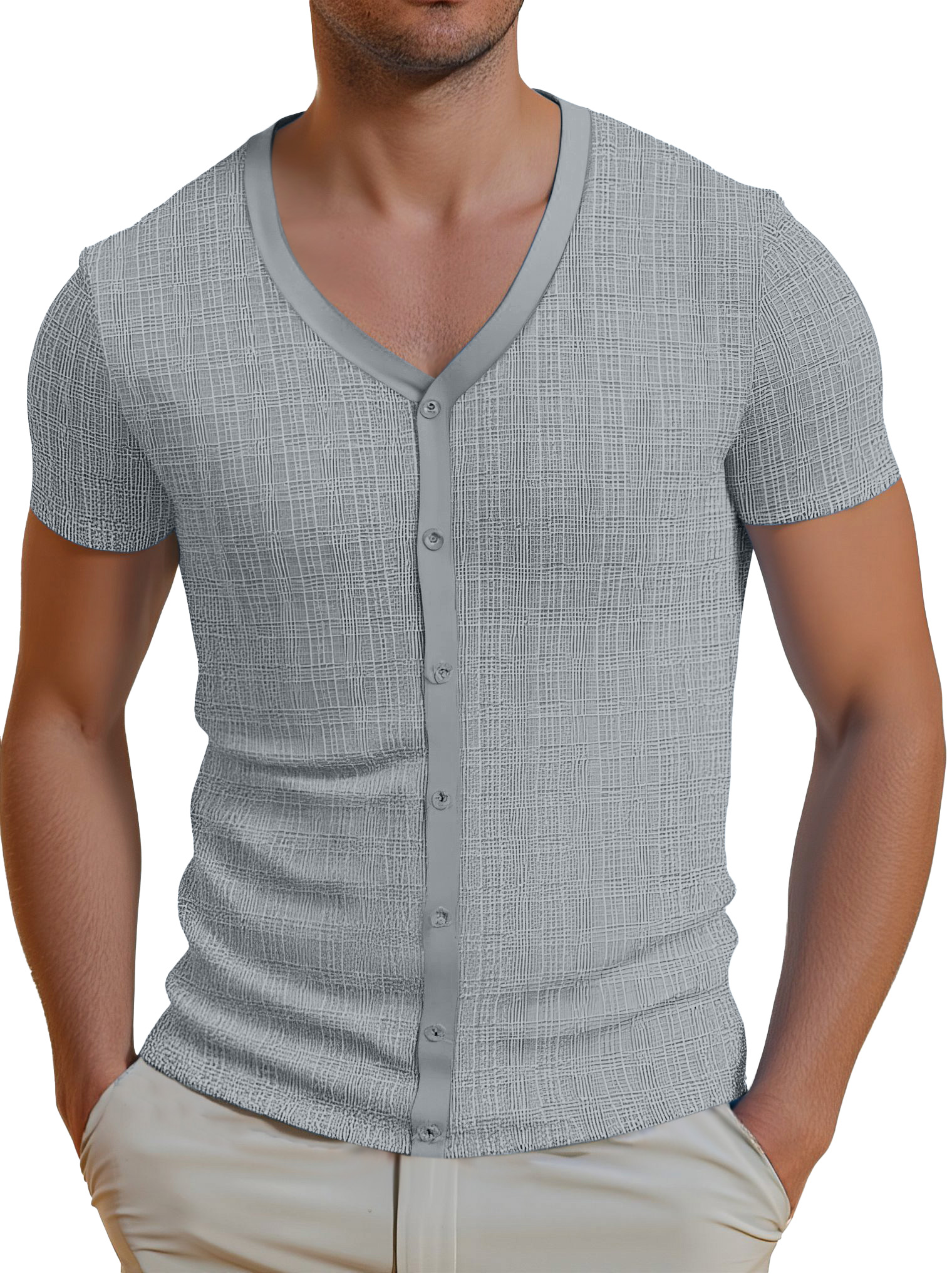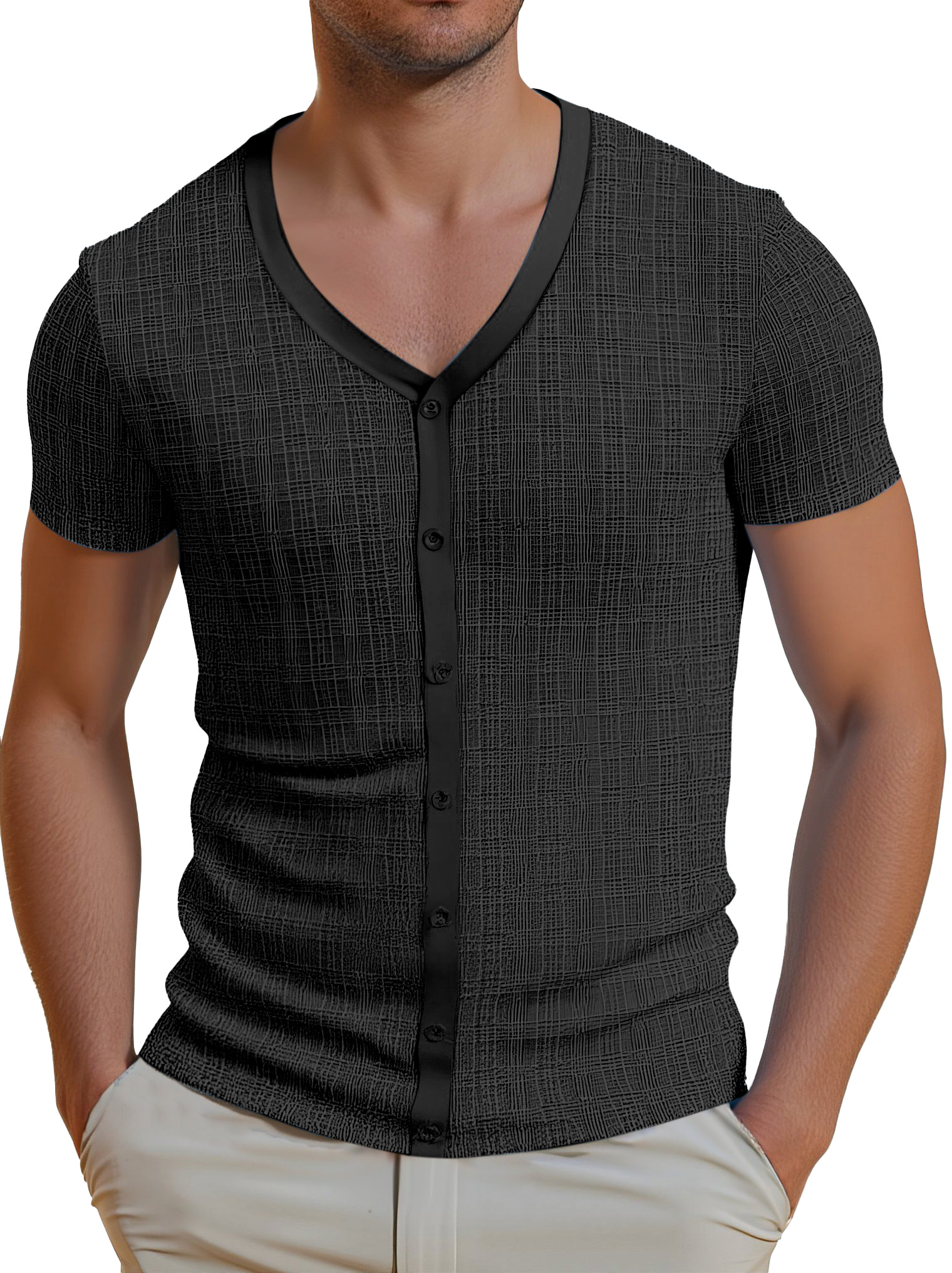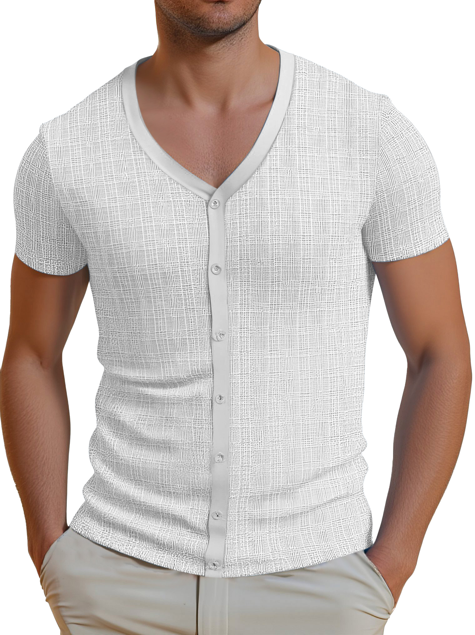 Men's Solid Color Imitation Linen Slub Loose V-Neck Button Cardigan Short Sleeve