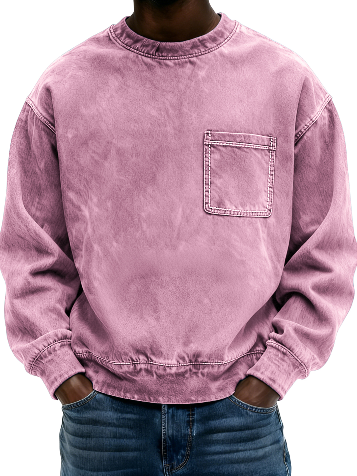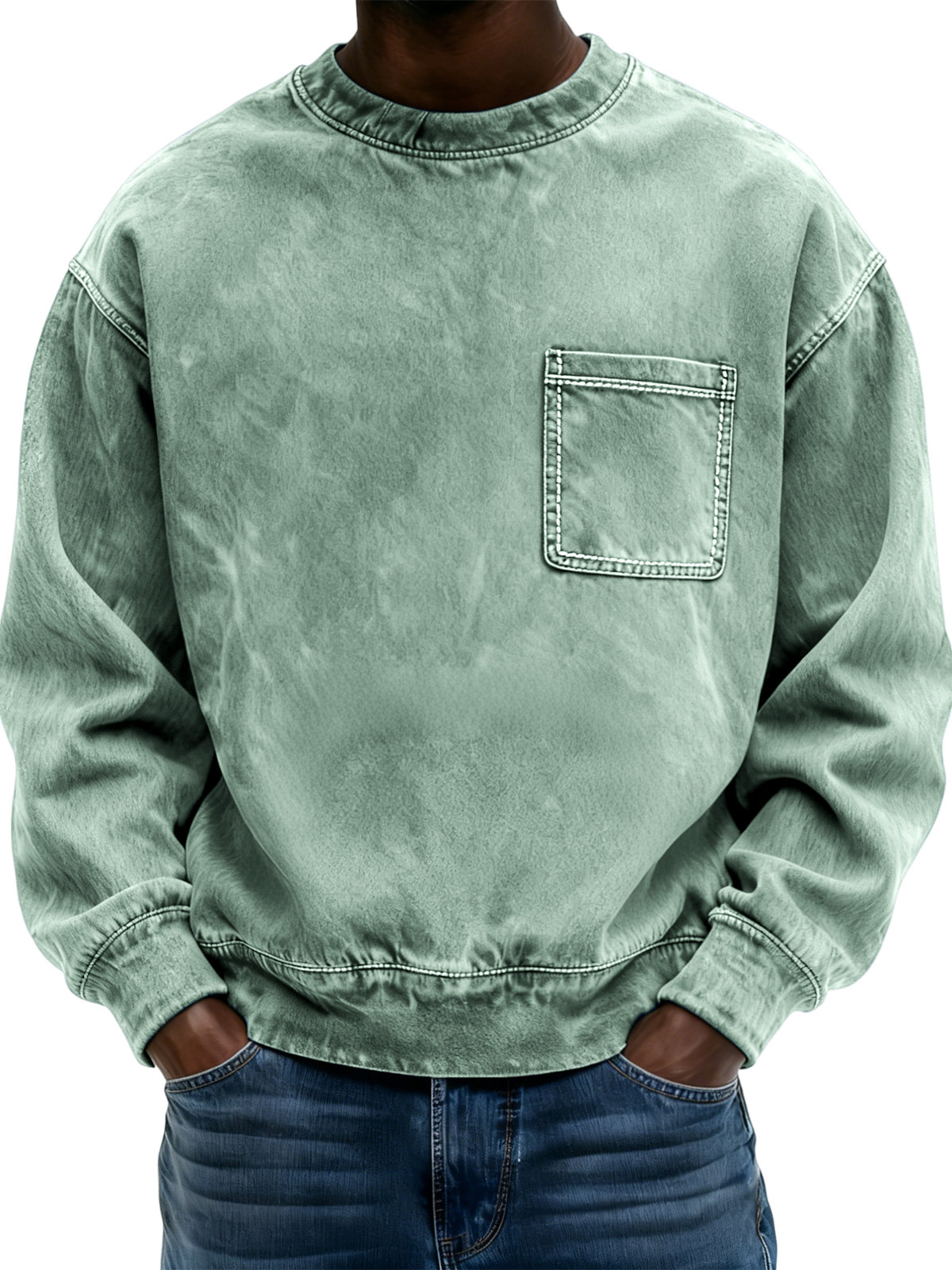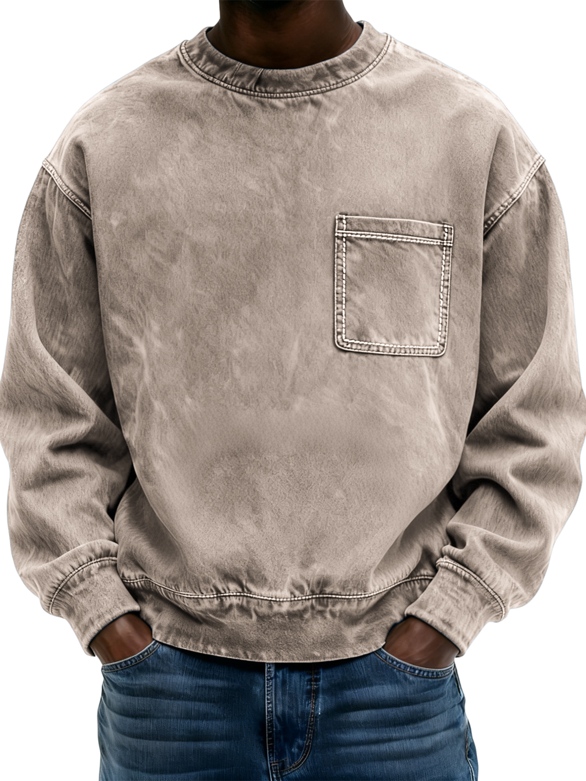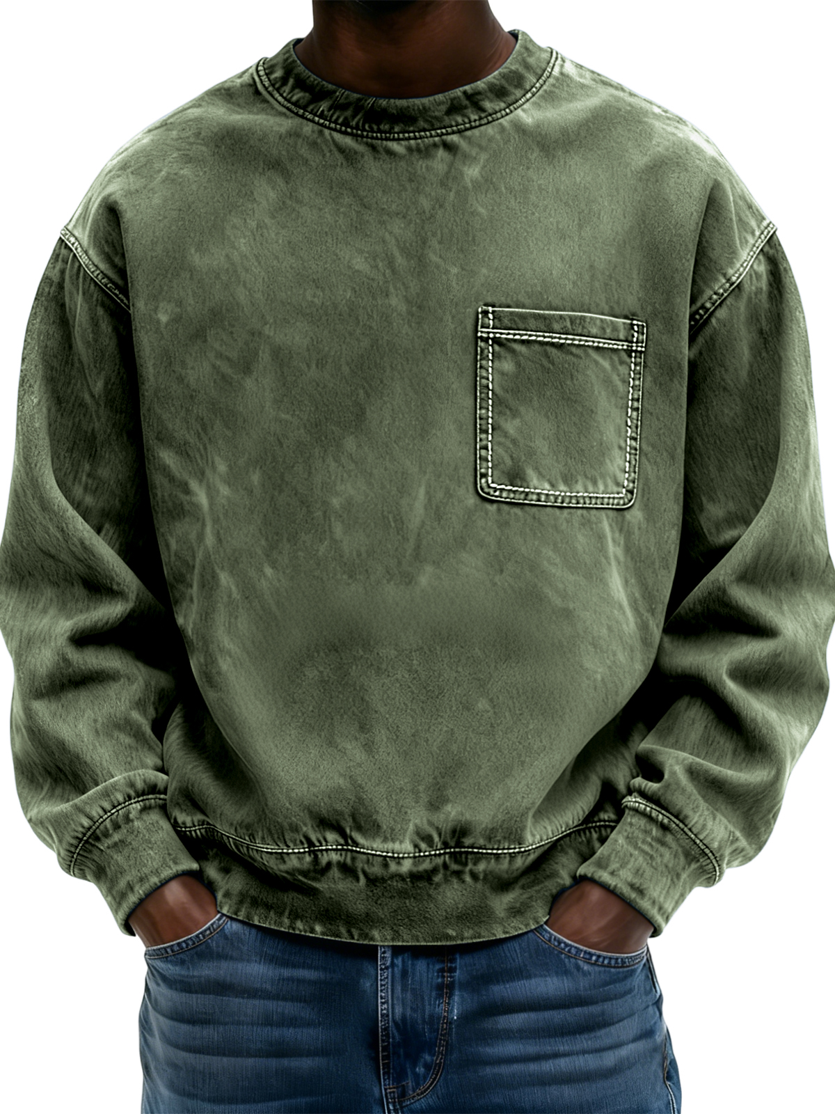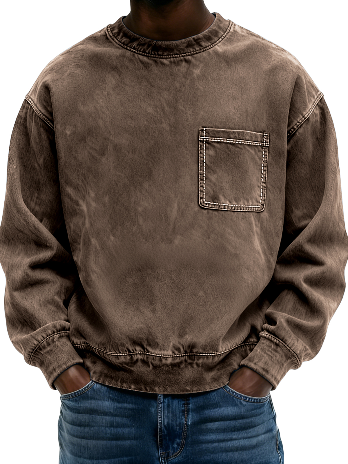 Men's Vintage Distressed Crew Neck Long-sleeved Top with Pockets