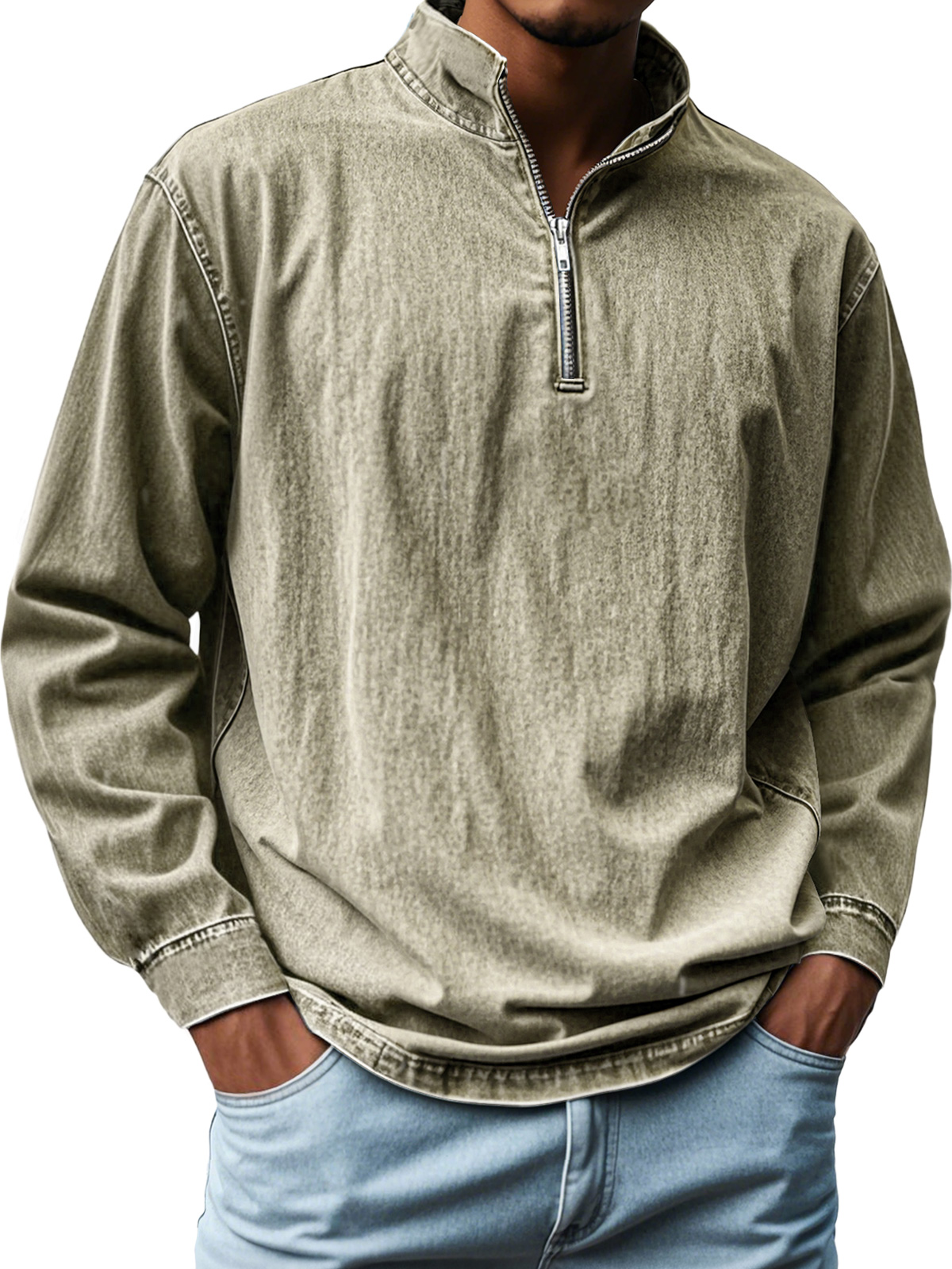 Men's Vintage Distressed Stand-up Collar Zipper Casual Long-sleeved T-shirt