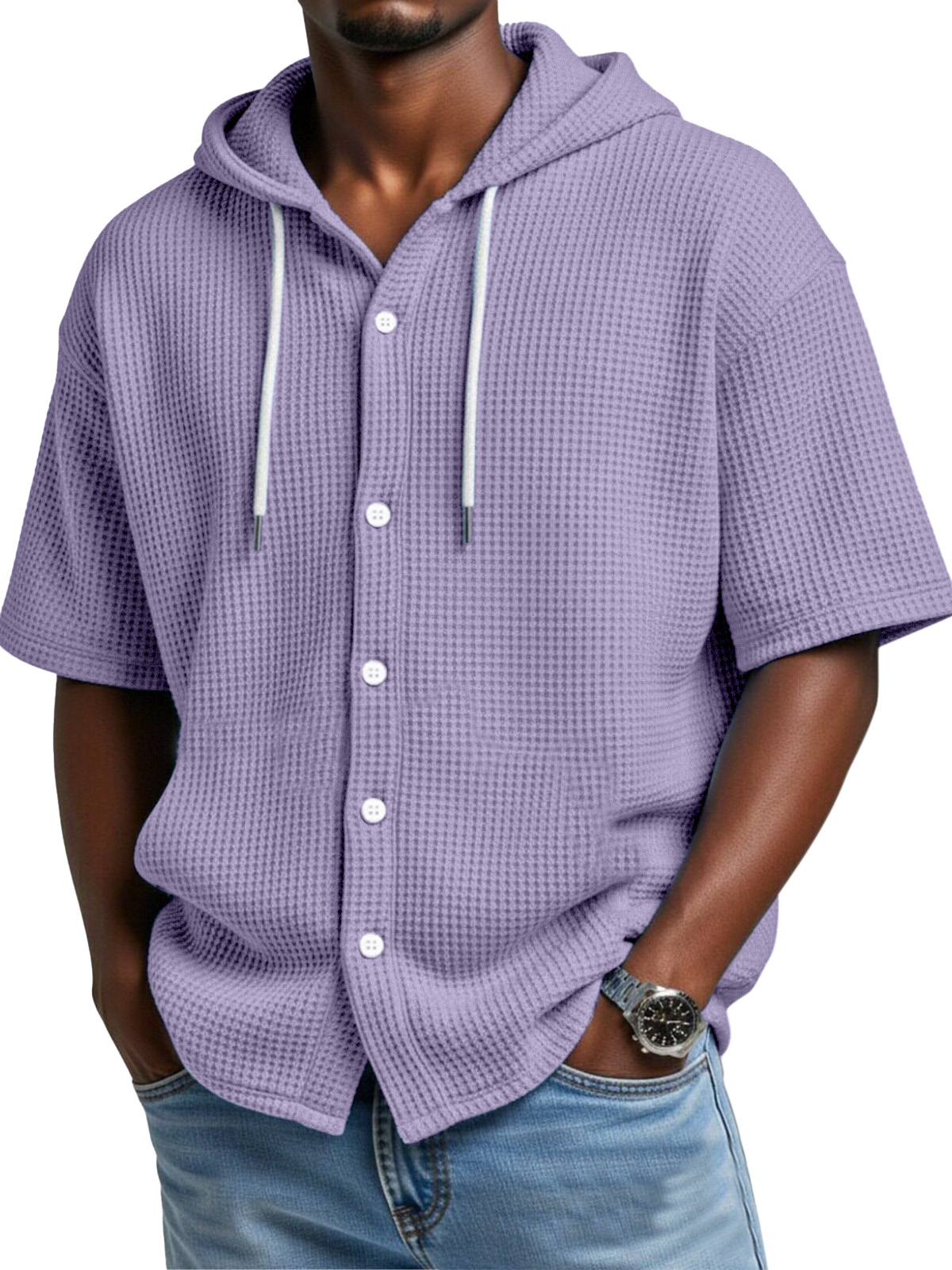 Everyday Casual Waffle Hooded Short Sleeve Button-Down Shirt