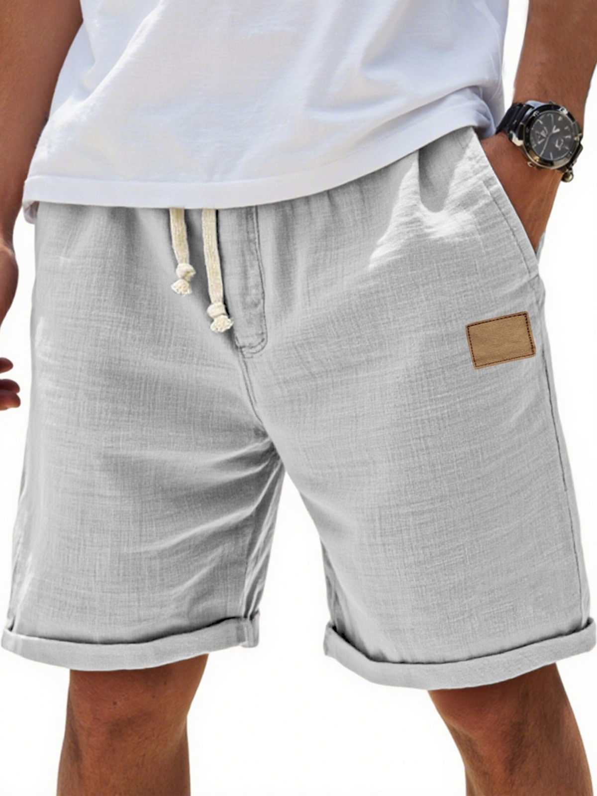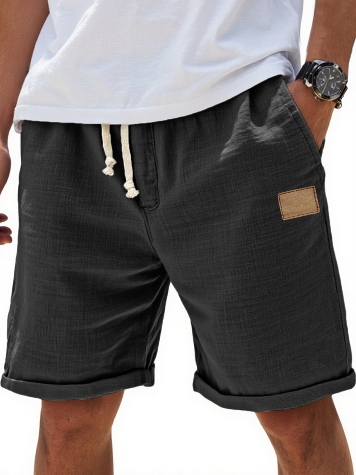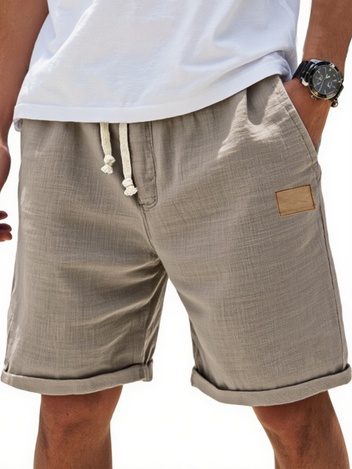 Men's Breathable Cotton and Linen Holiday Lace-Up Everyday Shorts with Embroidered Label