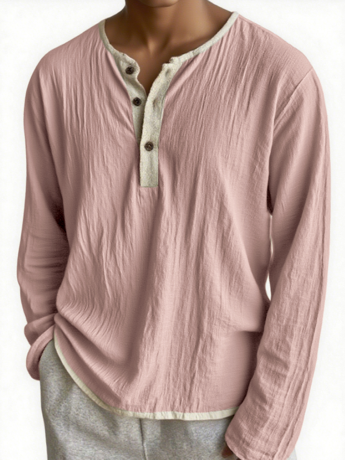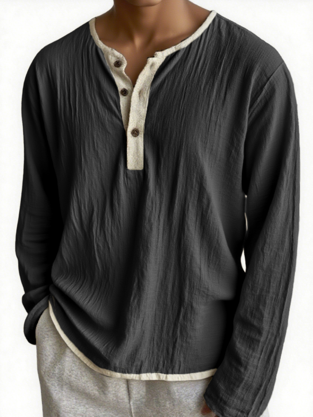Men's Urban Casual Crinkled Linen Color-block Long-sleeve Henley Shirt