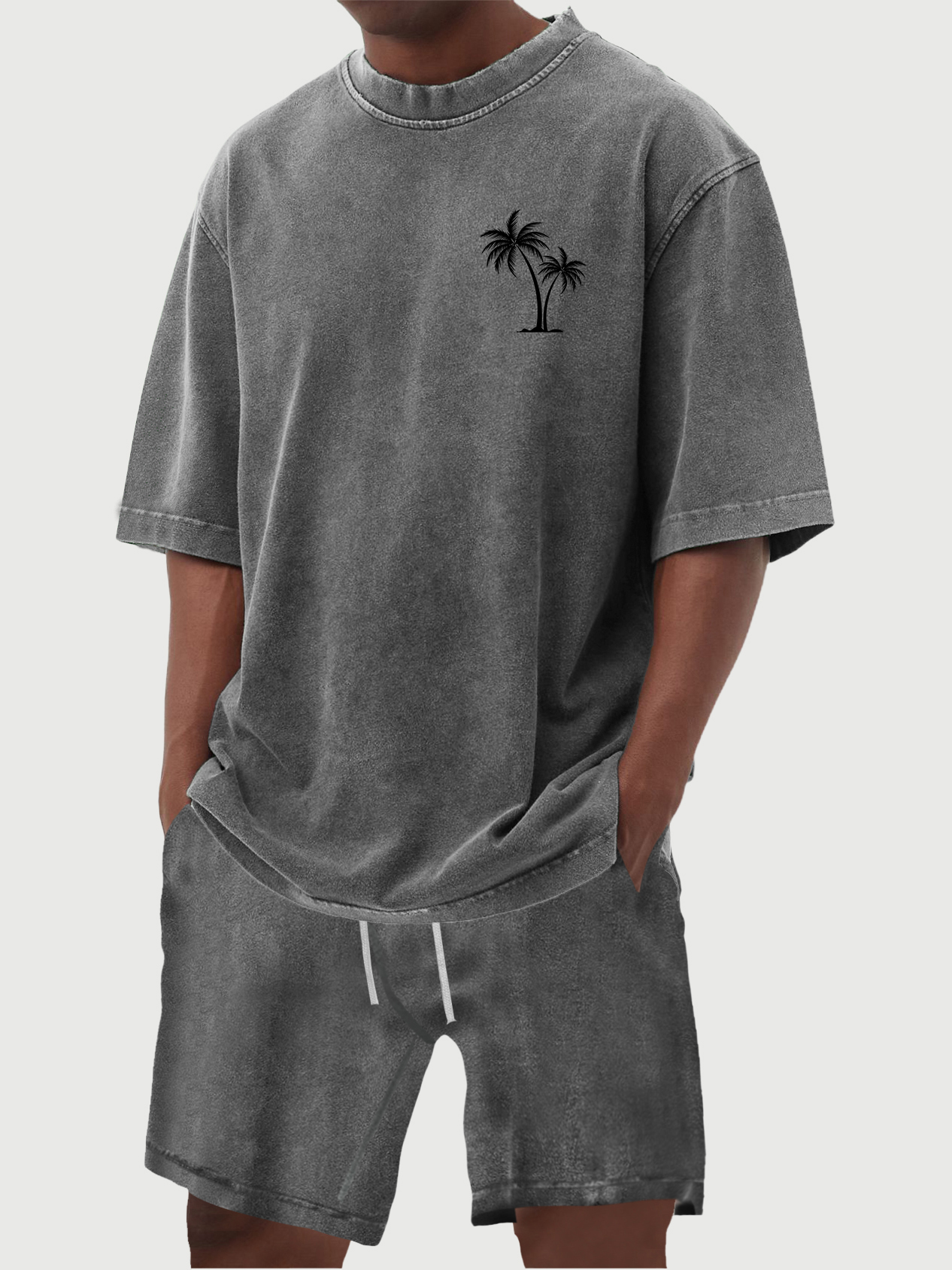 Men's 100% Cotton Vintage Distressed Washed Coconut Tree Print Short Sleeved Shirt Shorts Set