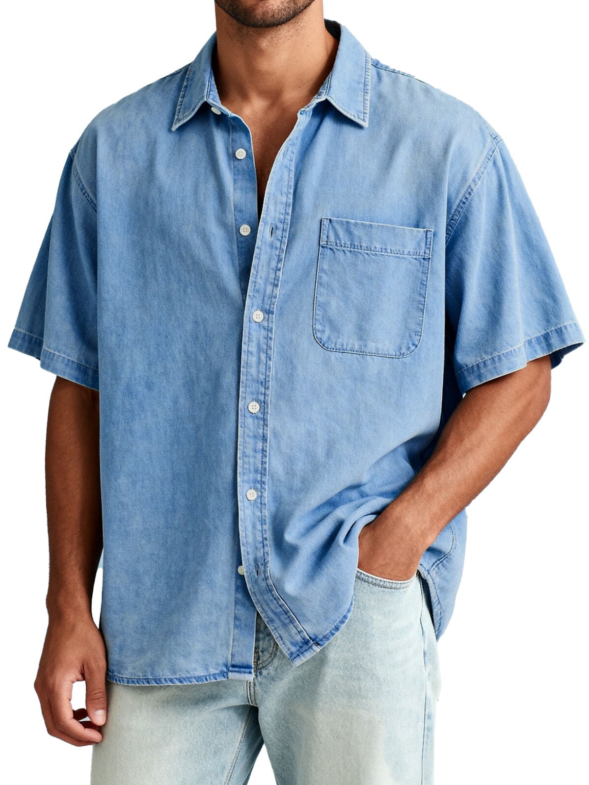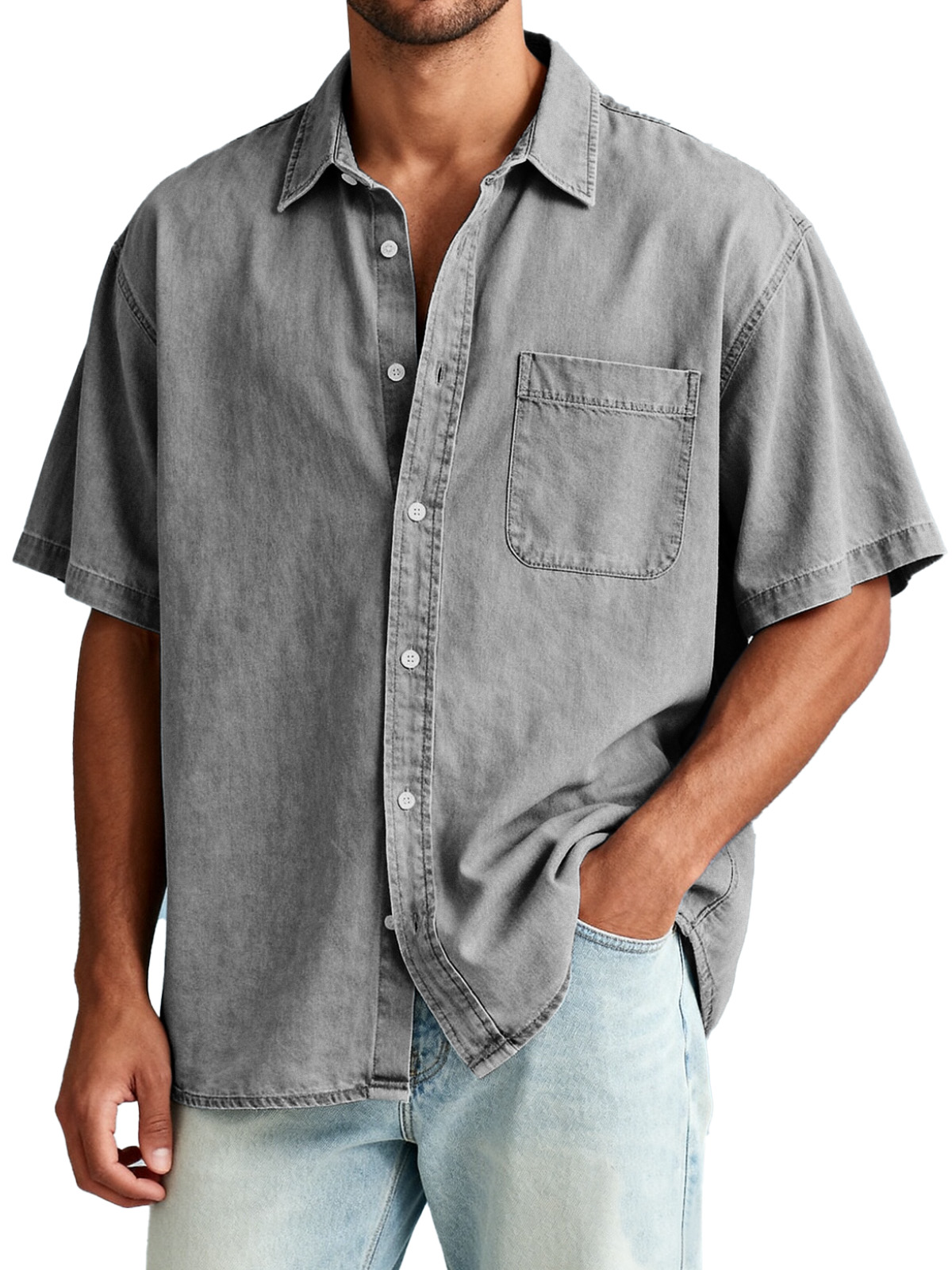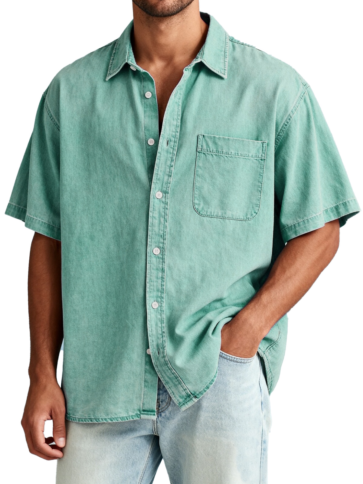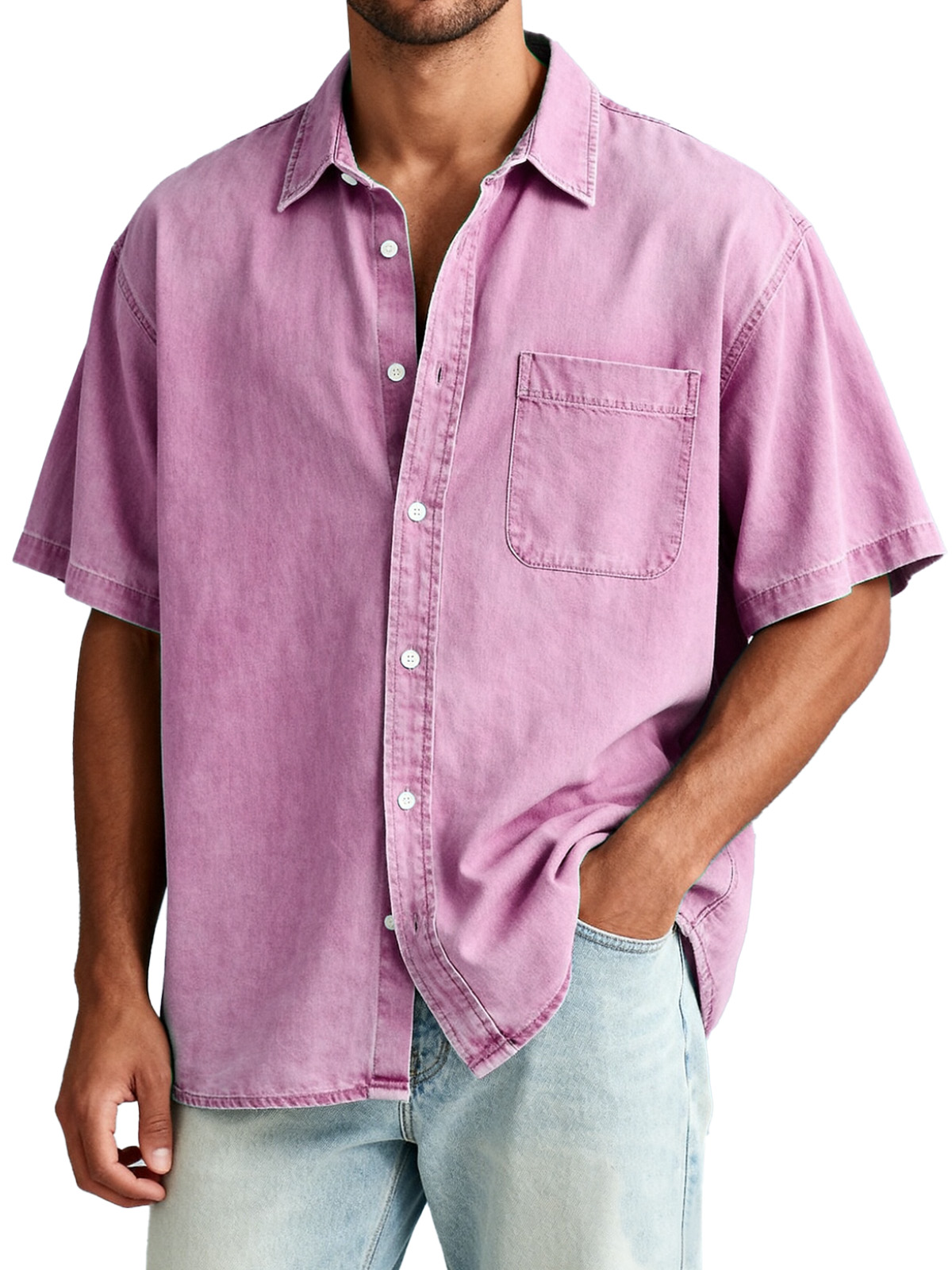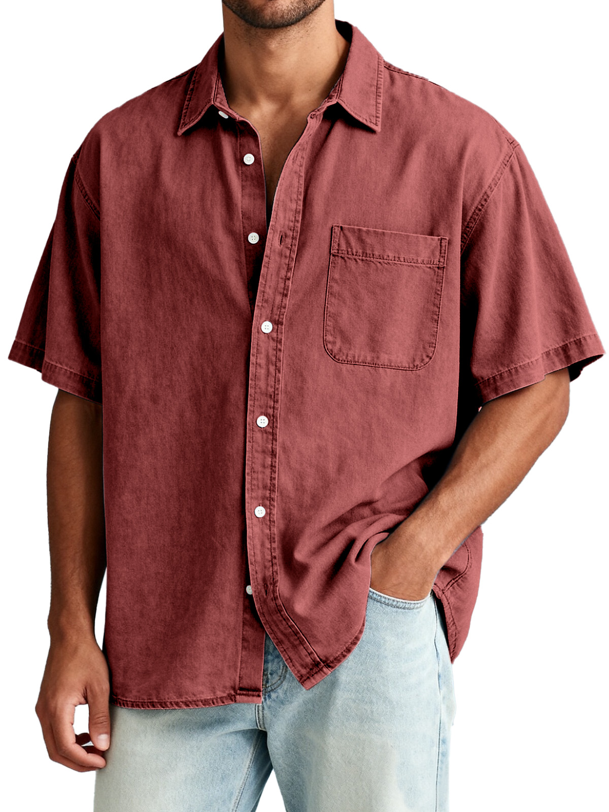Men's American Retro Solid Color Short Sleeve Shirt with Pocket
