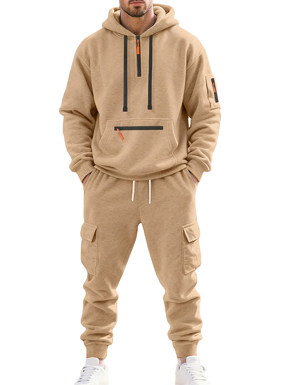 Men's Autumn and Winter Fleece Casual Zipper Sweatshirt Multi-Pocket Overalls Set