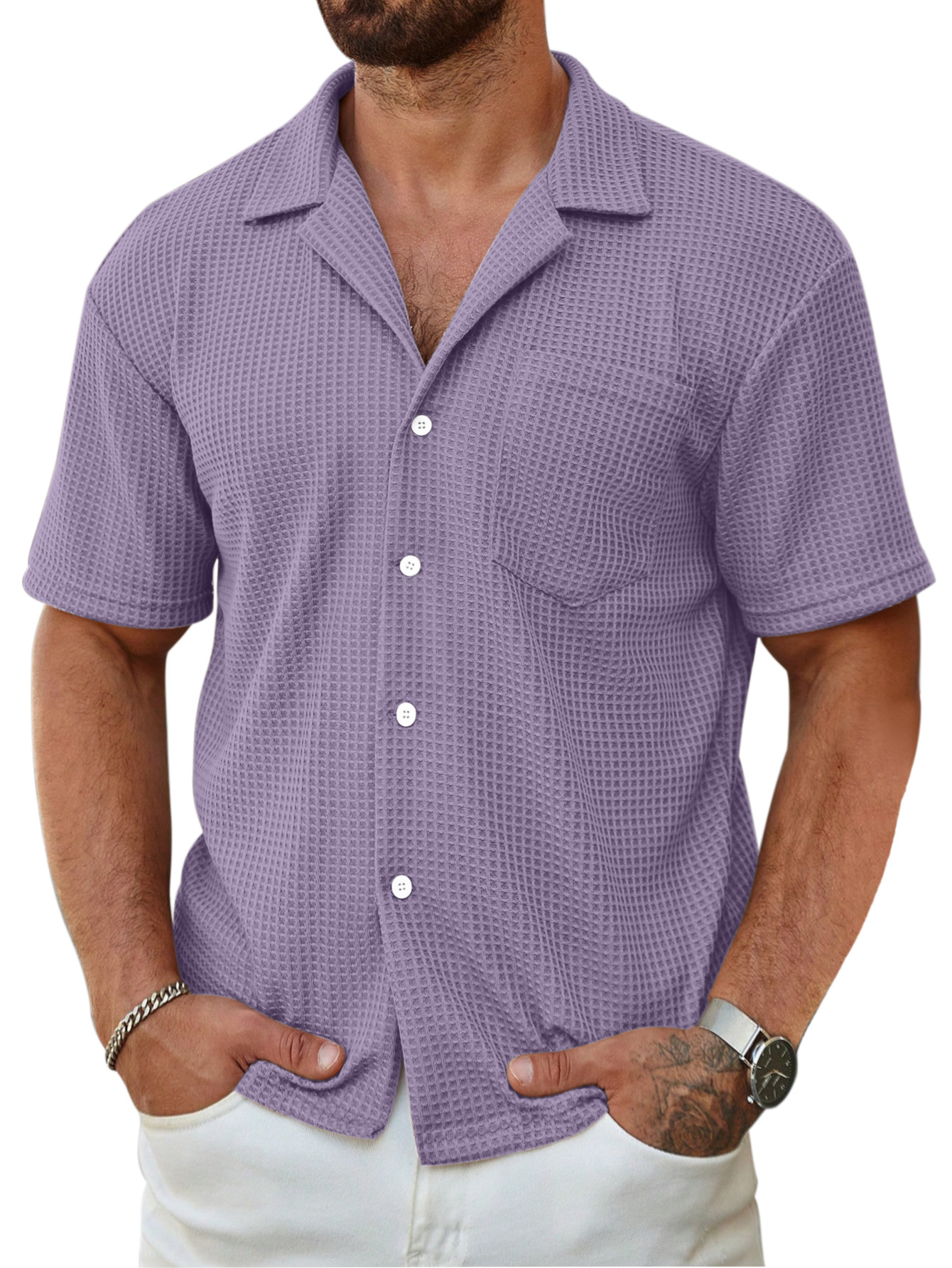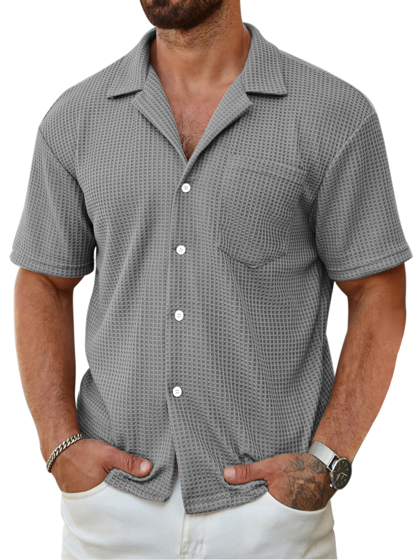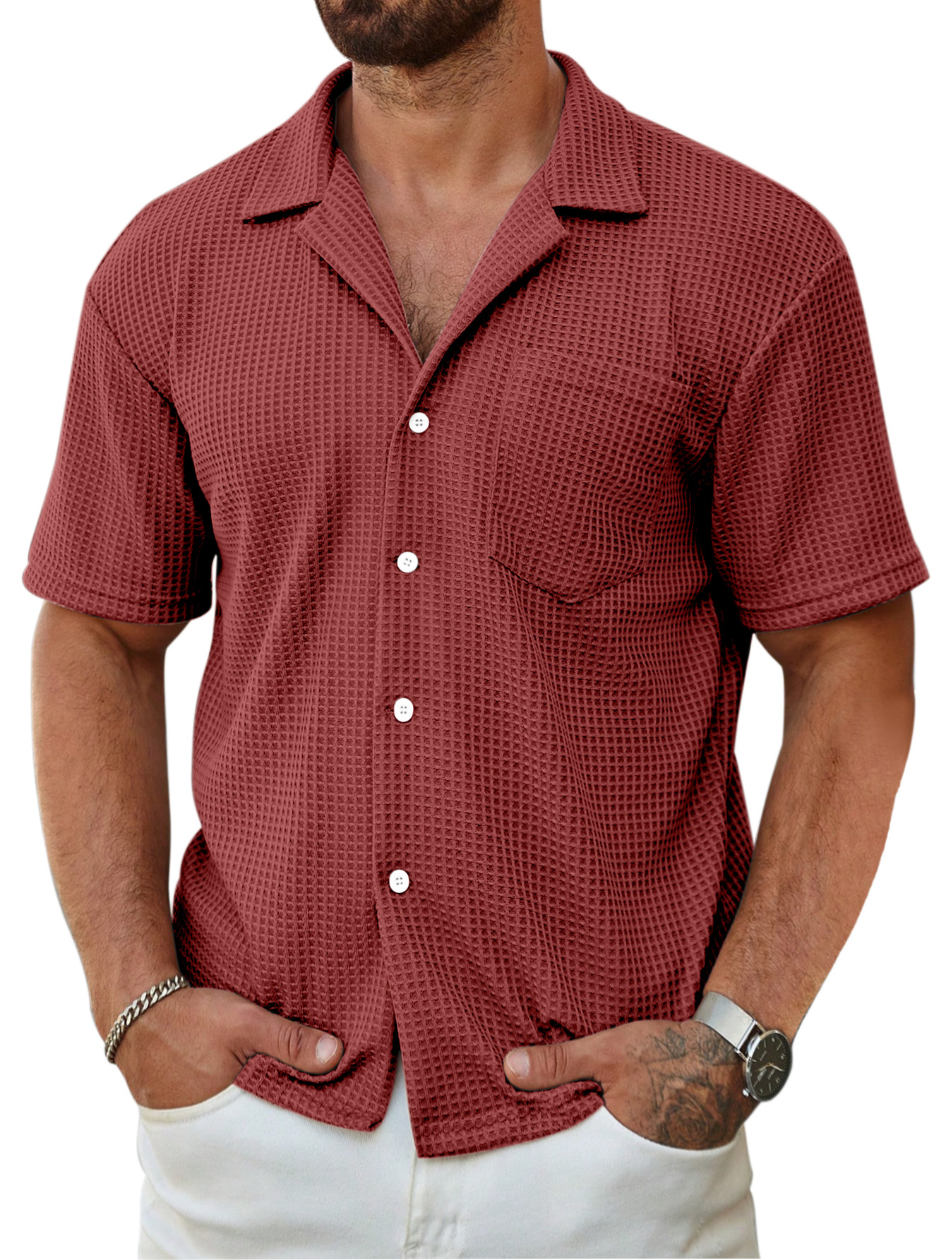 Men's Casual Hawaiian Simple Solid Color Waffle Cuban Collar Short Sleeve Shirt
