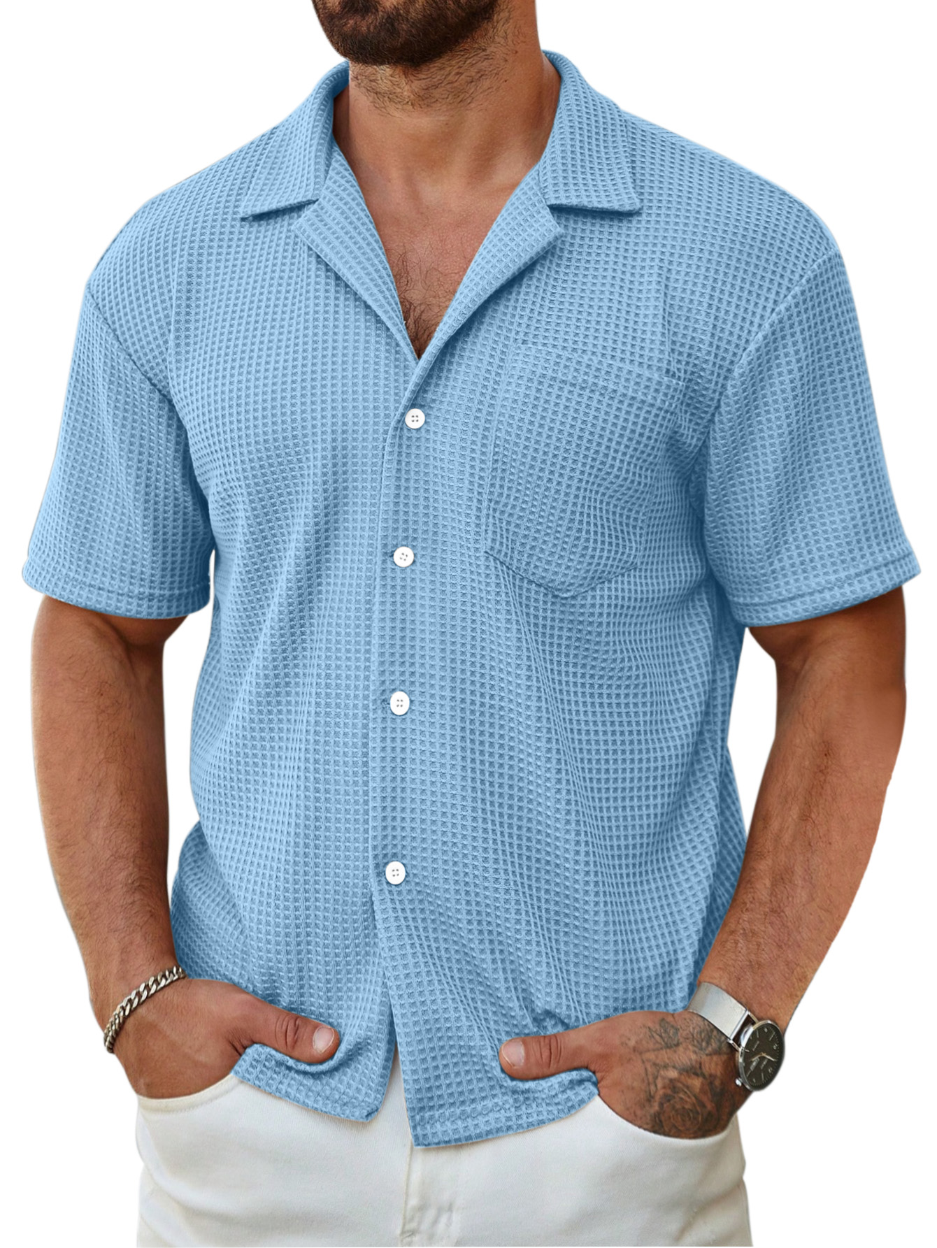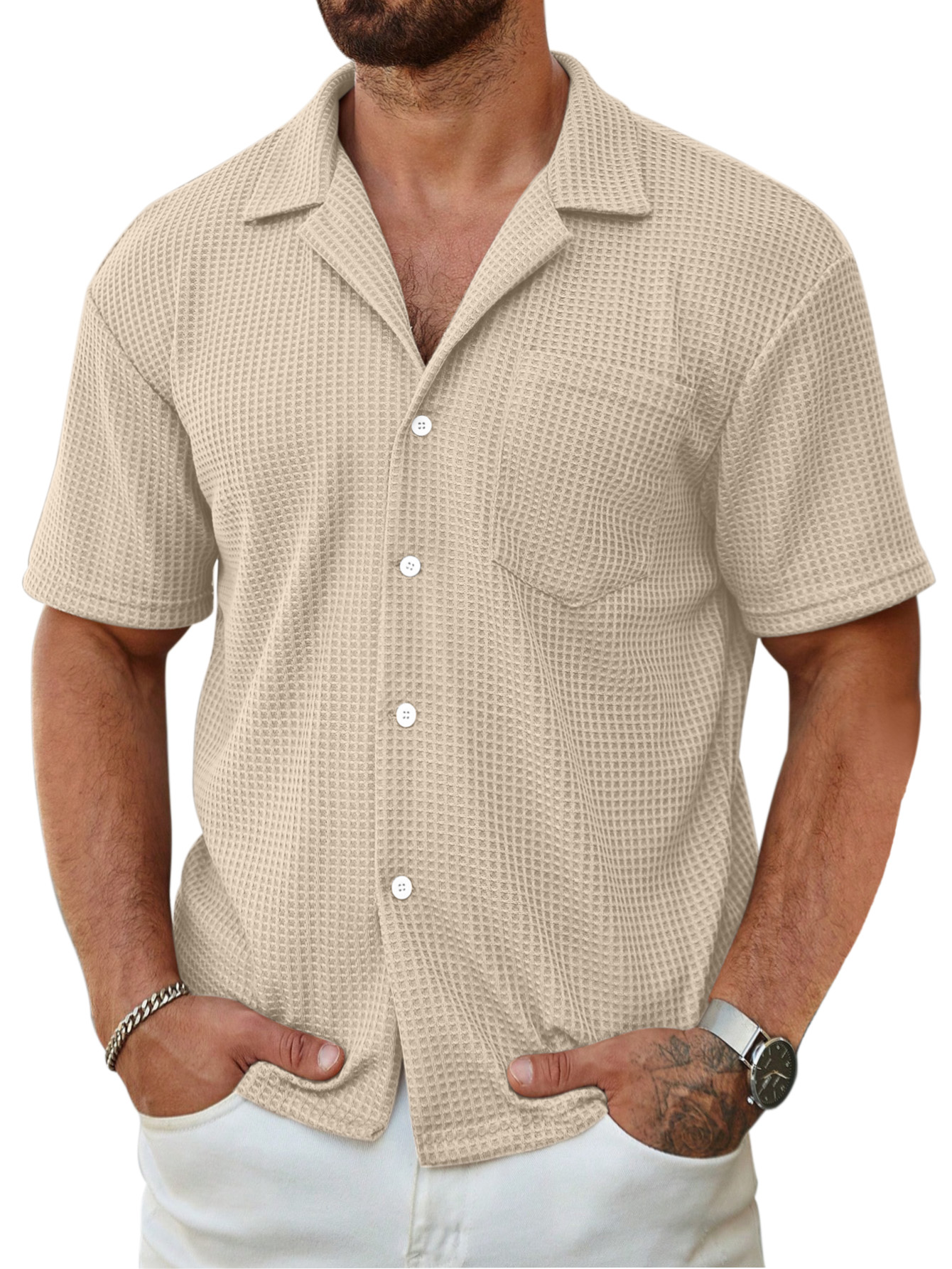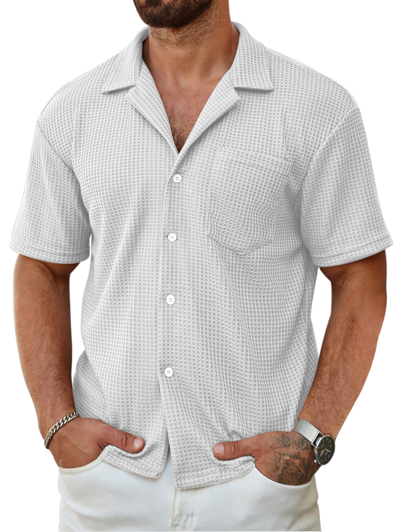 Men's Casual Hawaiian Simple Solid Color Waffle Cuban Collar Short Sleeve Shirt