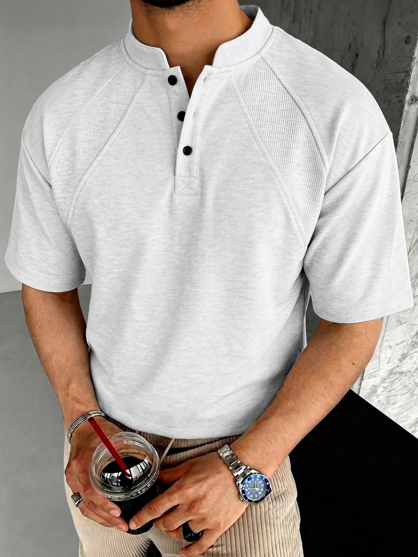Men's Casual Short-Sleeve Henley Shirt with Stand Collar and Button Accents