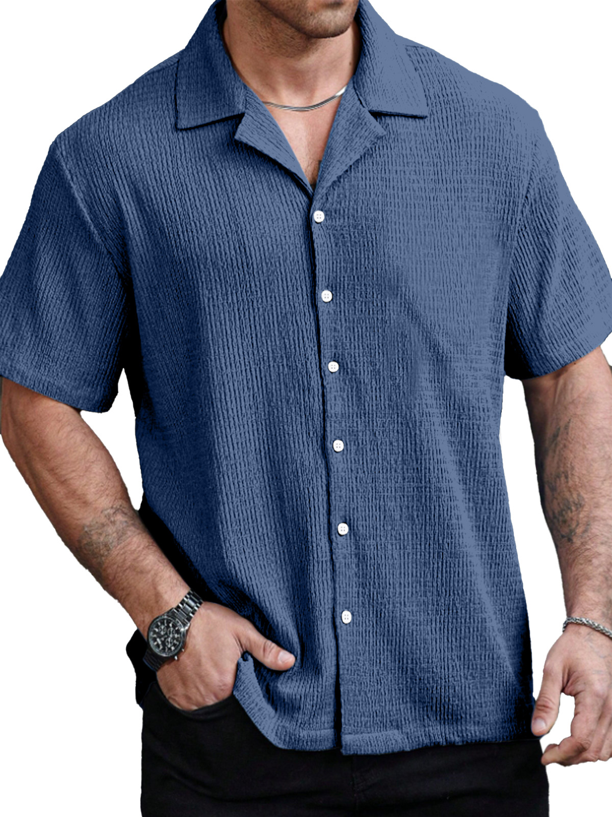 Men's Casual Solid Color Texture Cuban Collar Short Sleeve Shirt