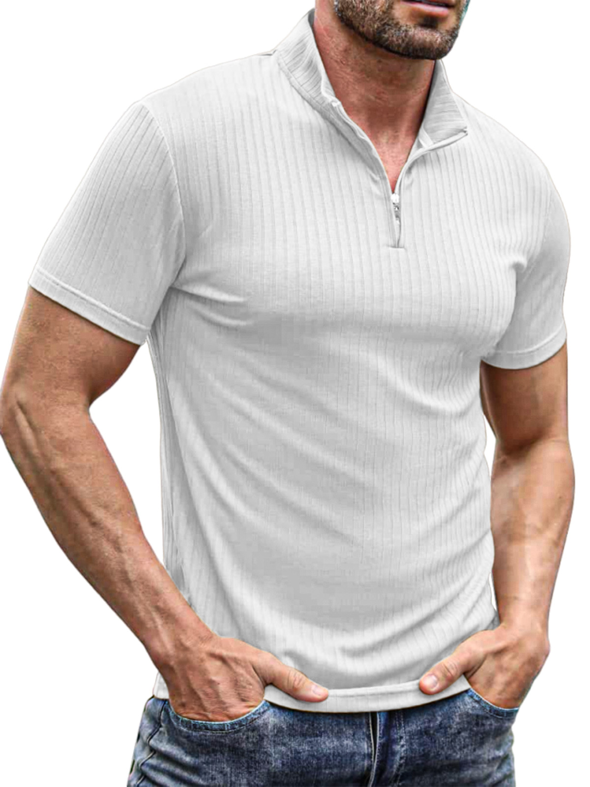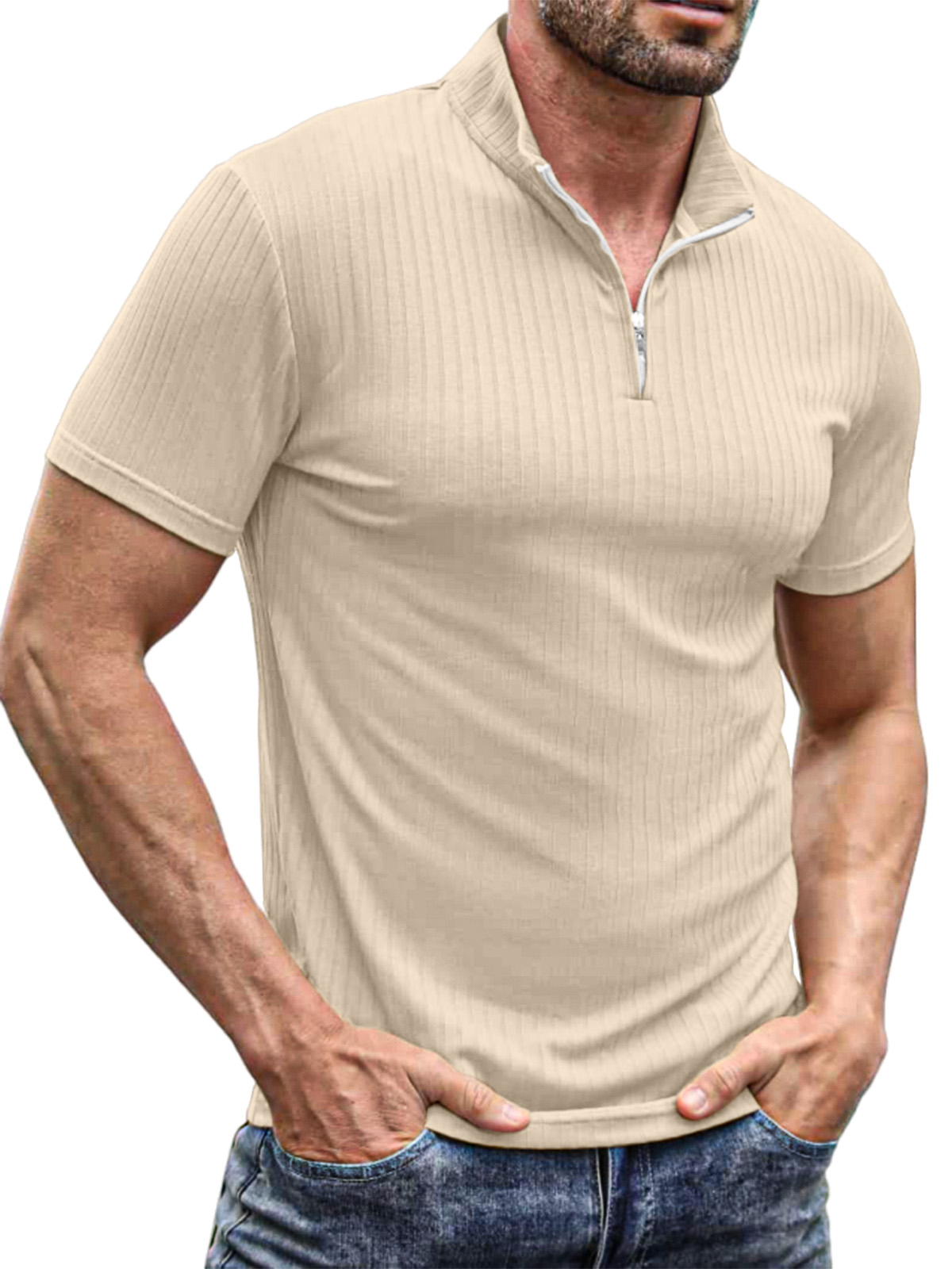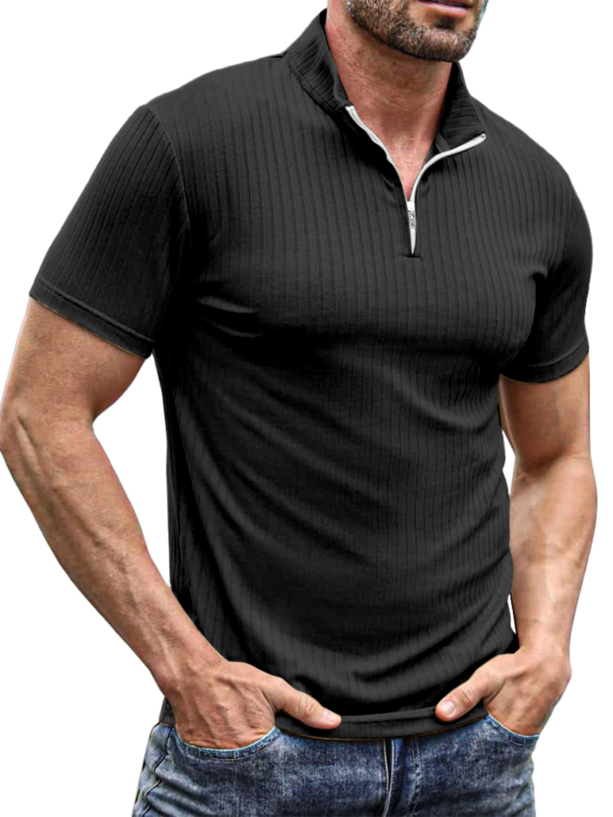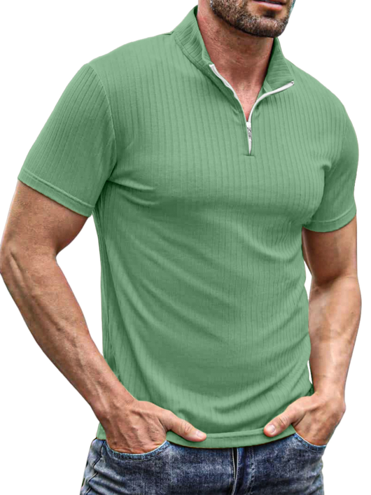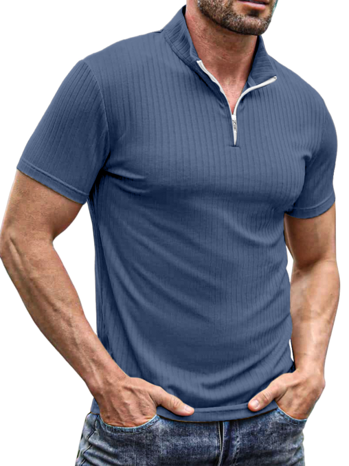 Men's Casual Solid Color Vertical Striped Stand Collar Zipper Short-sleeved Polo Shirt