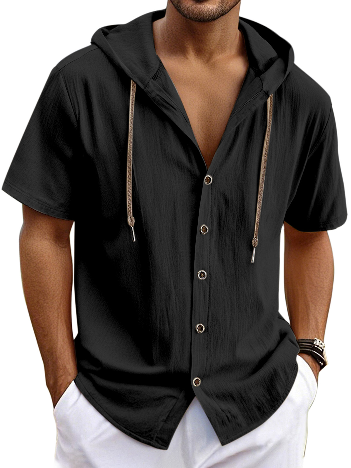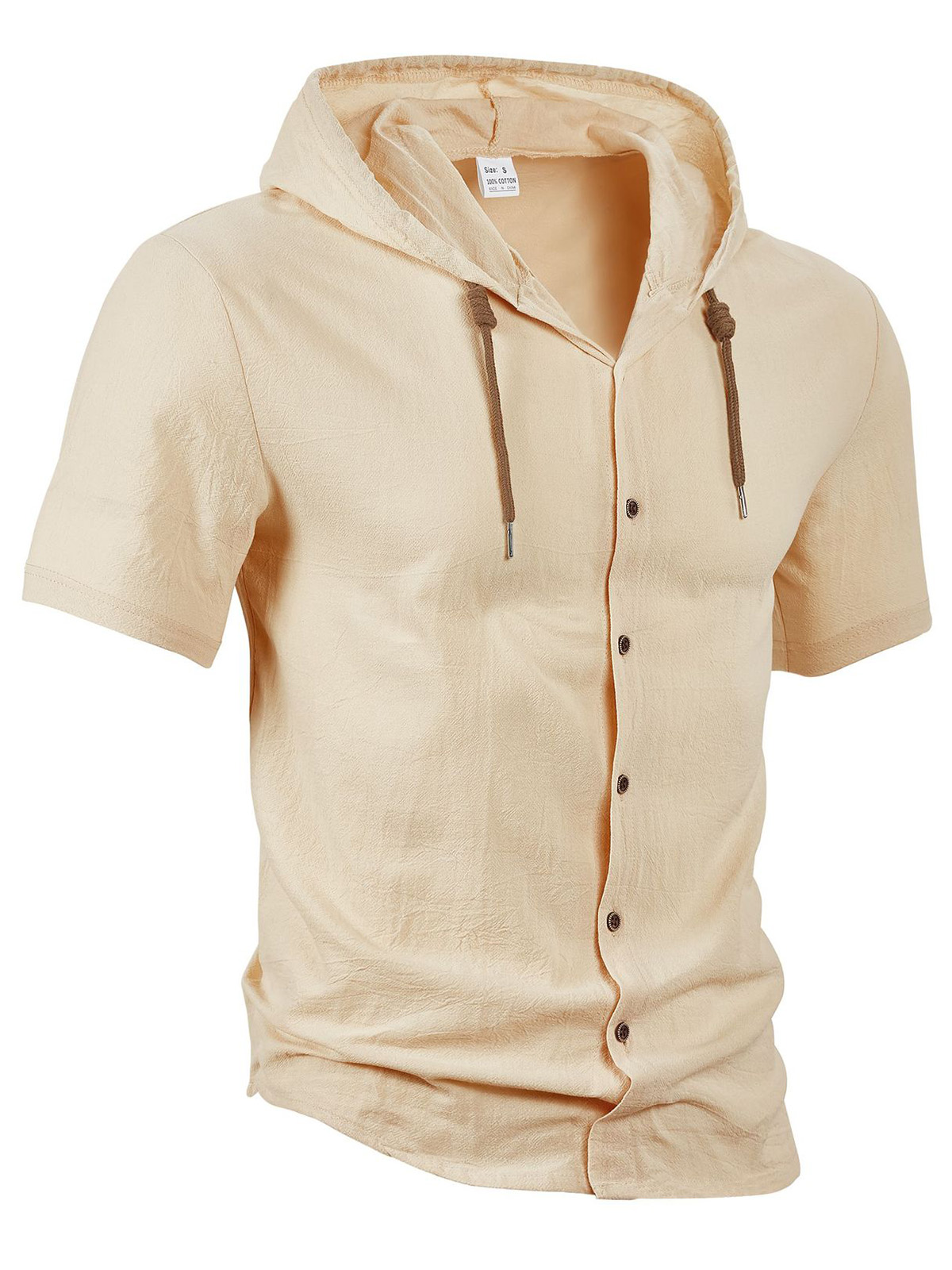 Men's Casual Solid Linen Short Sleeve Hooded Shirt