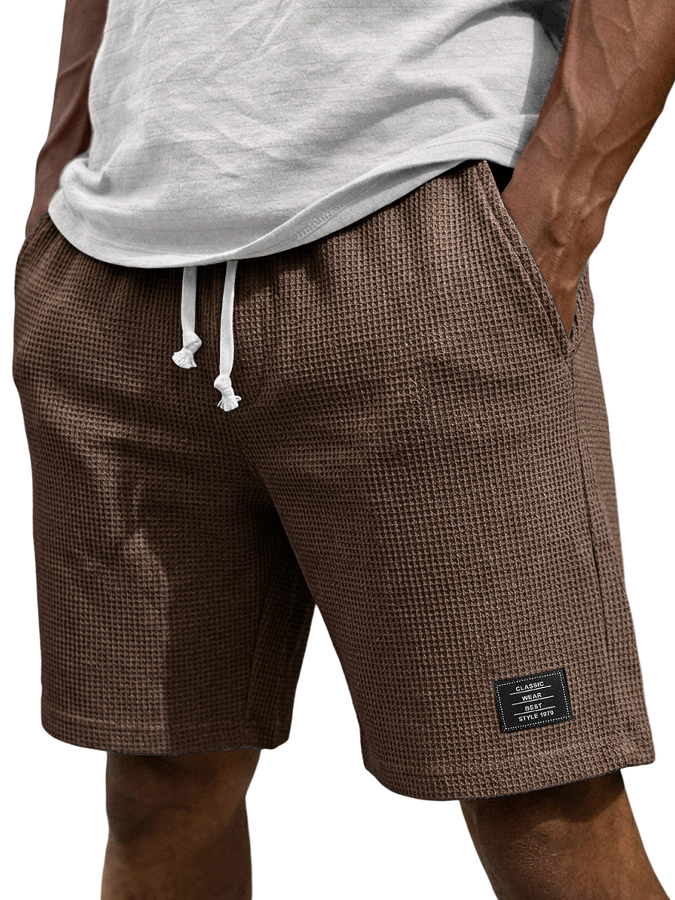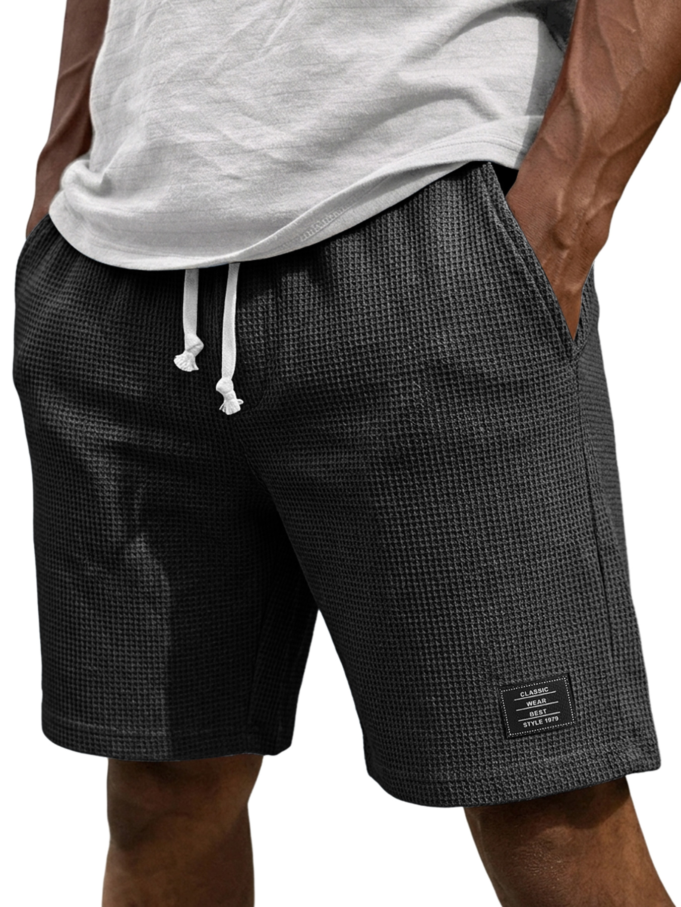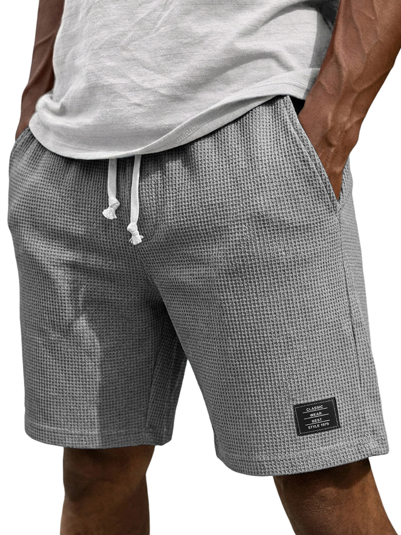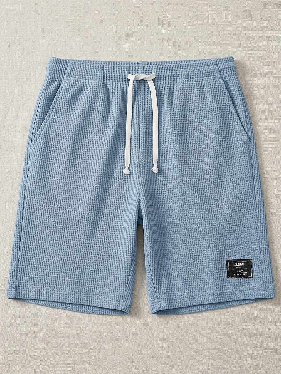 Men's Casual Waffle Embroidered Logo Elastic Waist Loose Shorts
