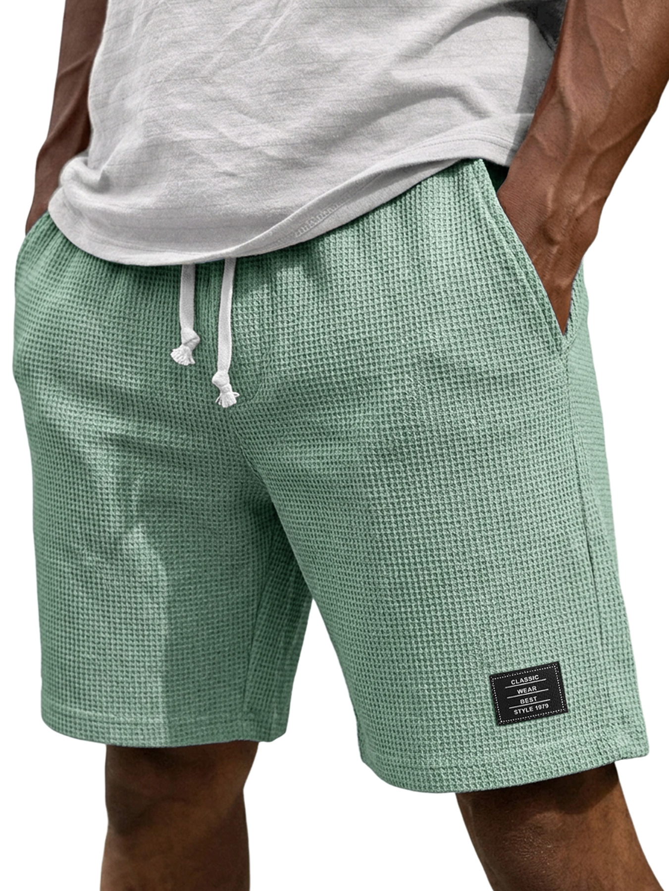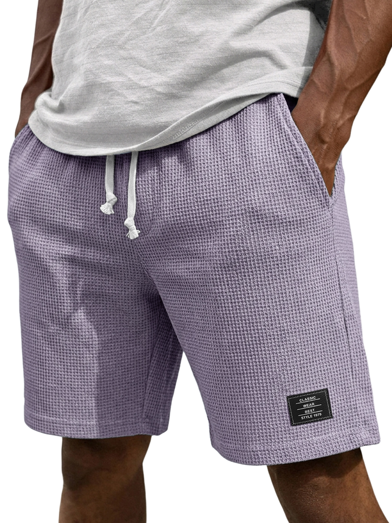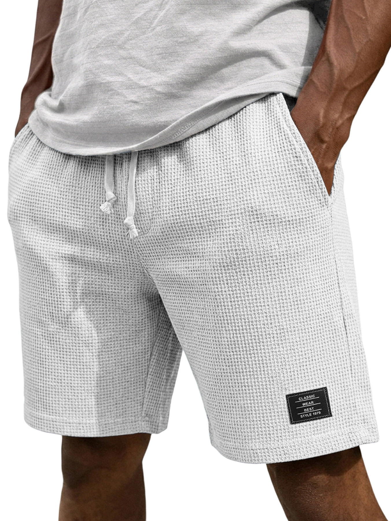Men's Casual Waffle Embroidered Logo Elastic Waist Loose Shorts