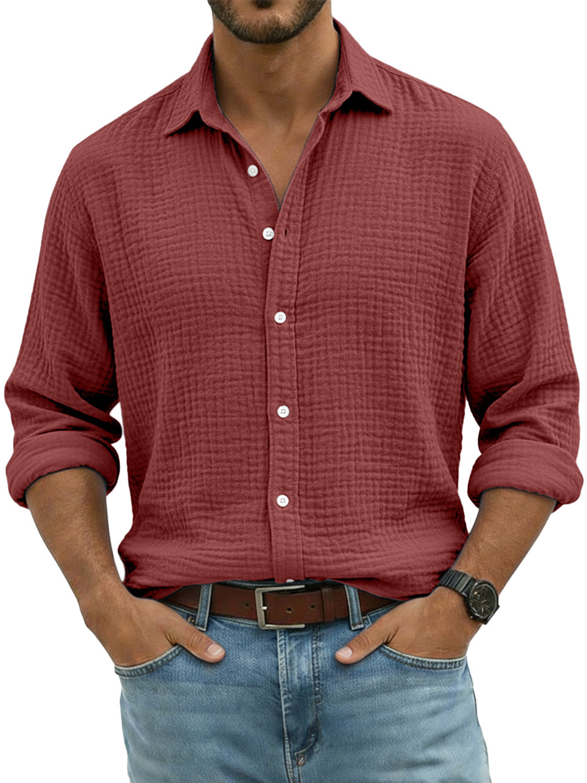 Men's Comfortable Solid Color Crinkled Breathable Long-sleeved Shirt