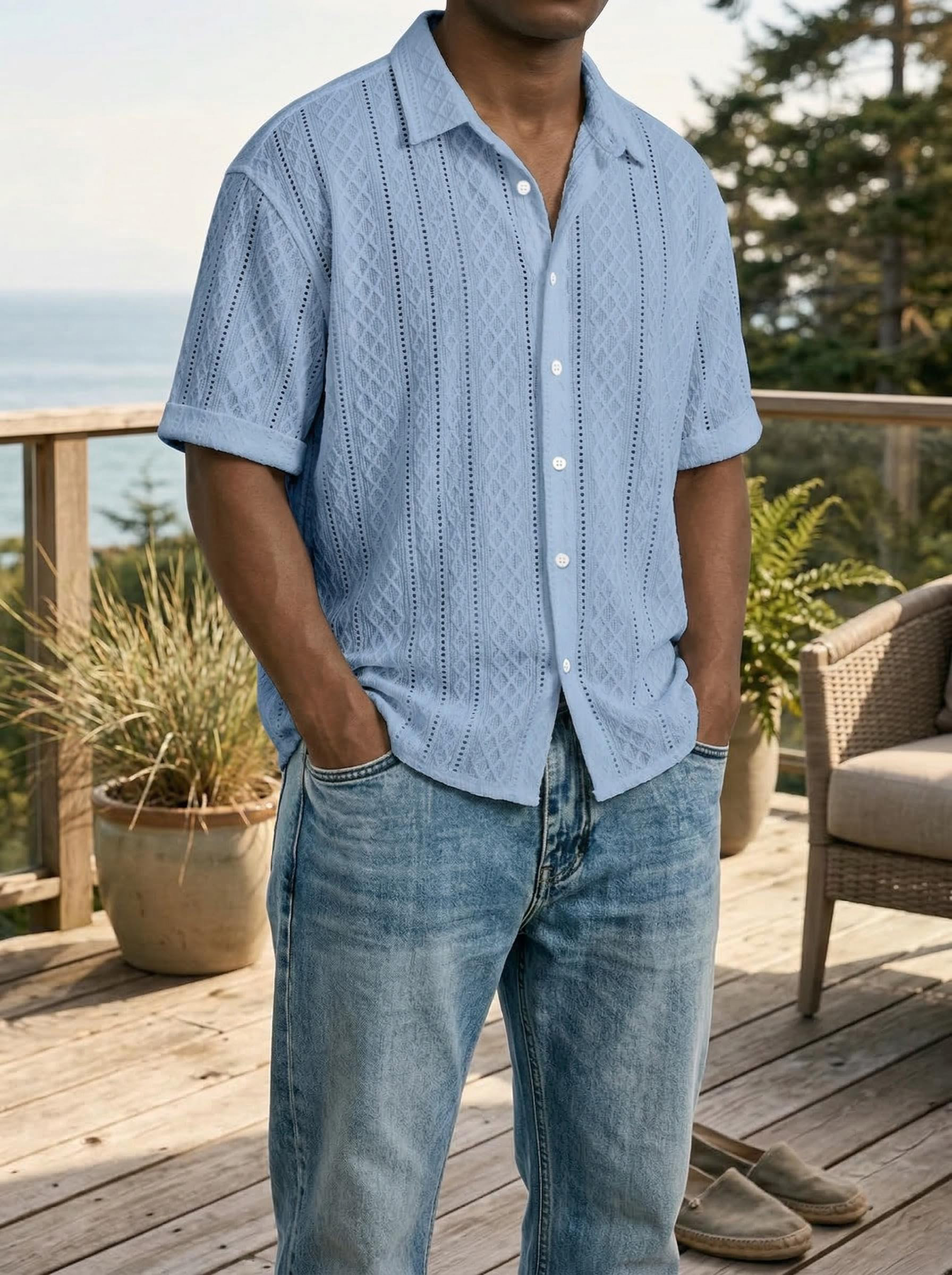 Men's Daily Casual Solid Color Textured Lapel Short-sleeved Shirt