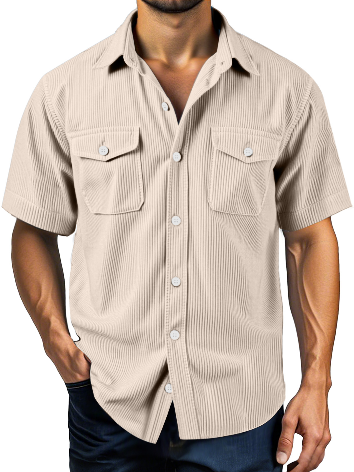 Men's Daily Casual Vertical Striped Double Pocket Short-sleeved Shirt