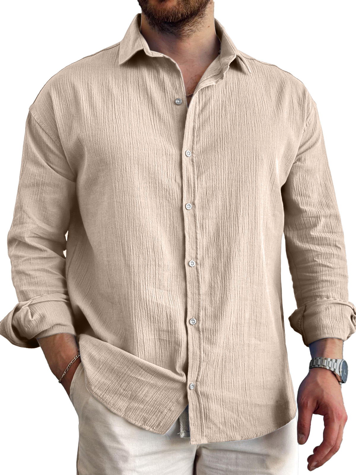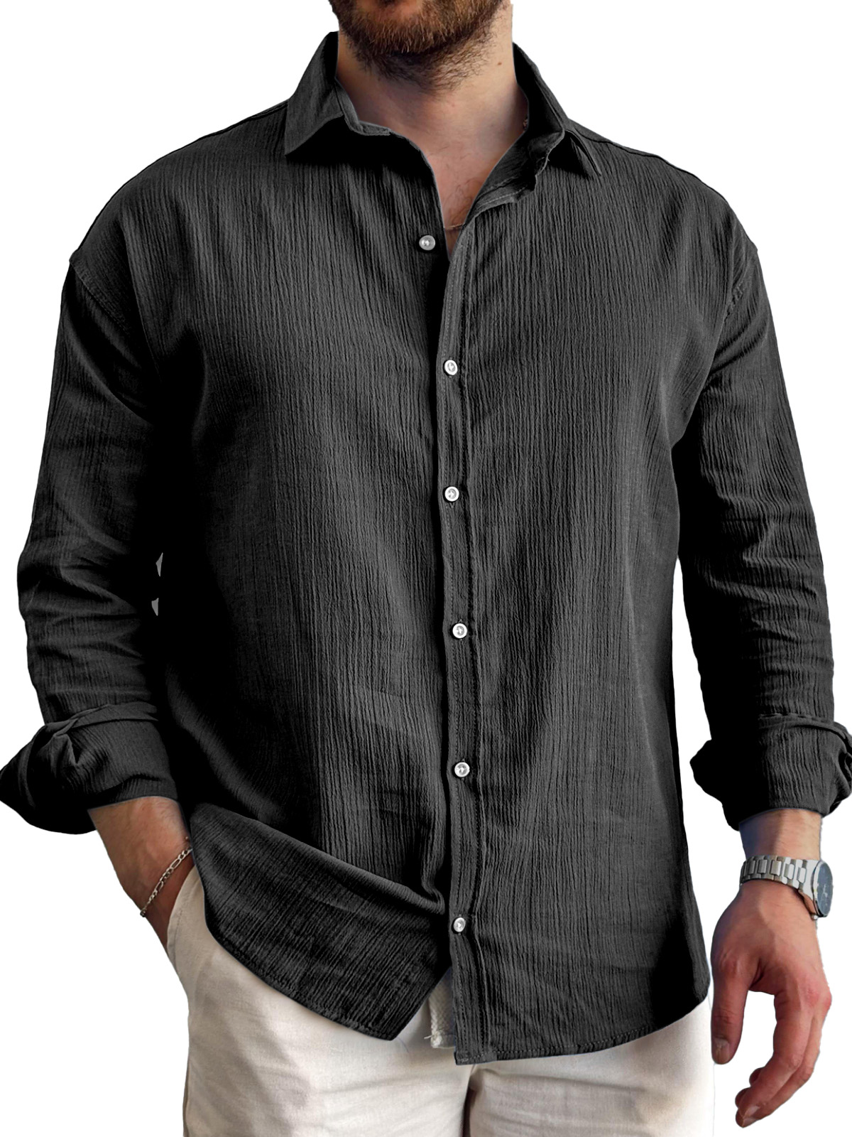 Men's Daily Simple Pleated Textured Lapel Long-sleeved Shirt