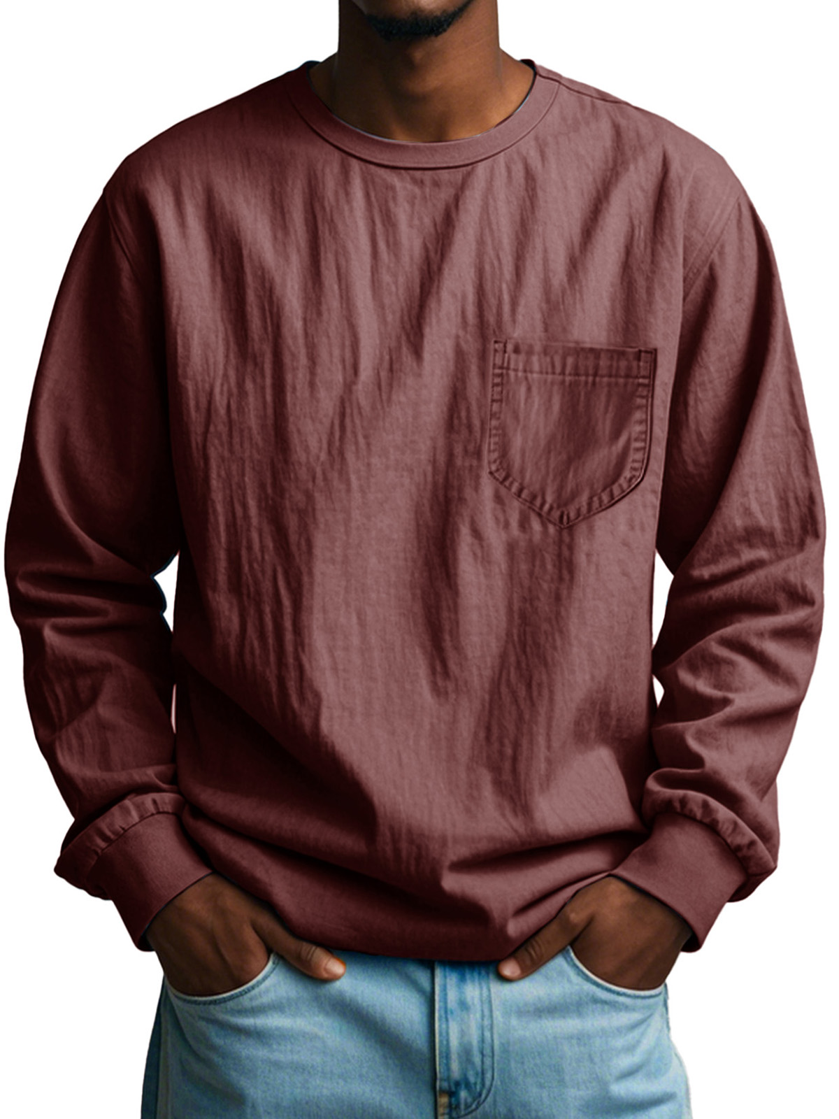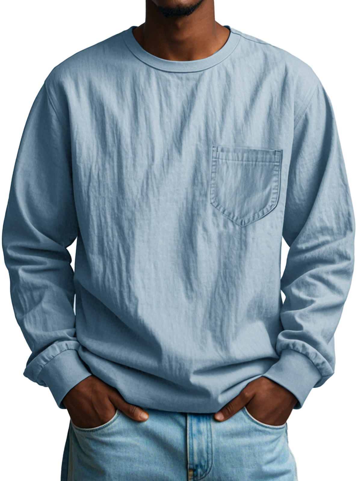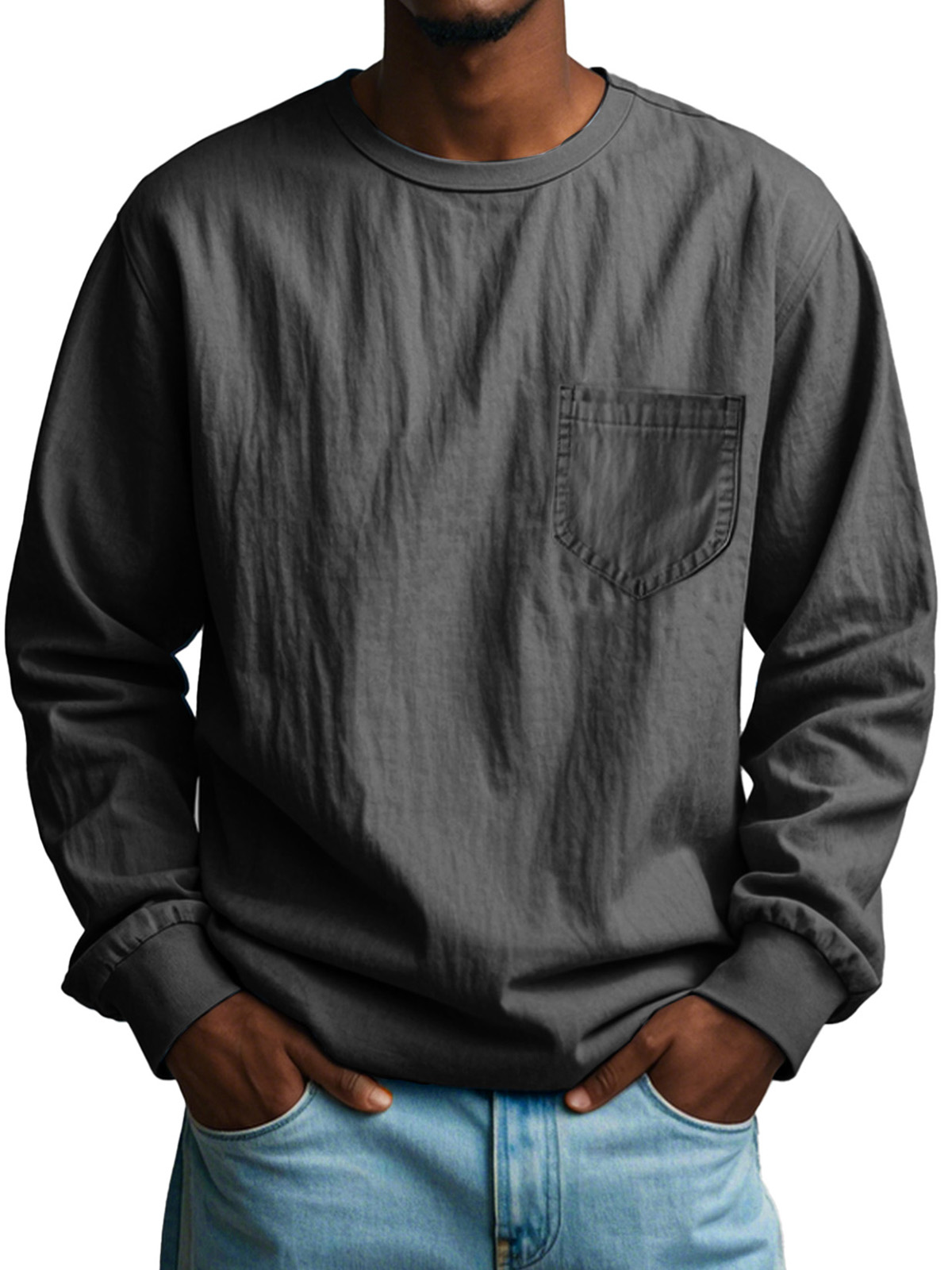 Men's Fashion Casual Pleated Round Neck Long Sleeve Pocket T-Shirt