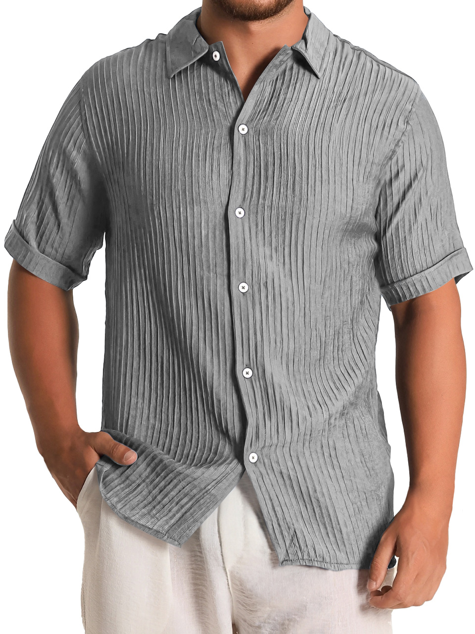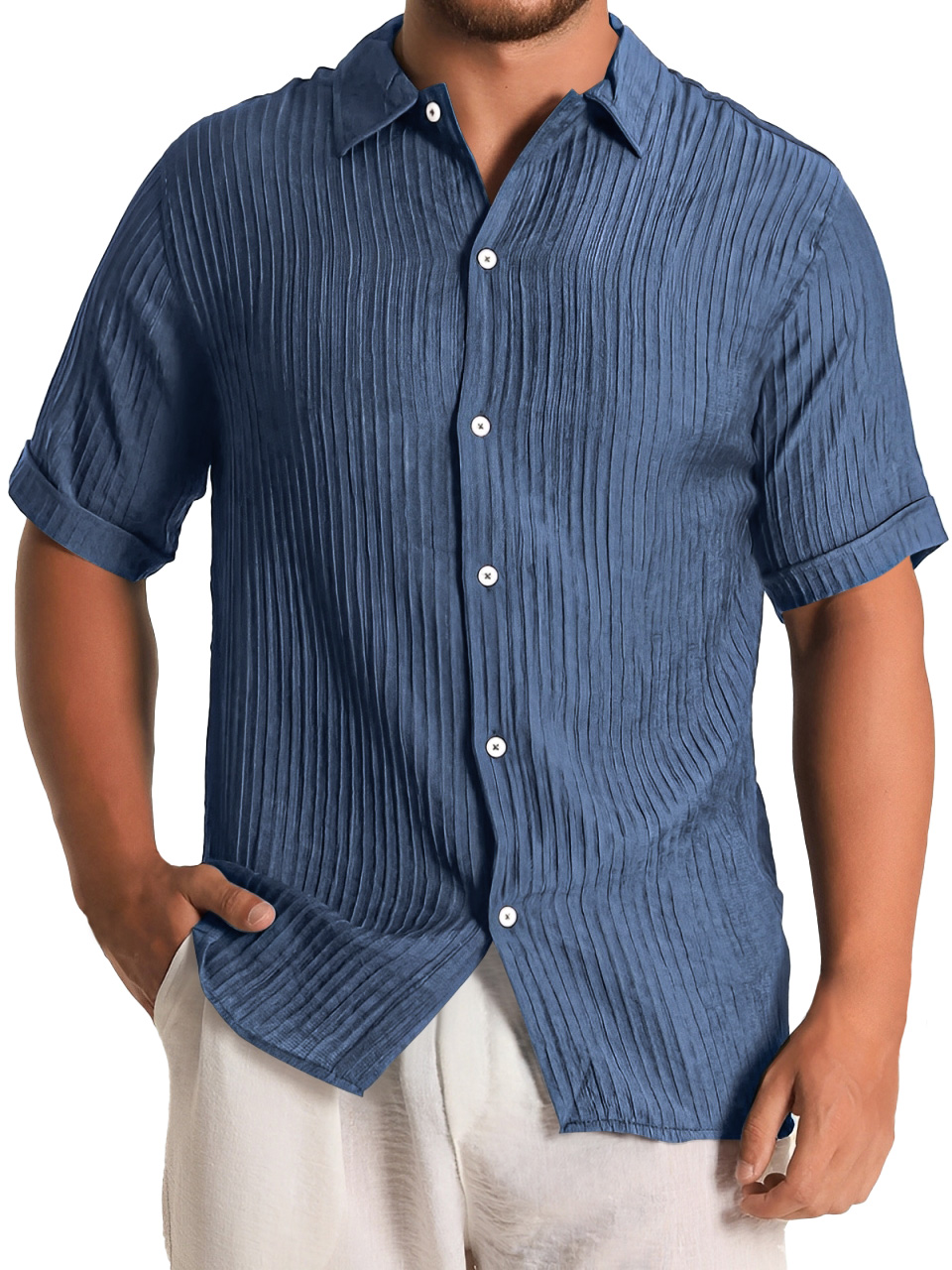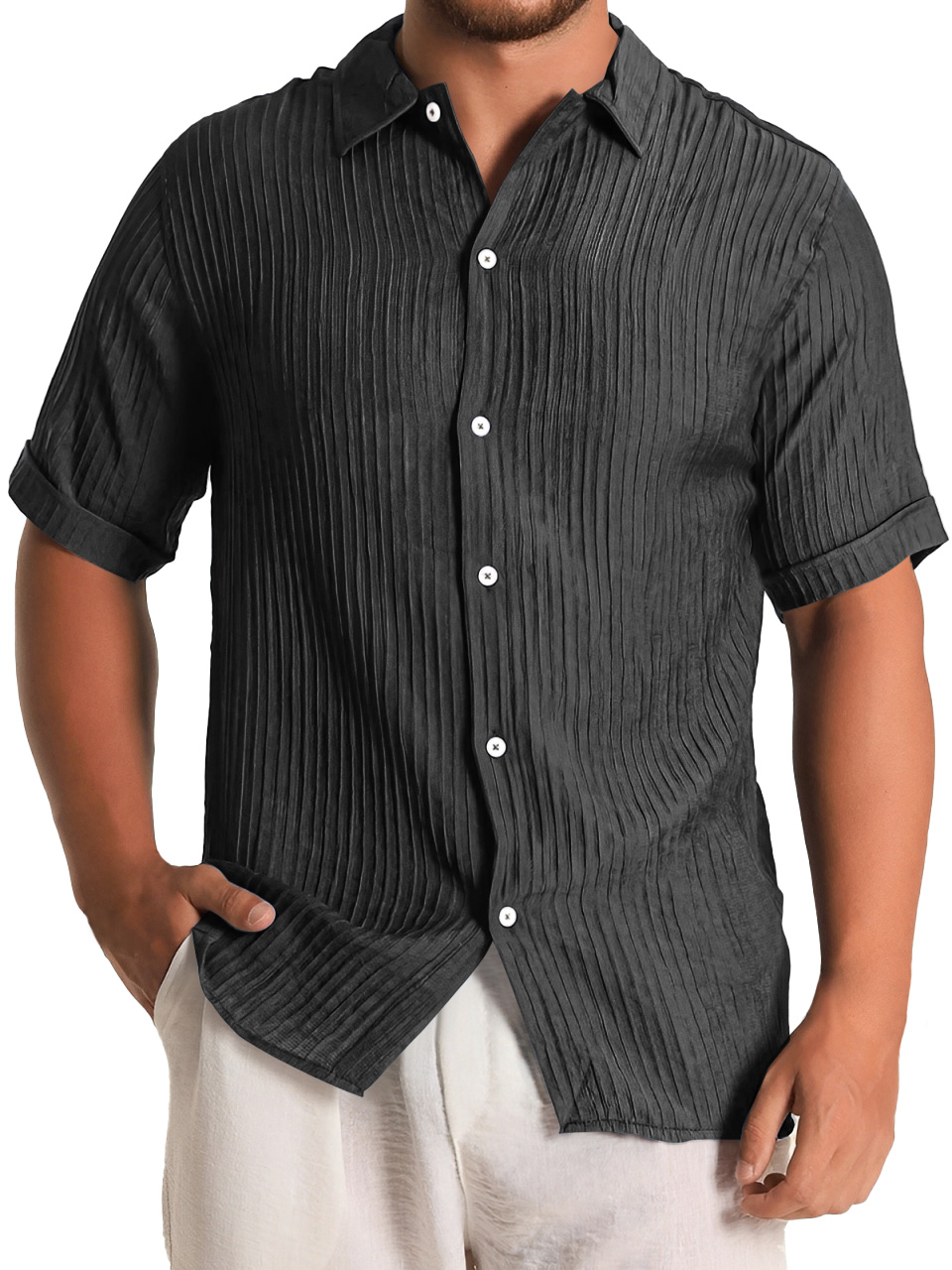 Men's Fashion Daily Pleated Casual Solid Color Short Sleeve Shirt