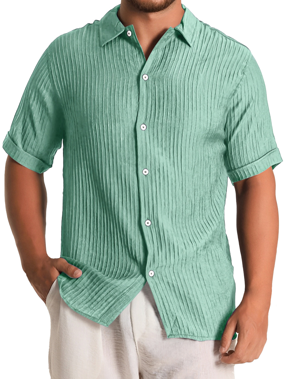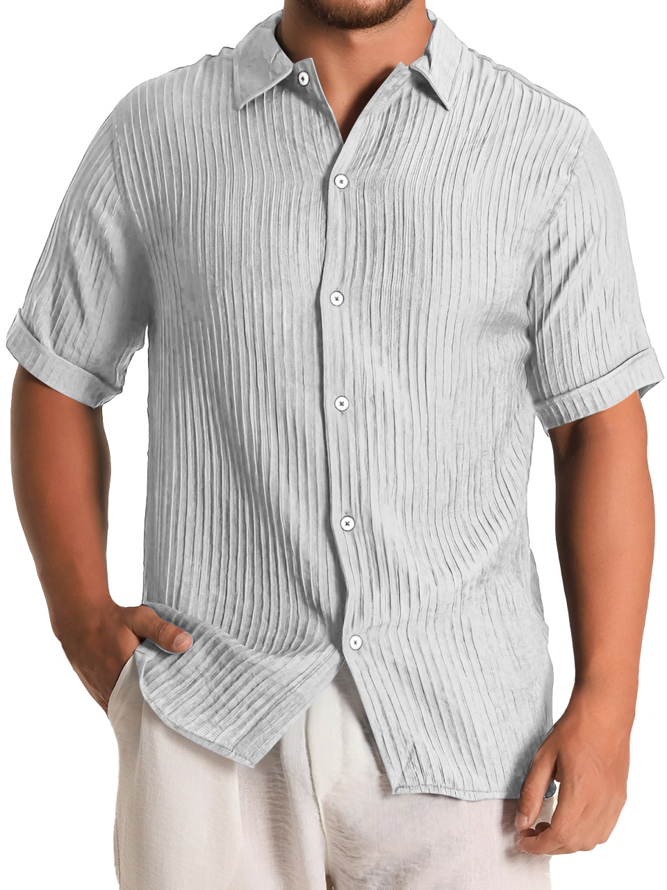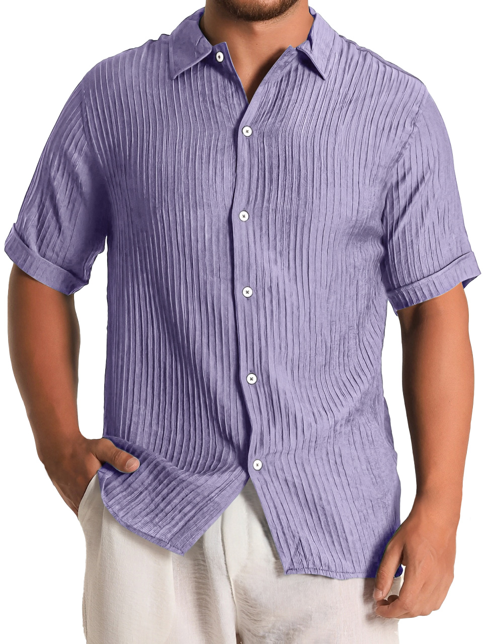 Men's Fashion Daily Pleated Casual Solid Color Short Sleeve Shirt