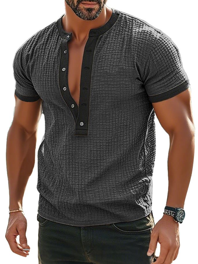 Men's Fashion Retro Textured Fabric Short-sleeved Henley Shirt