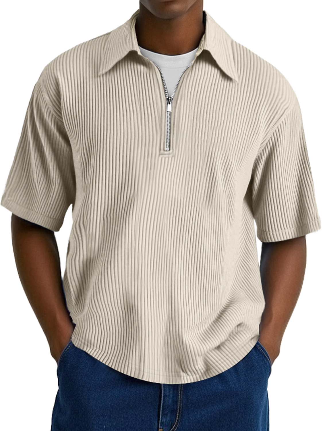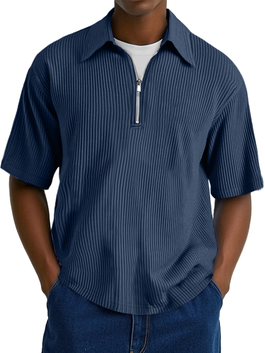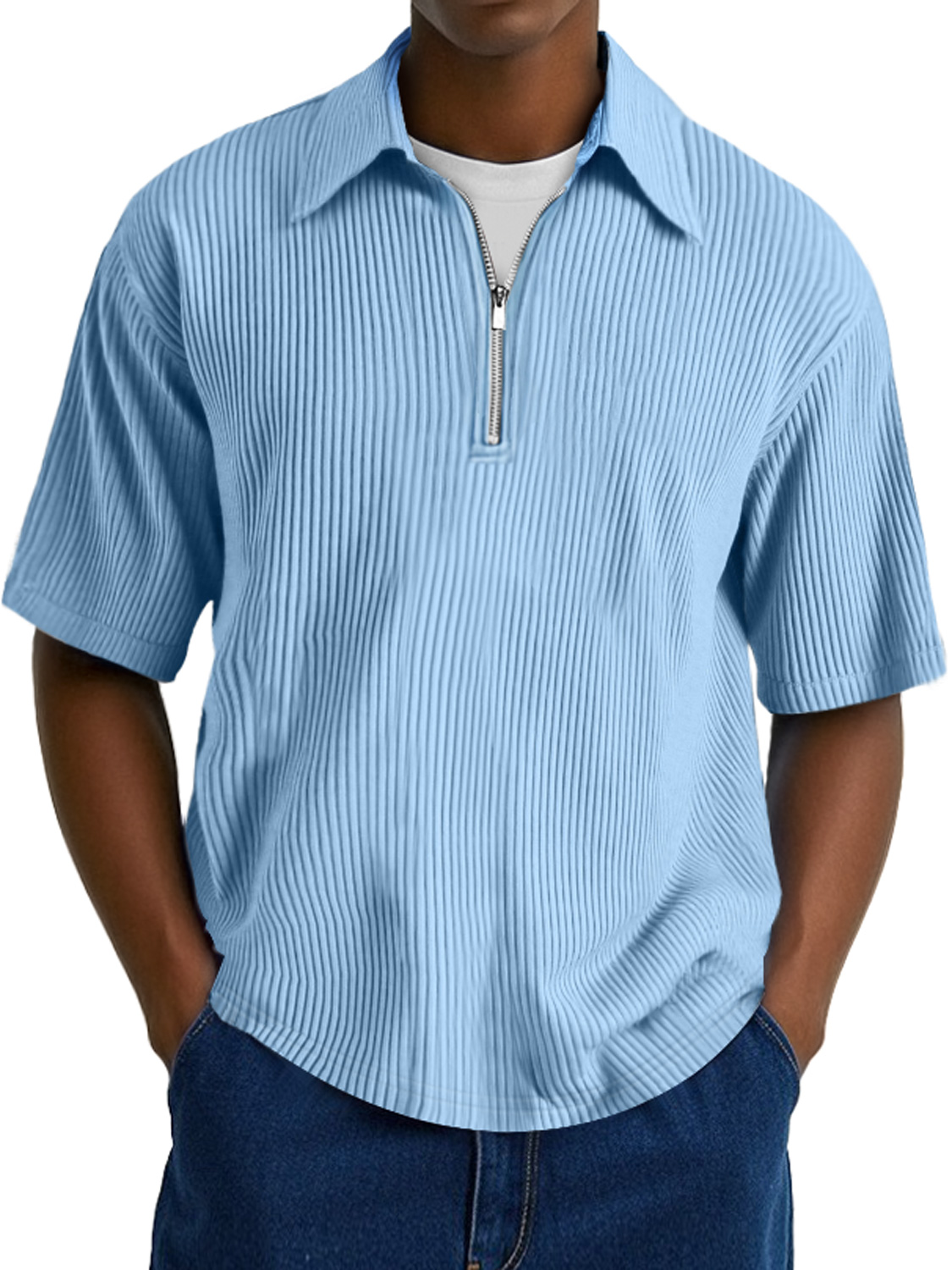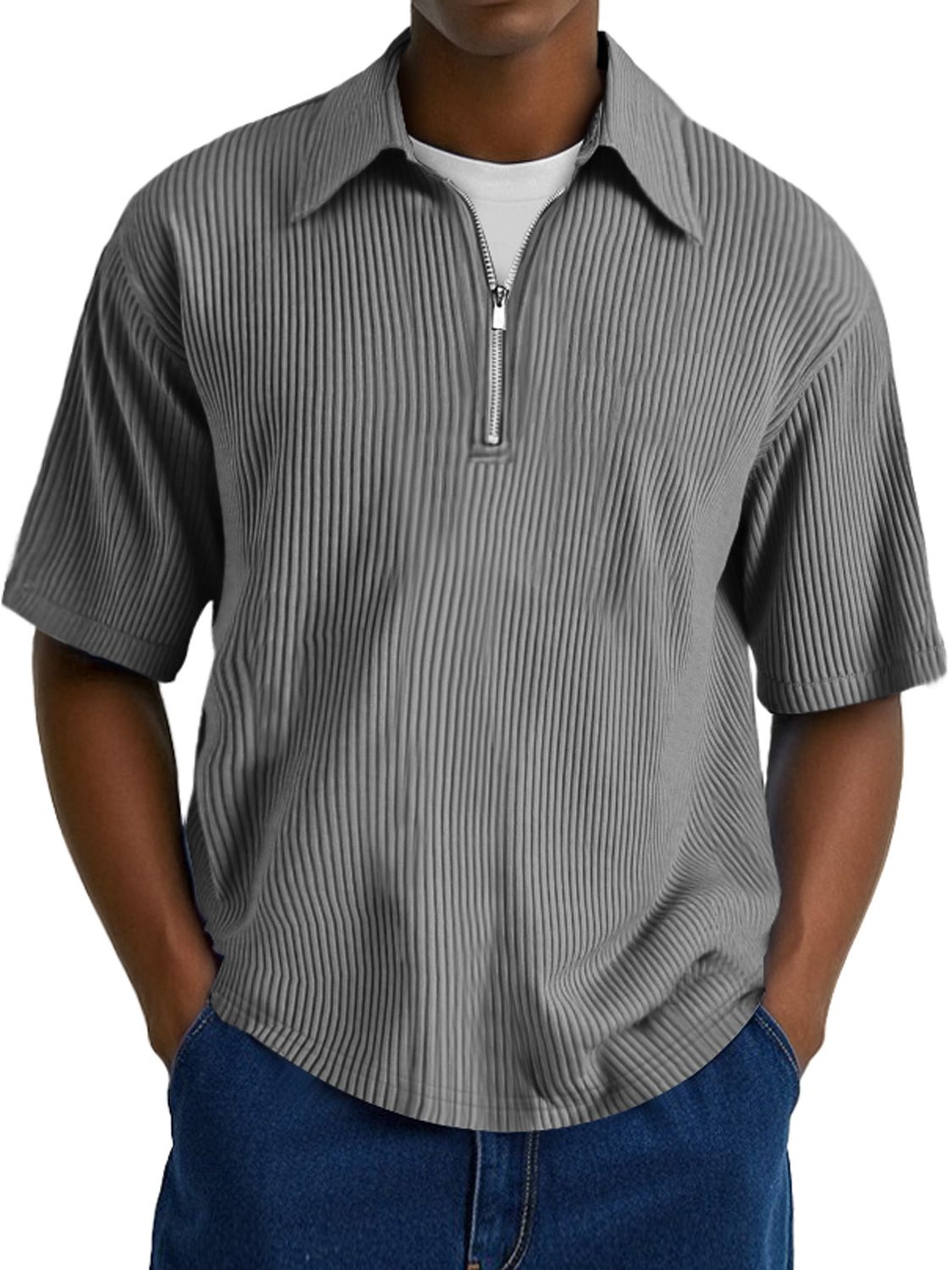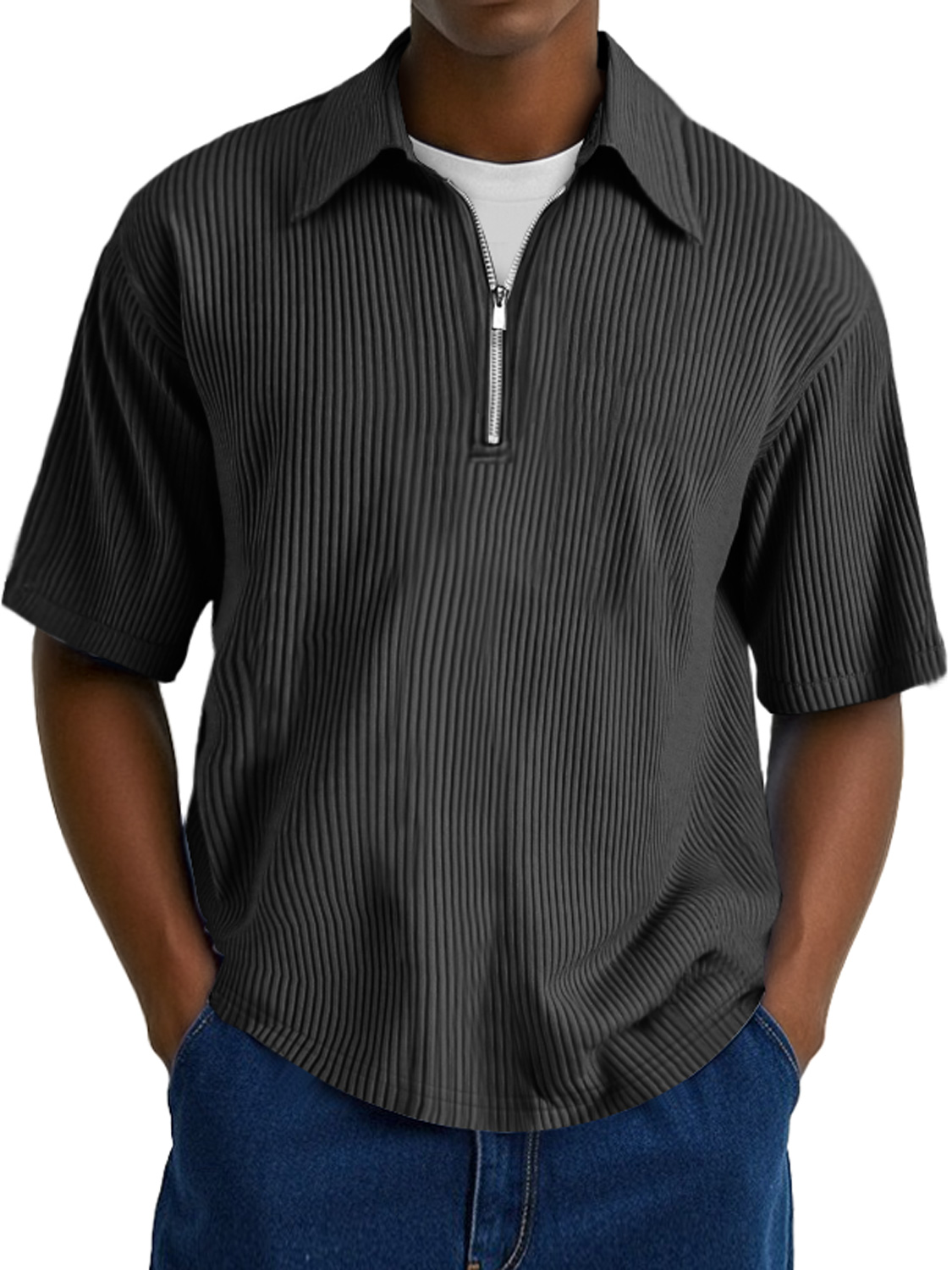 Men's Fashion Ribbed Texture Lapel Zipper Casual Comfort Short Sleeve POLO Shirt