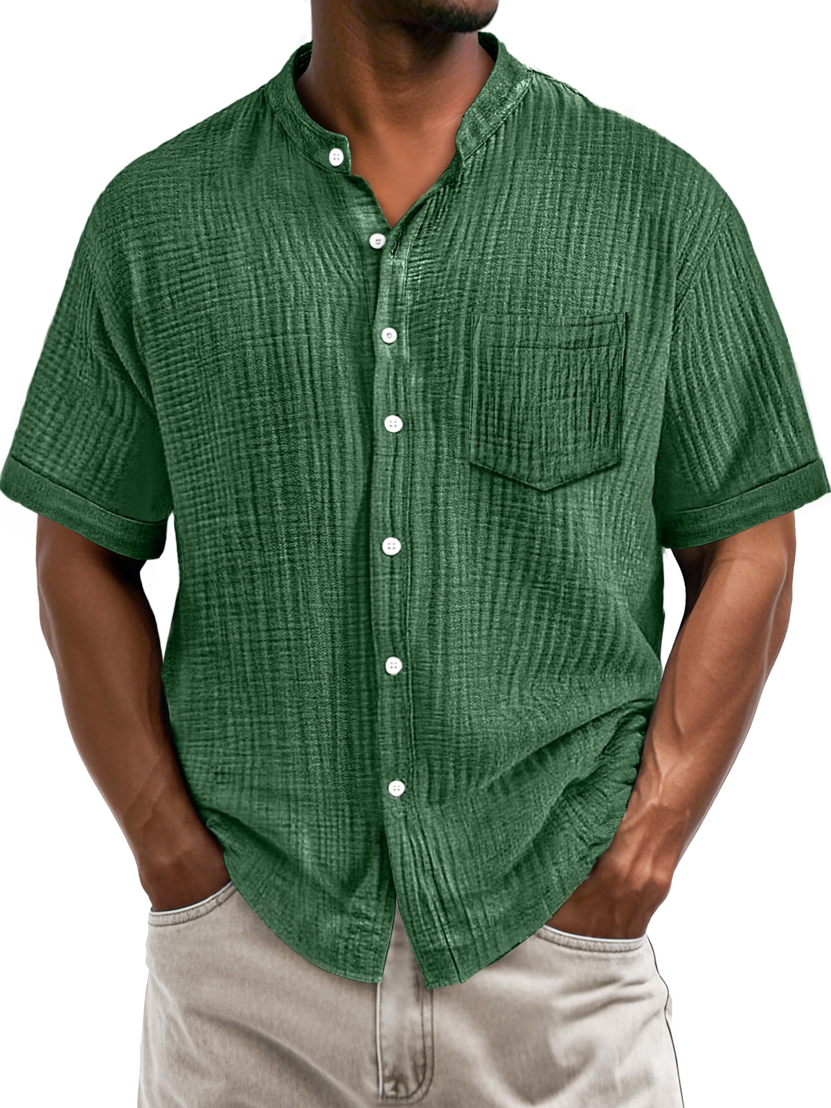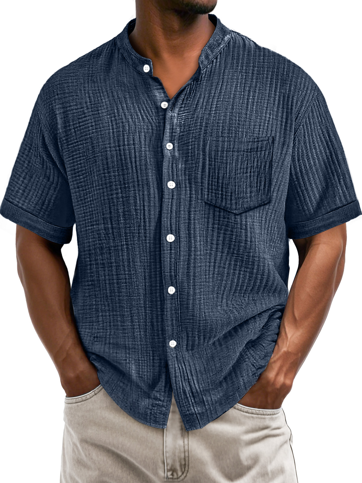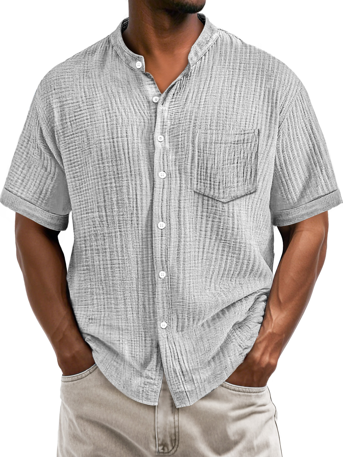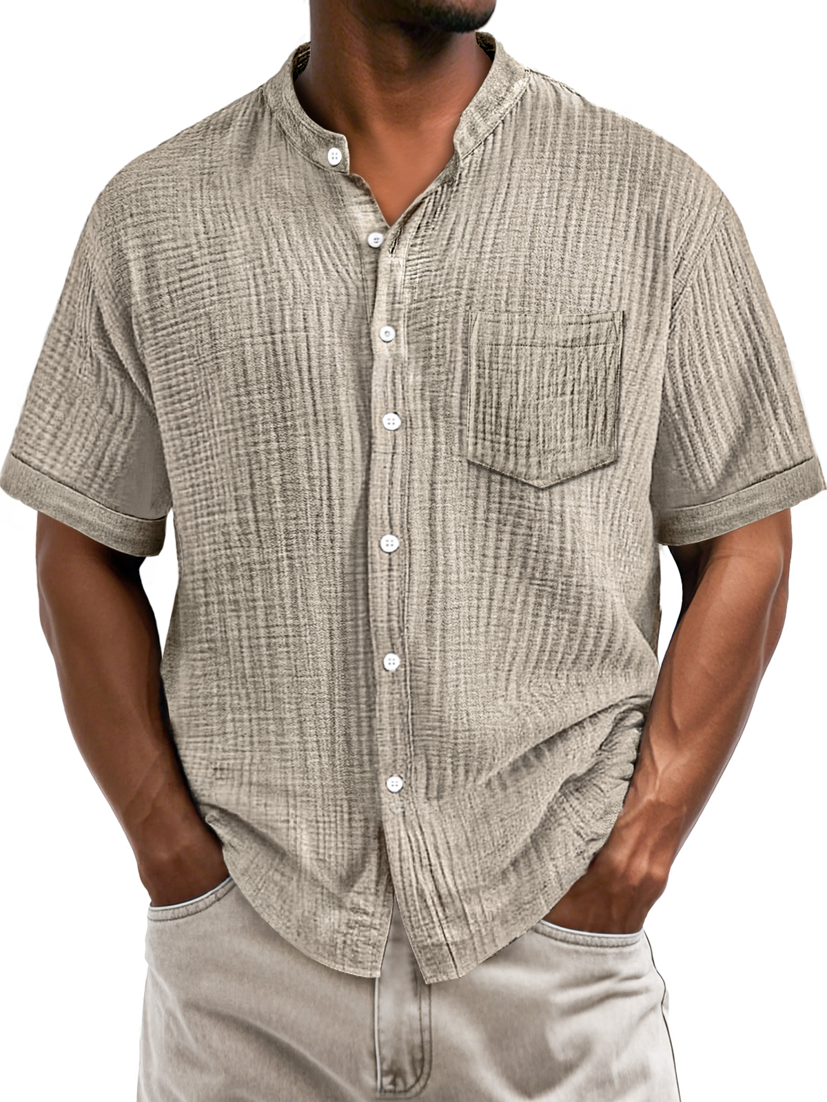 Men's Fashion Stand Collar Pleated Pocket Casual Short Sleeve Shirt