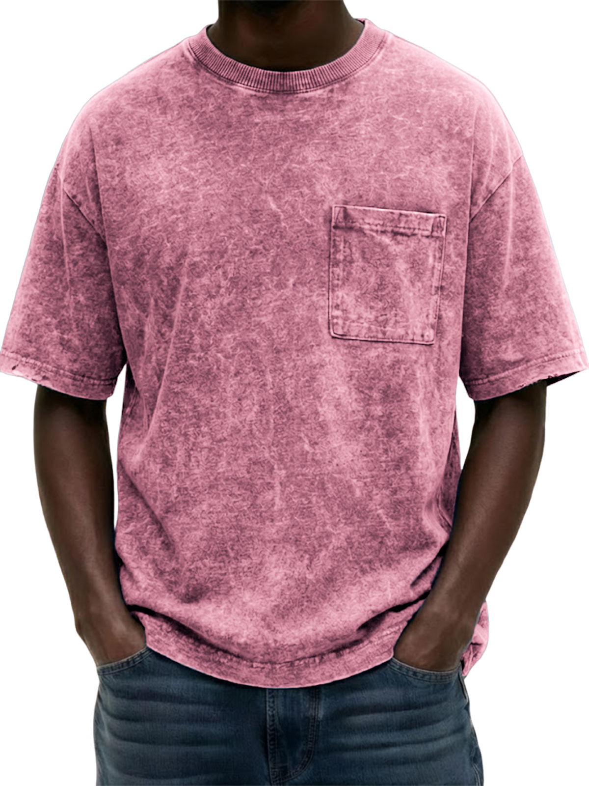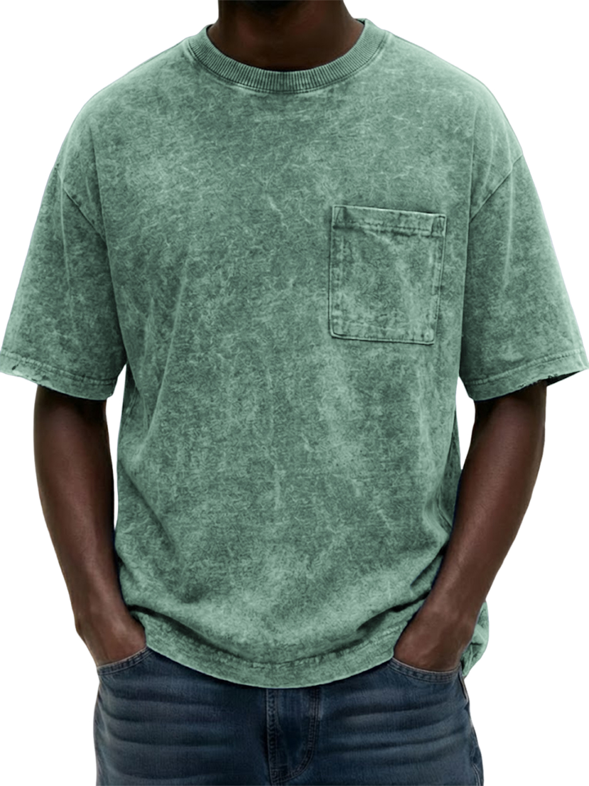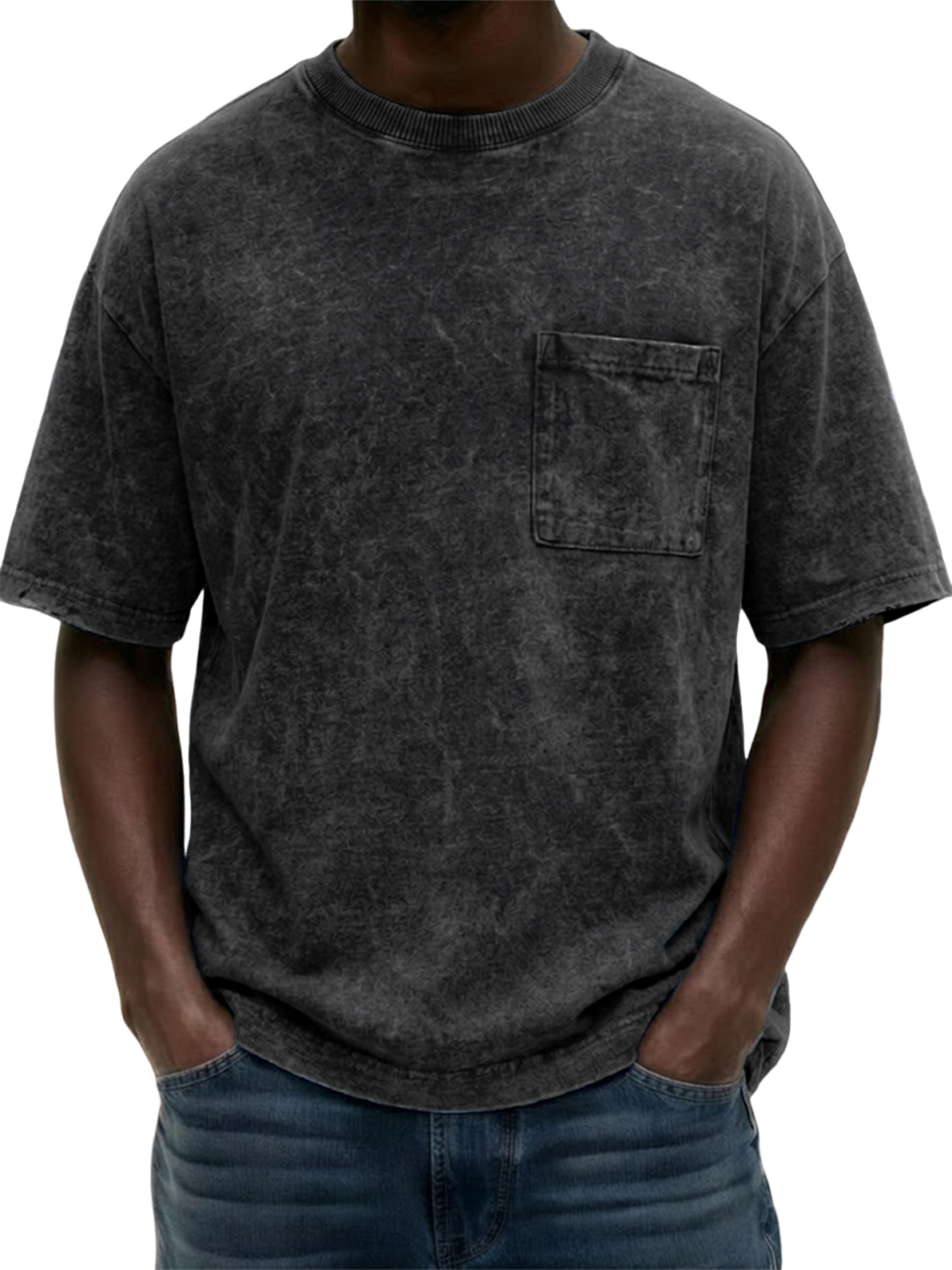 Men's Heavyweight Pure Cotton Washed Distressed Vintage Short-Sleeve T-Shirt with Chest Pocket