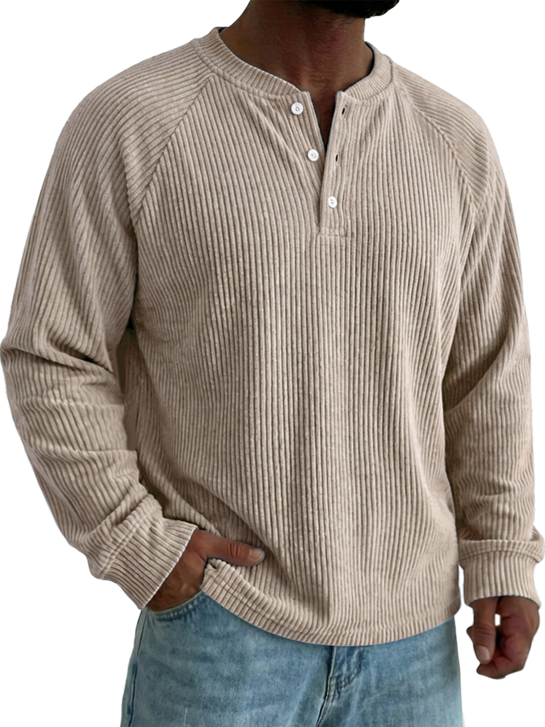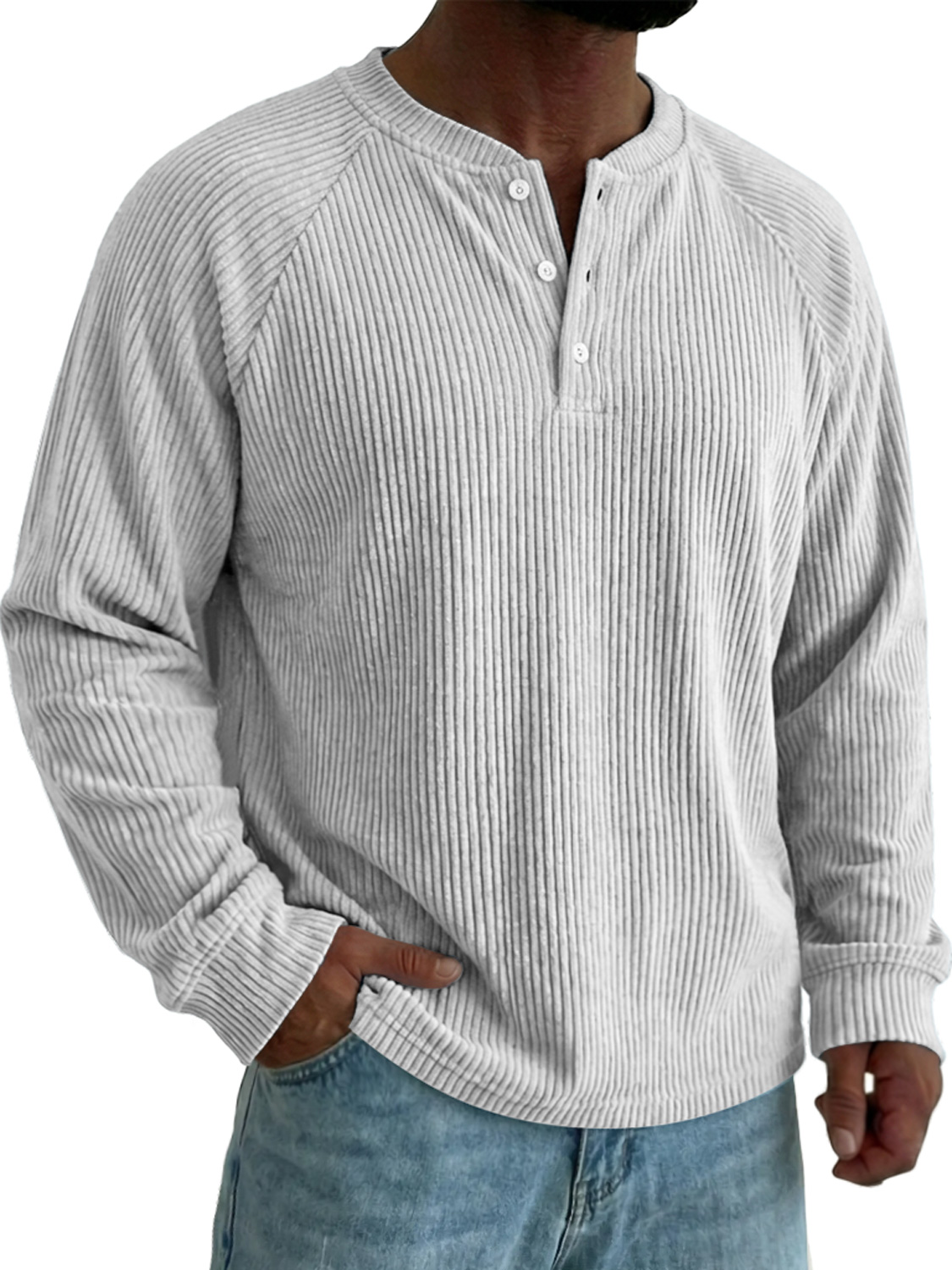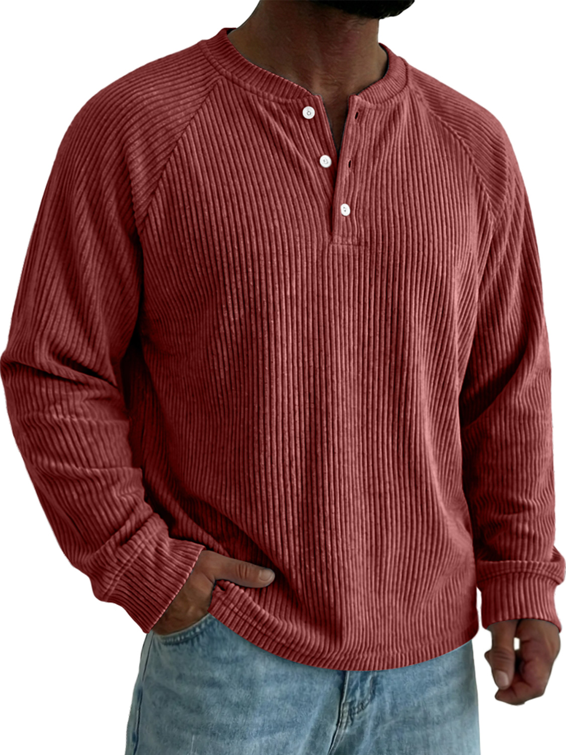 Men's Raglan Sleeve Corduroy Casual Solid Color Long-sleeved Henley Shirt