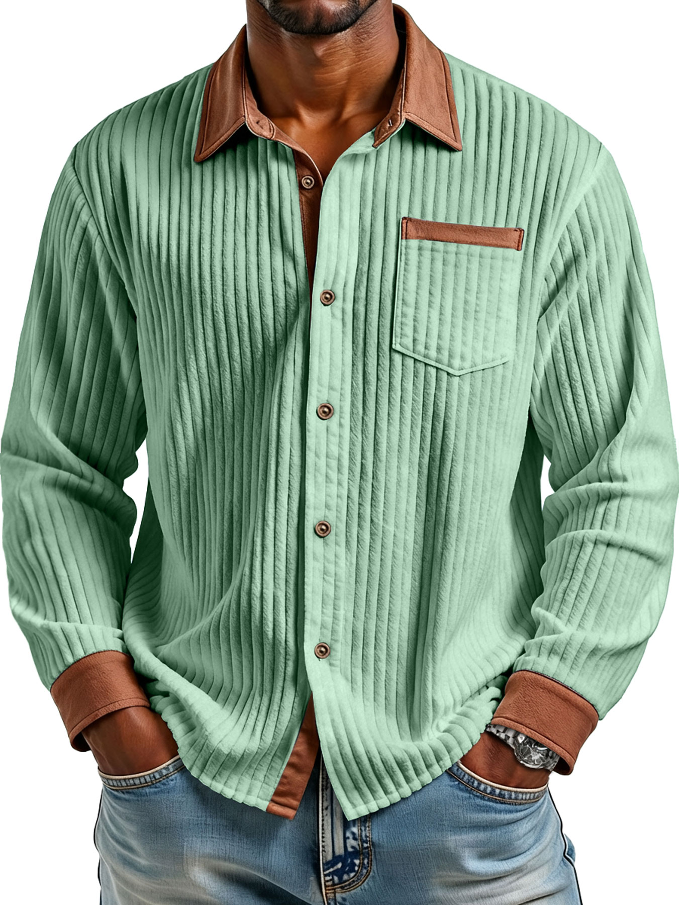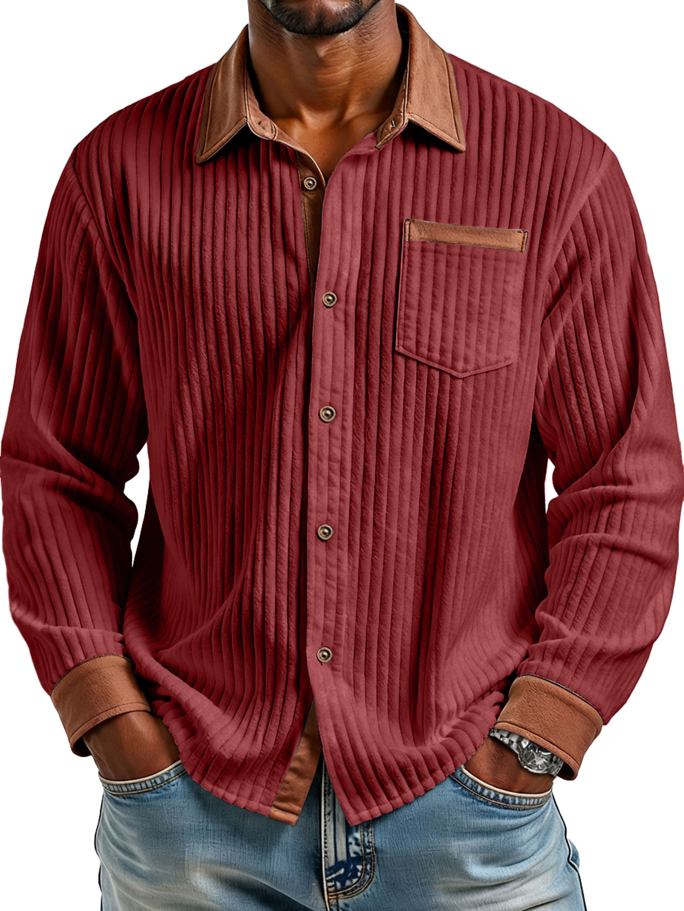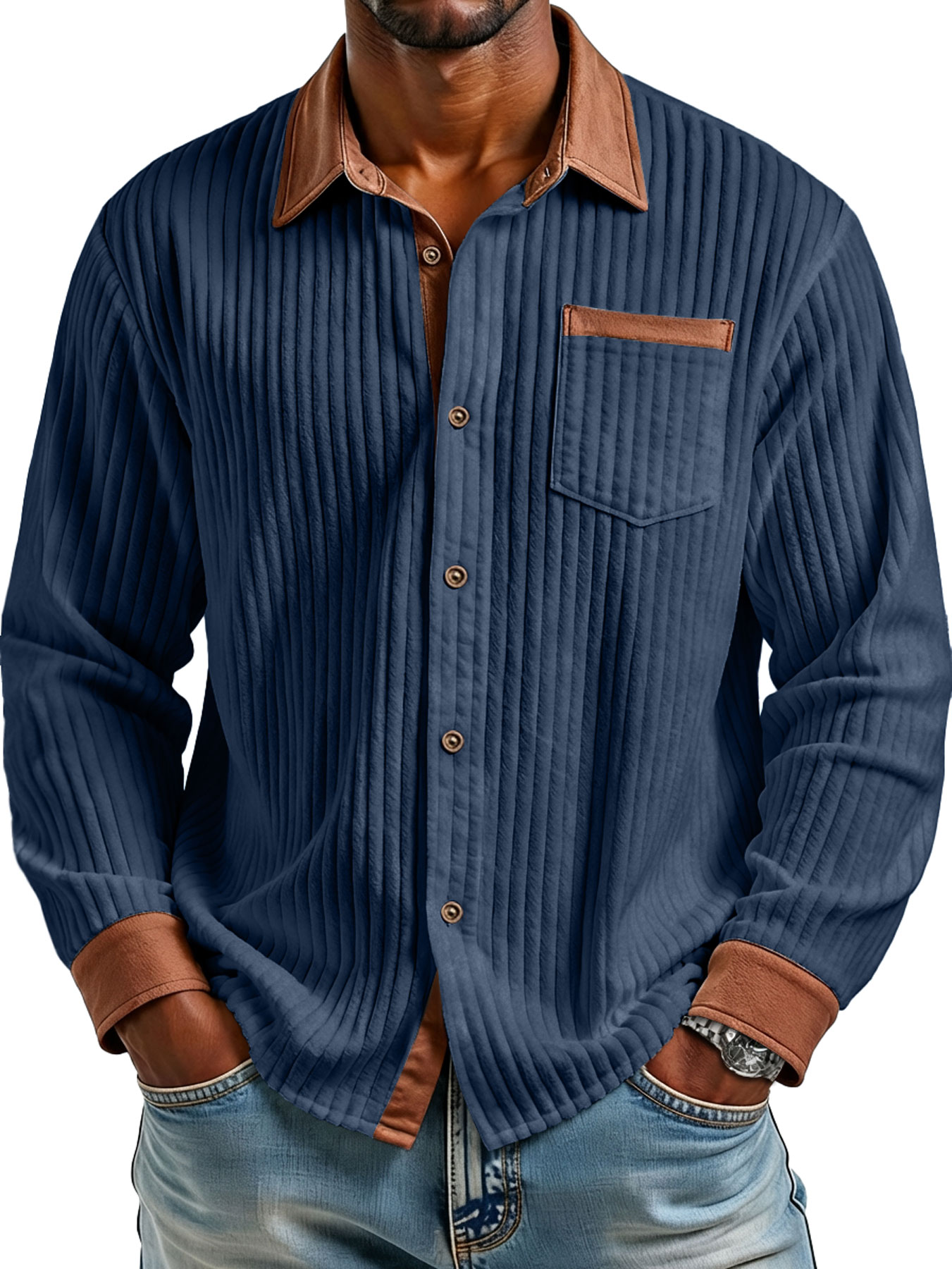 Men's Retro Corduroy Collared Color-Blocked Casual Long-Sleeve Shirt