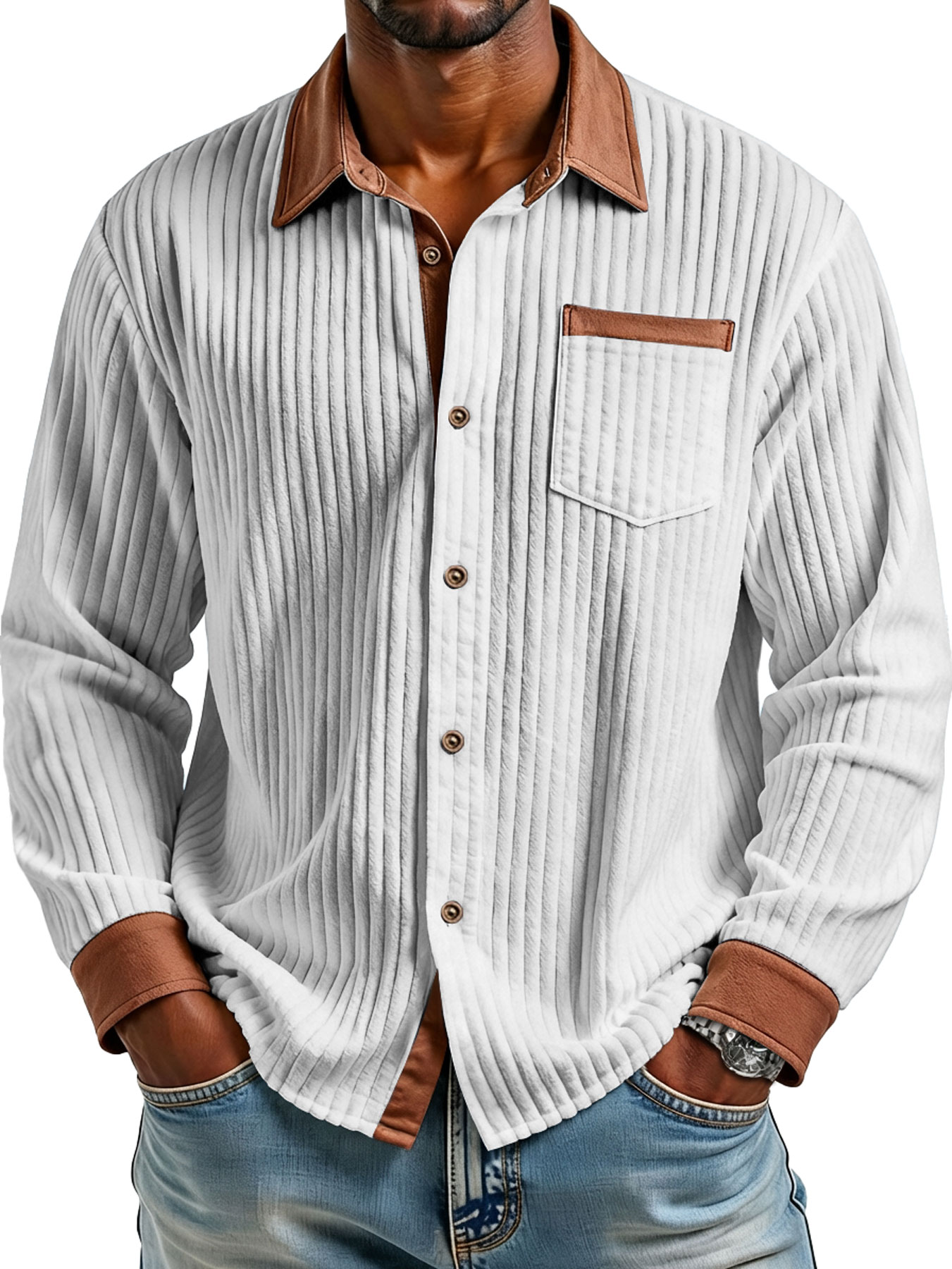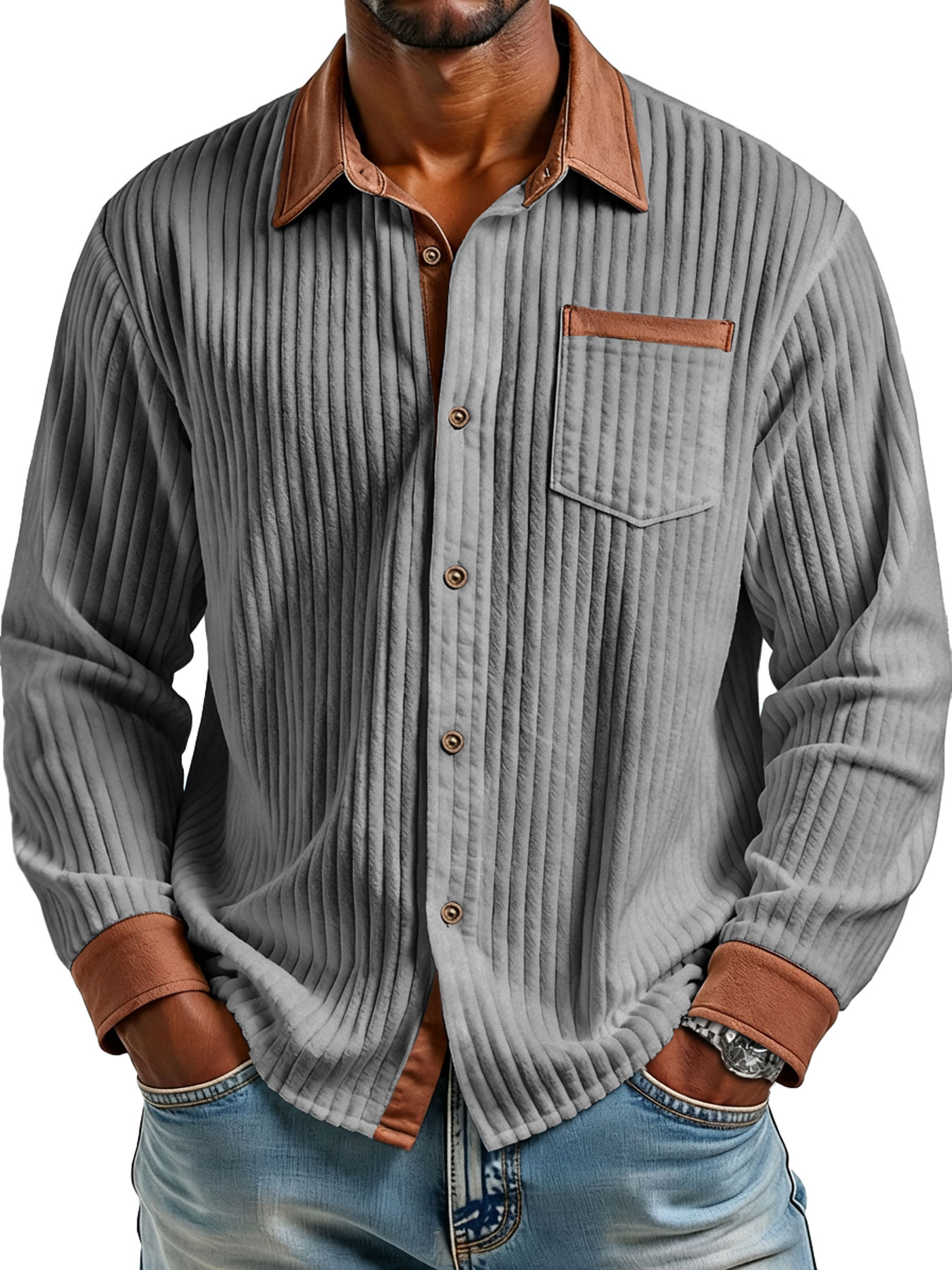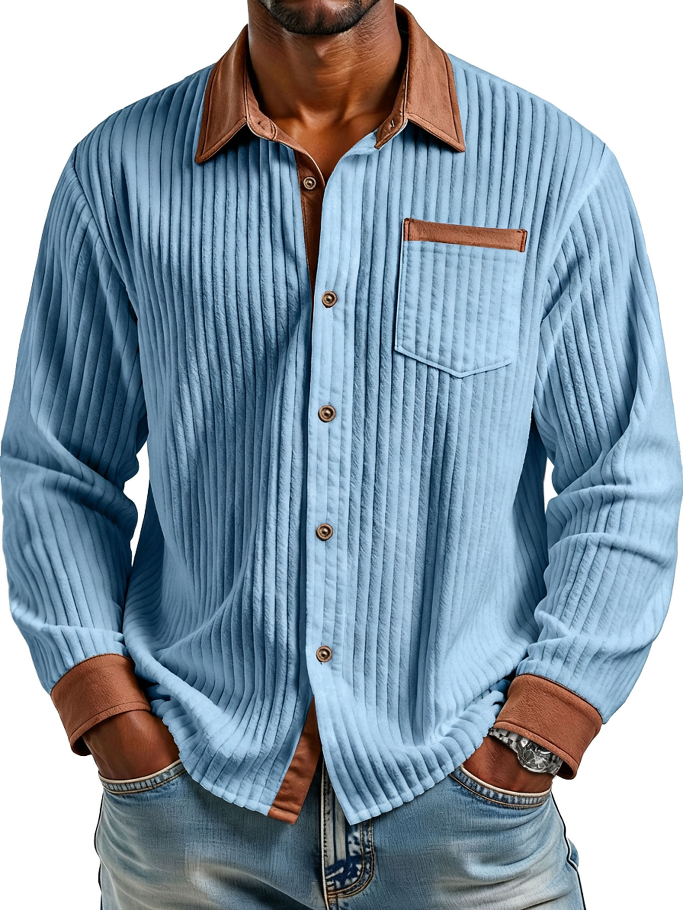 Men's Retro Corduroy Collared Color-Blocked Casual Long-Sleeve Shirt