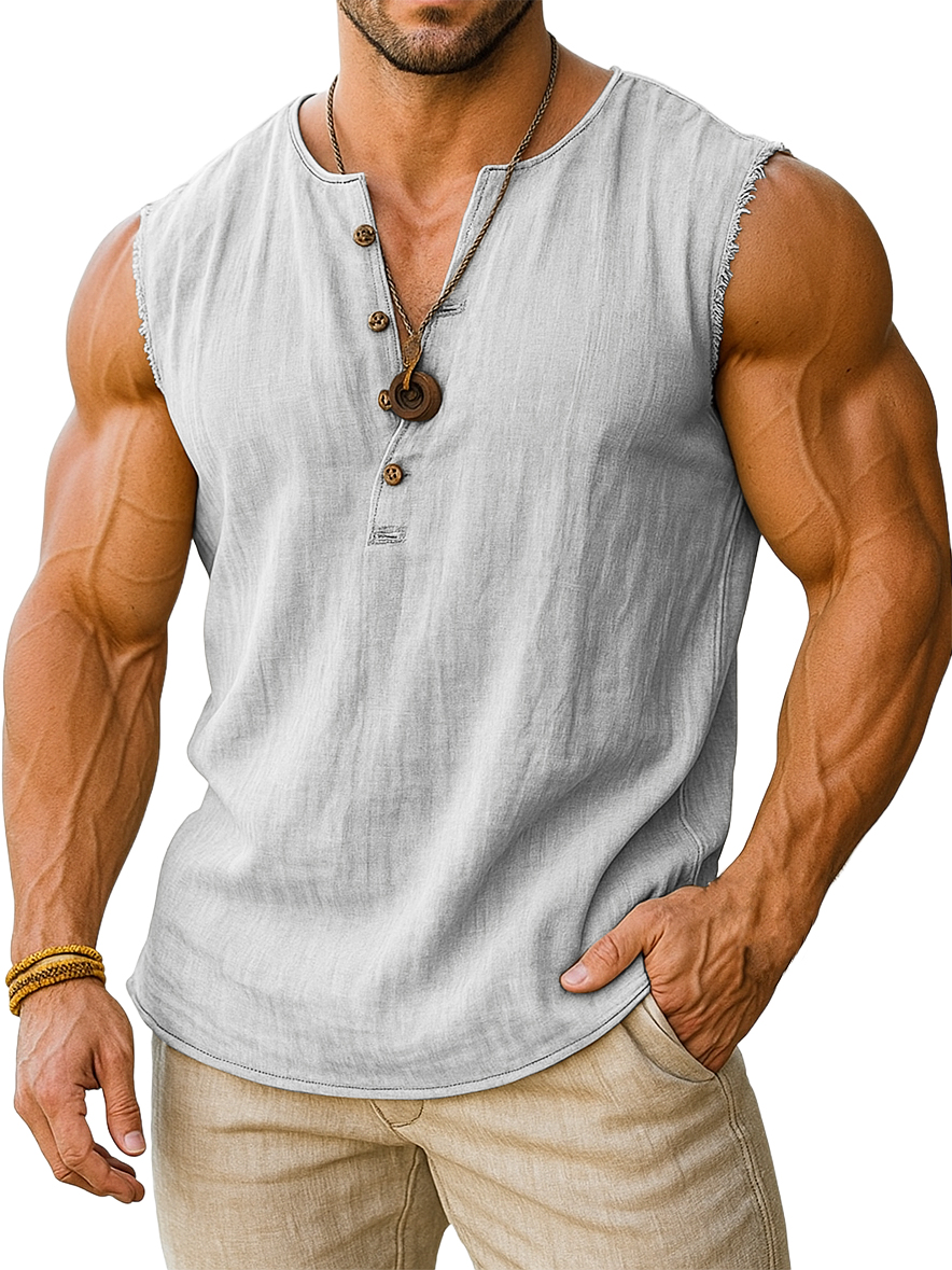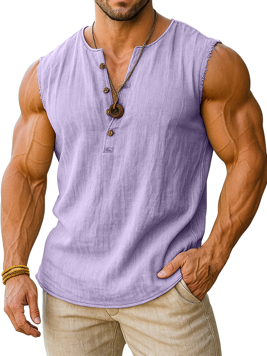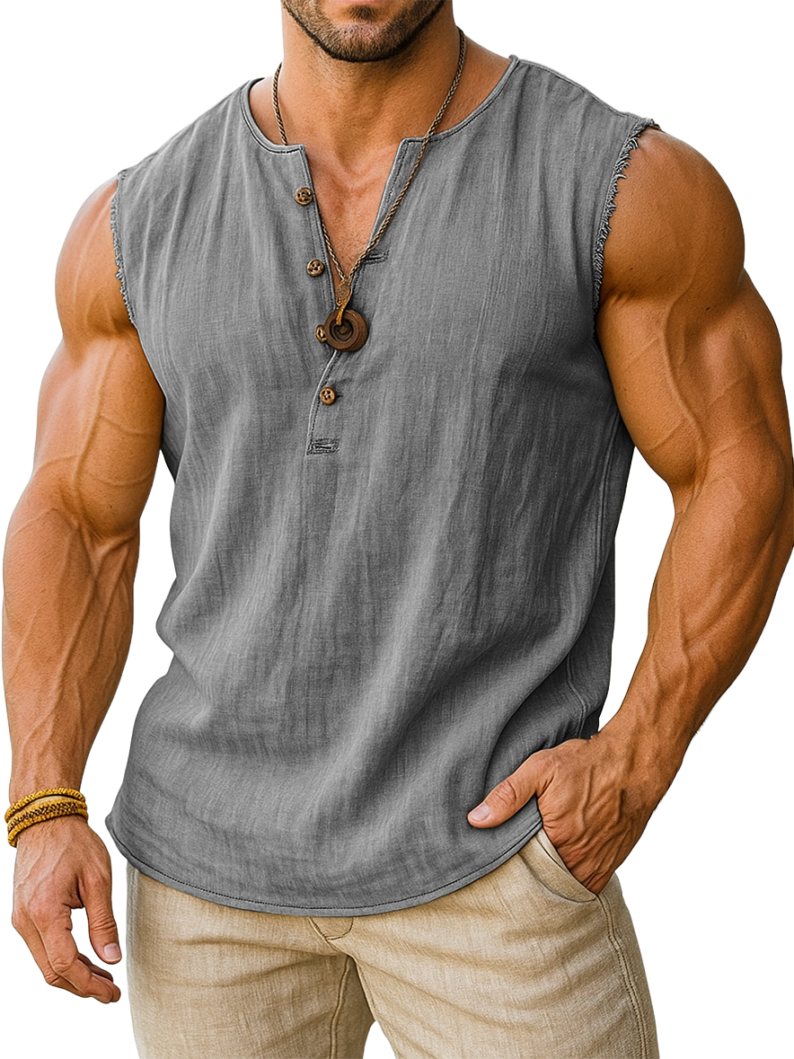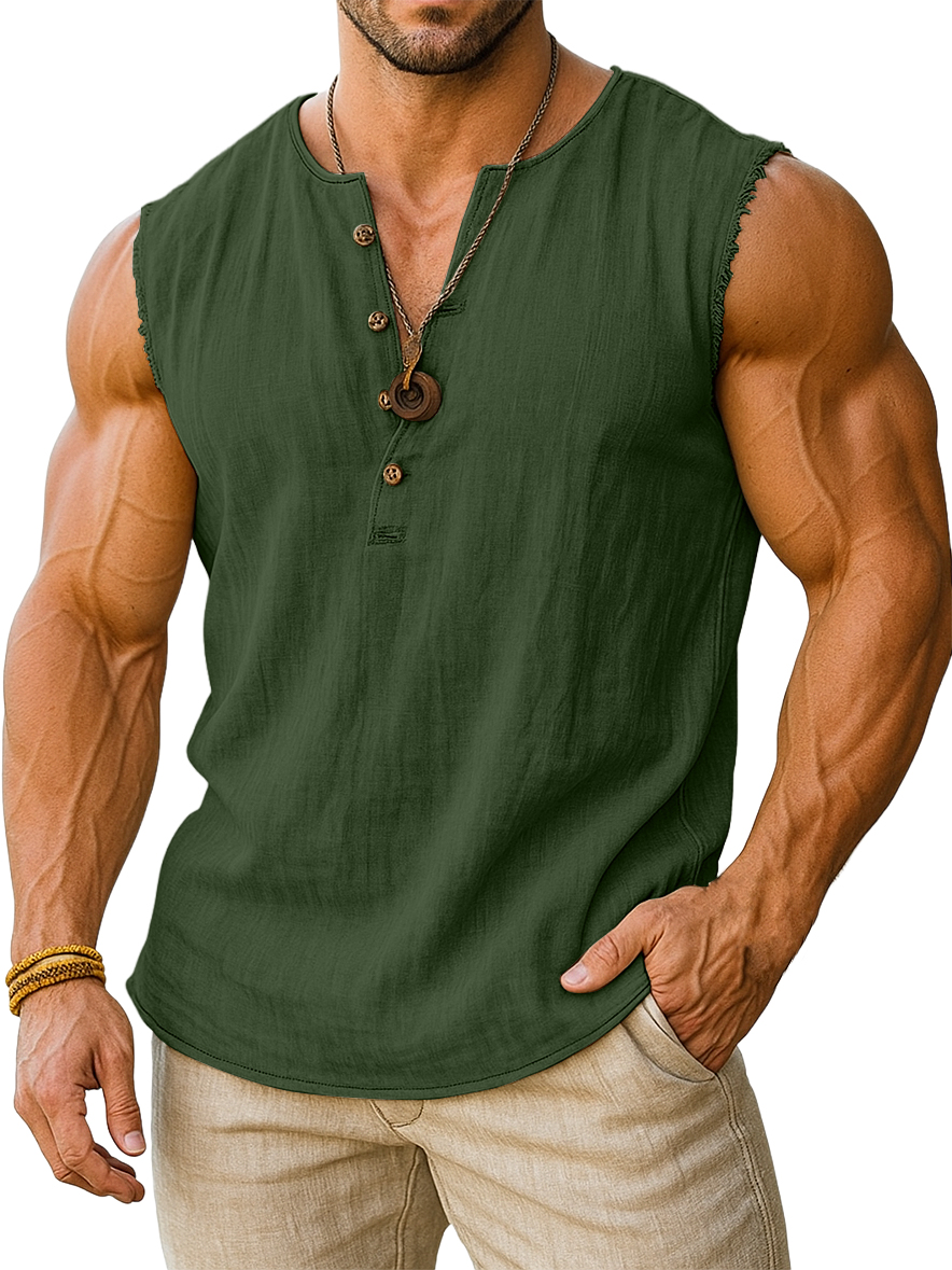 Men's Retro Cotton And Linen Sleeveless Henley Button-down T-shirt