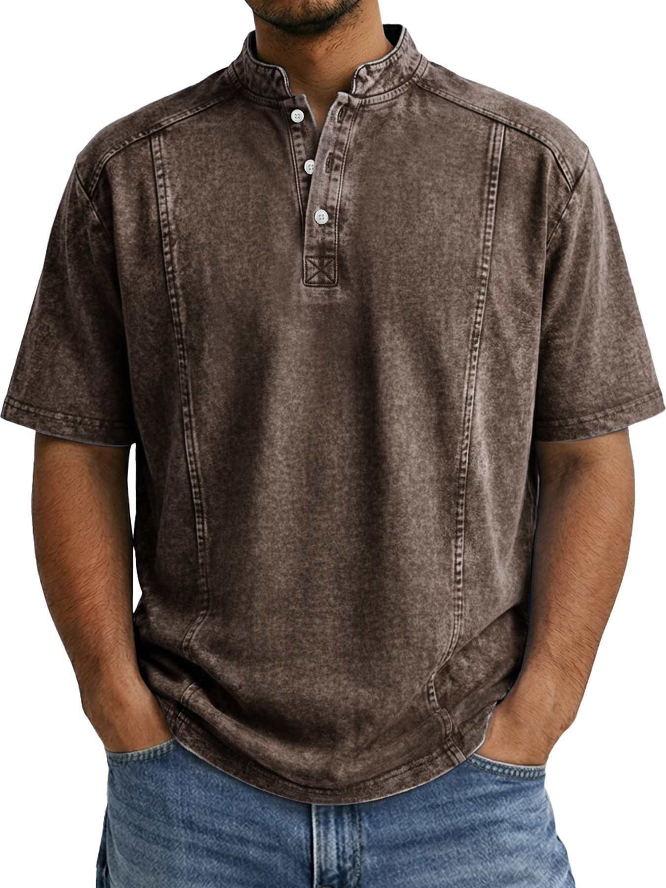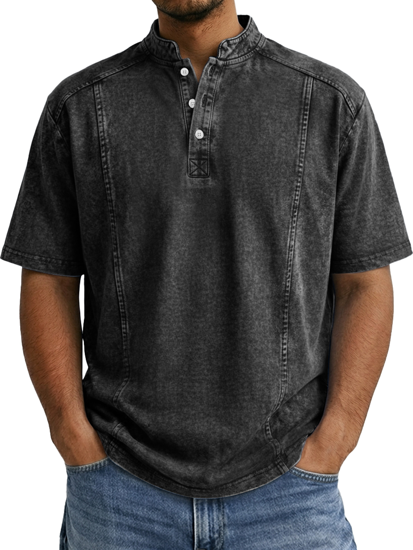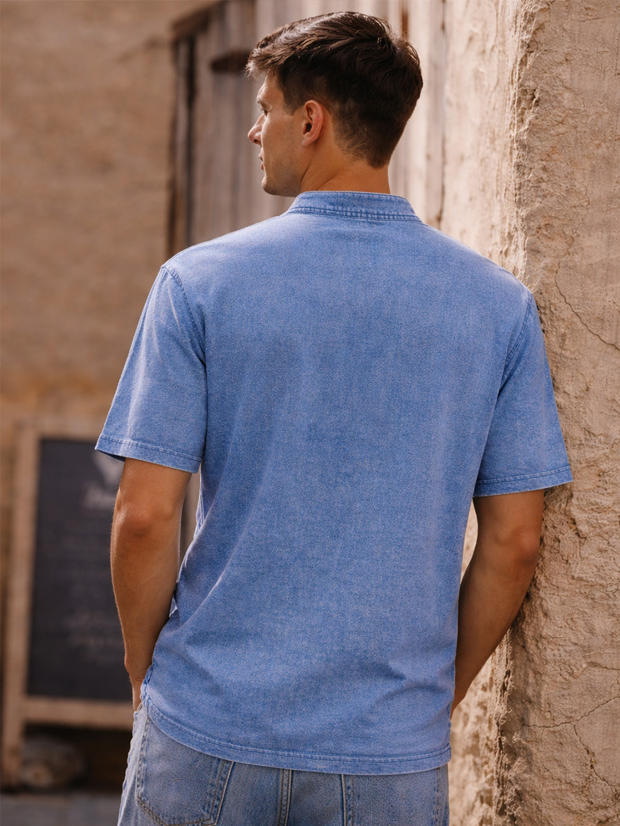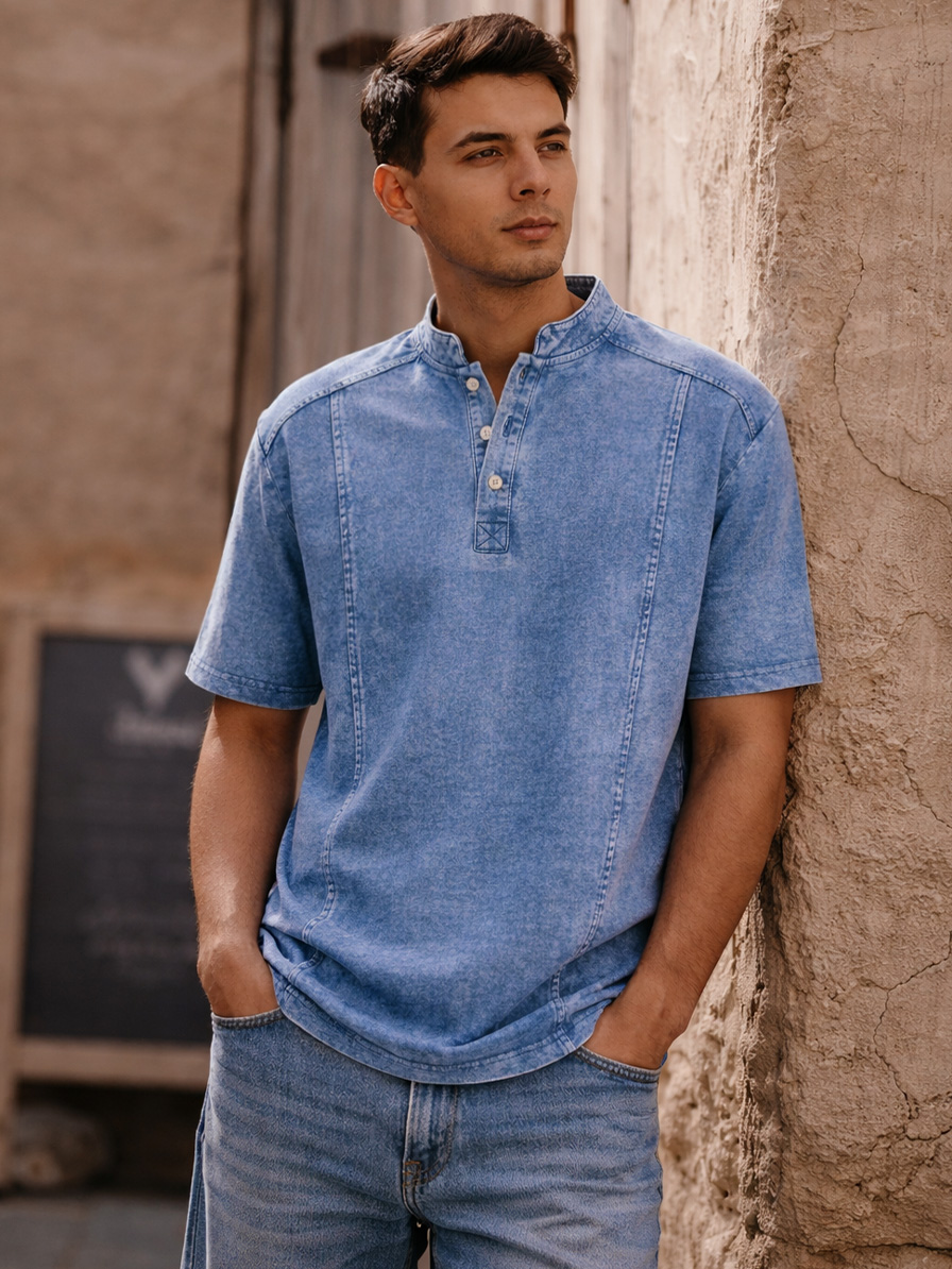 Men's Retro Deconstructed Stand Collar Casual Short Sleeve Henley Shirt