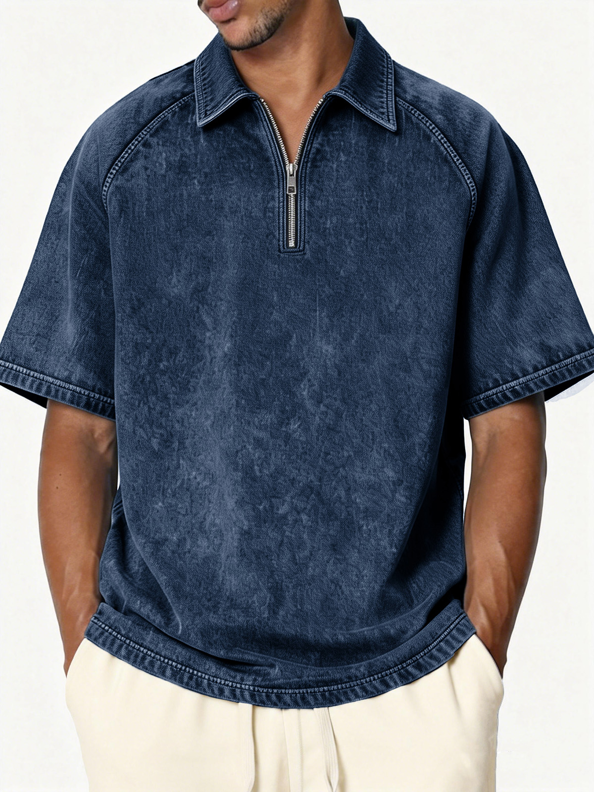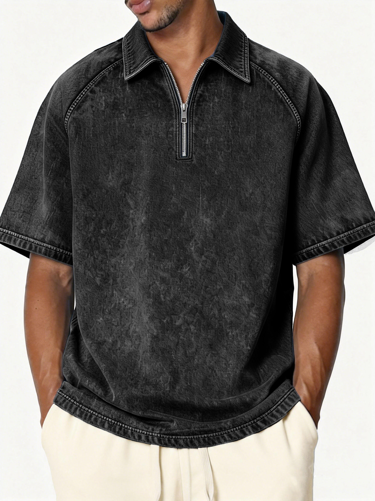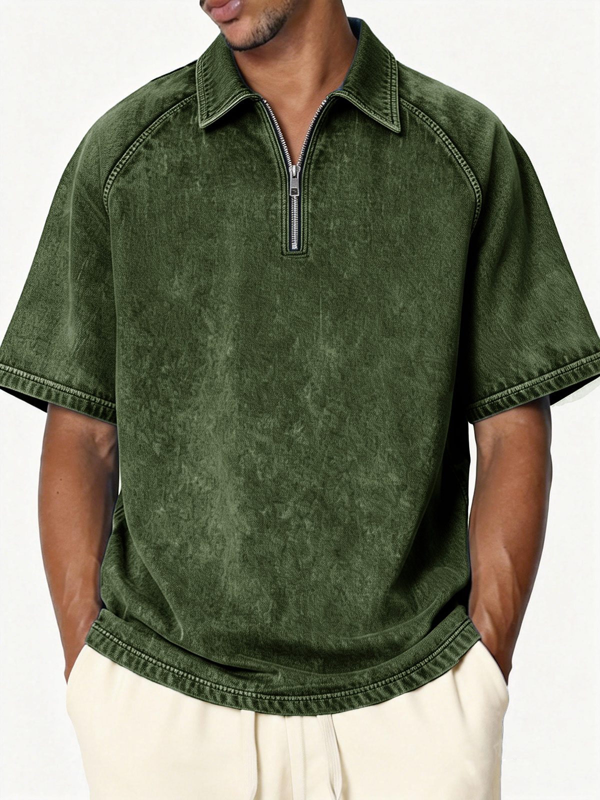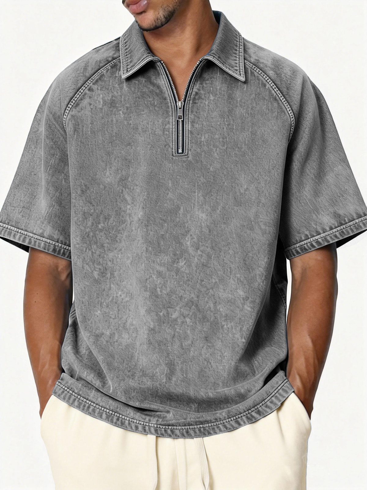 Men's Retro Distressed Raglan Collar Zipper Loose Short-Sleeve Polo Shirt
