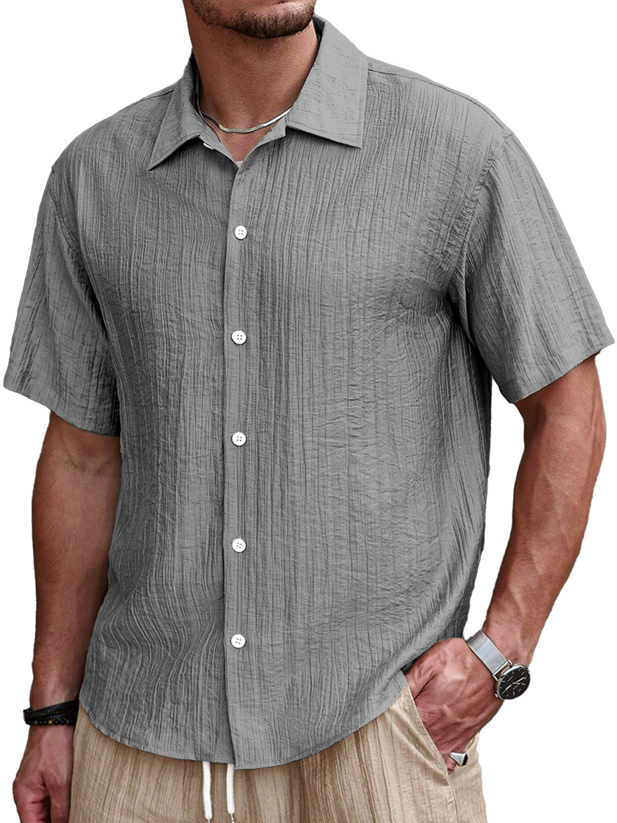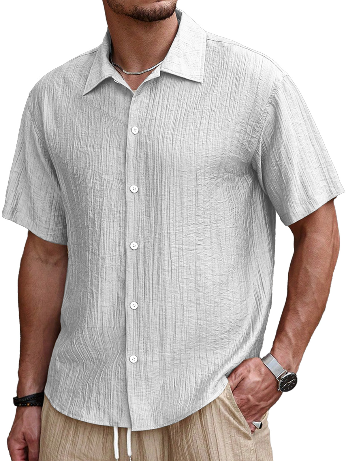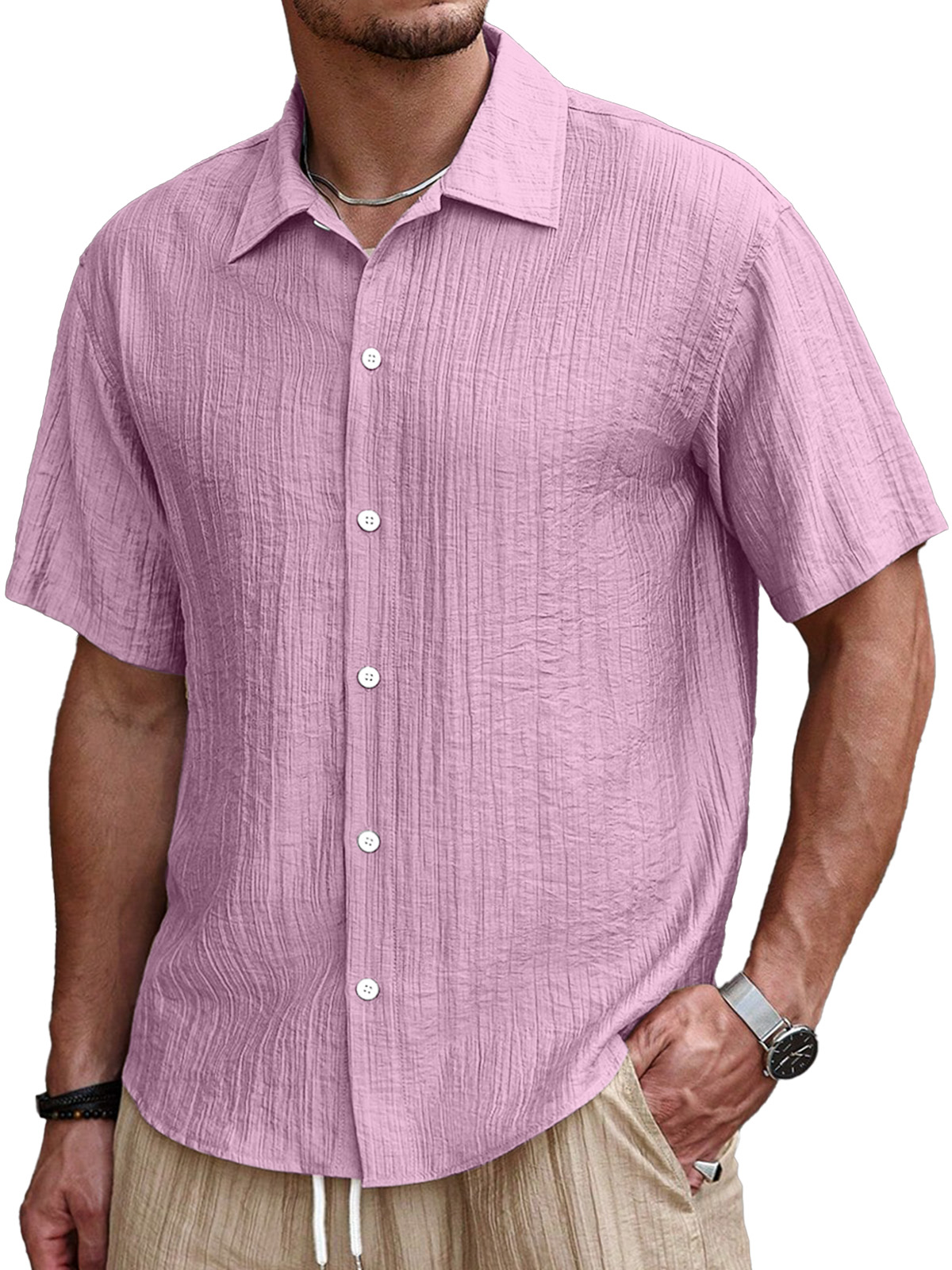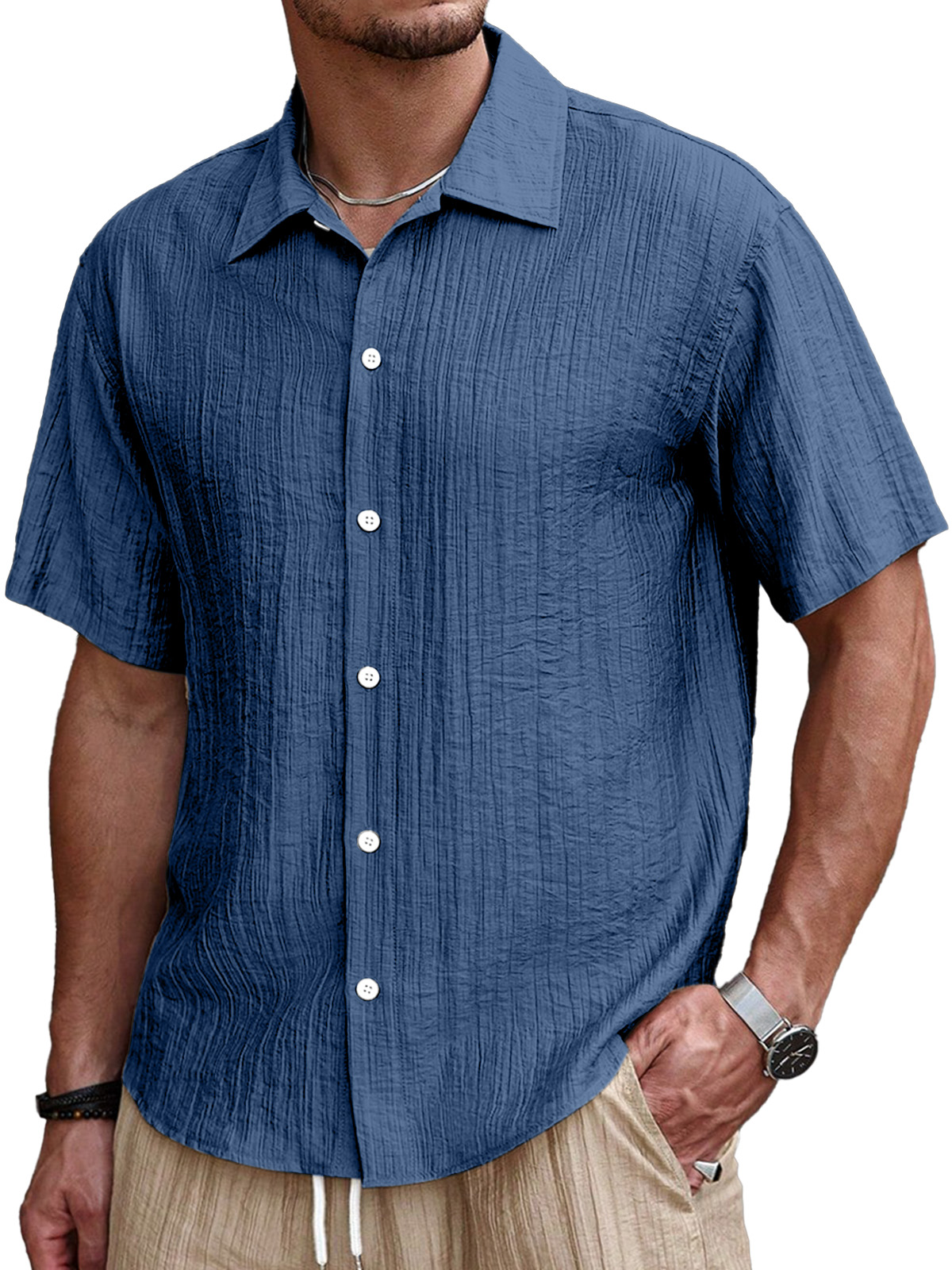 Men's Simple Casual Pleated Solid Color Short Sleeve Button Lapel Shirt