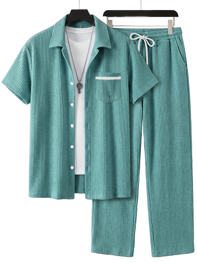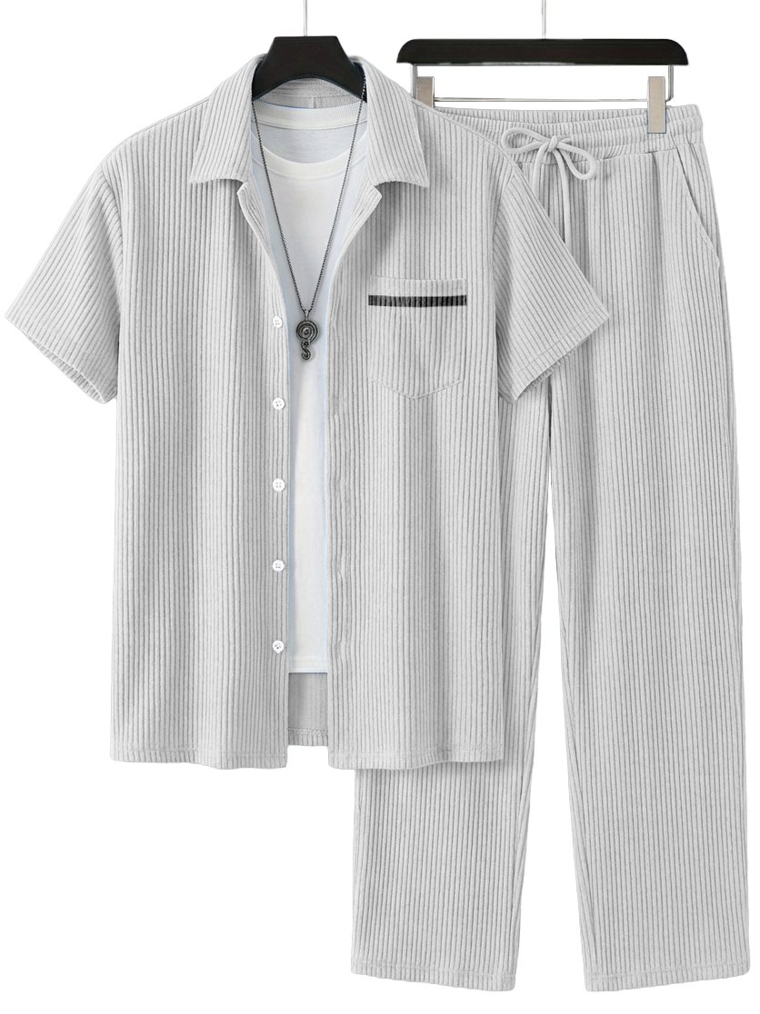Men's Simple Casual Ribbed Pocket Short-Sleeved Shirt and Casual Pants Set OOTD