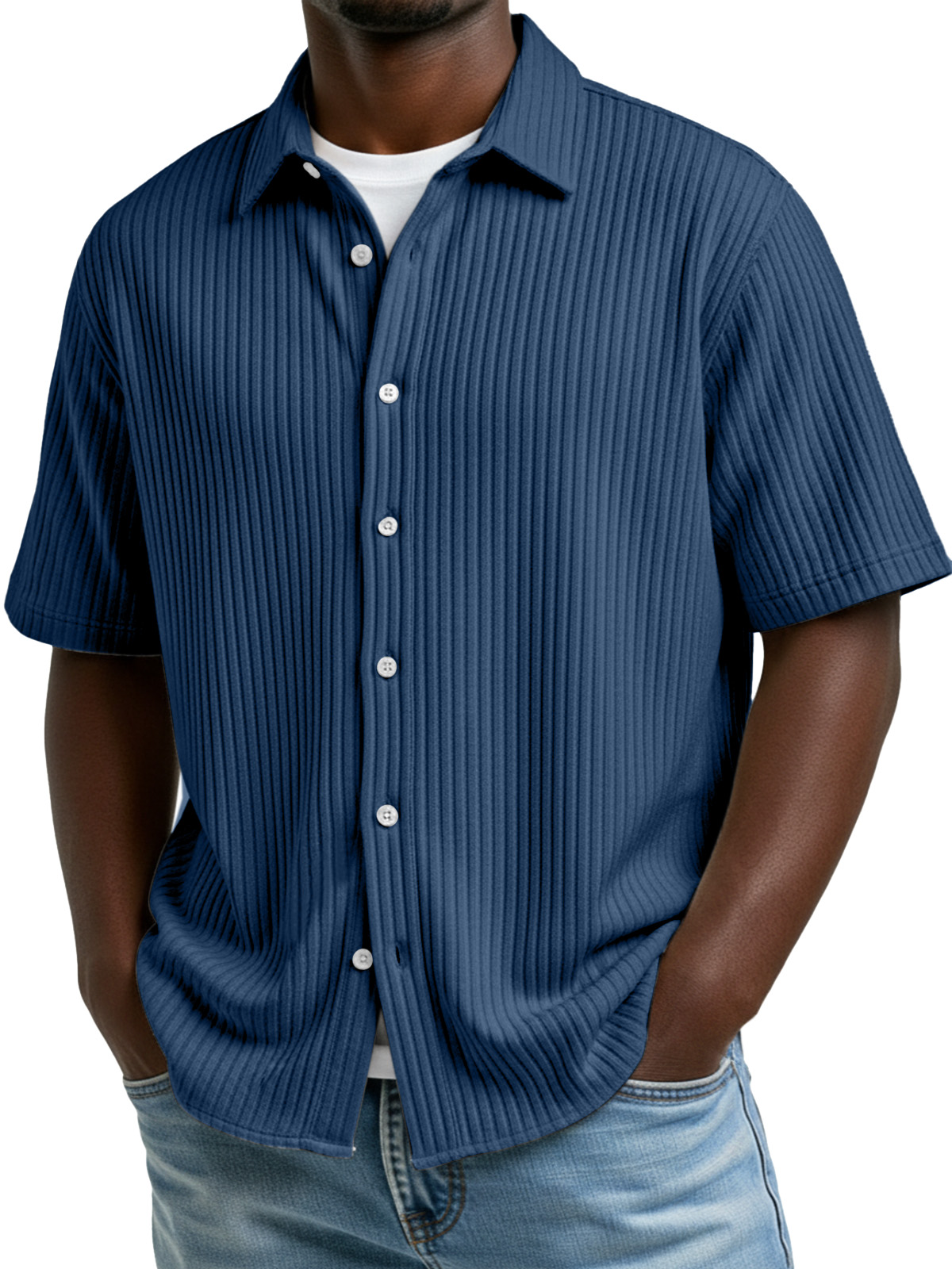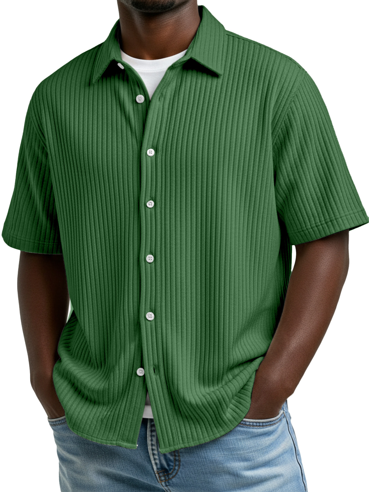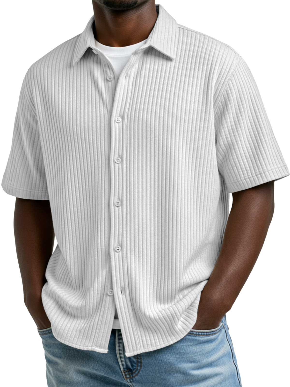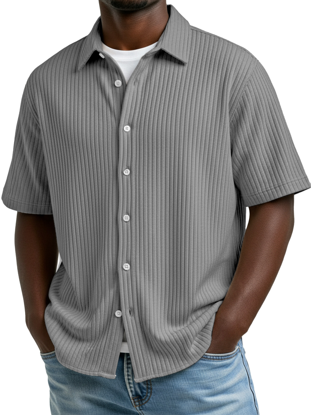 Men's Simple Solid Color Vertical Stripe Lapel Short-Sleeve Shirt