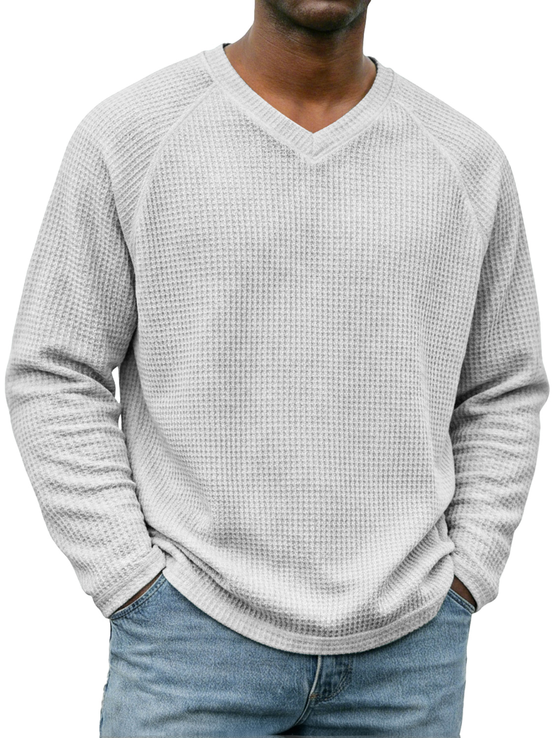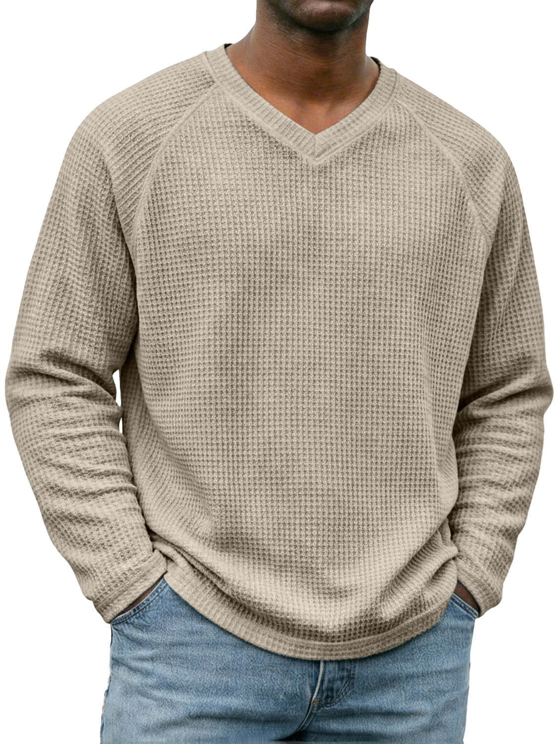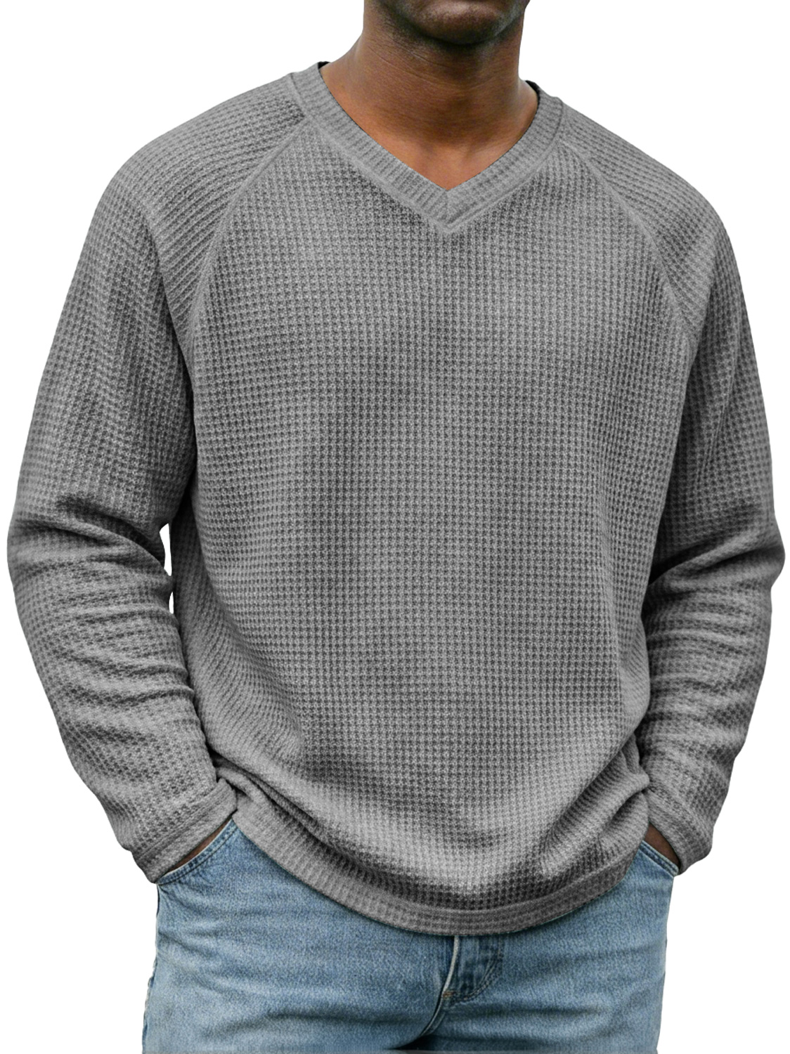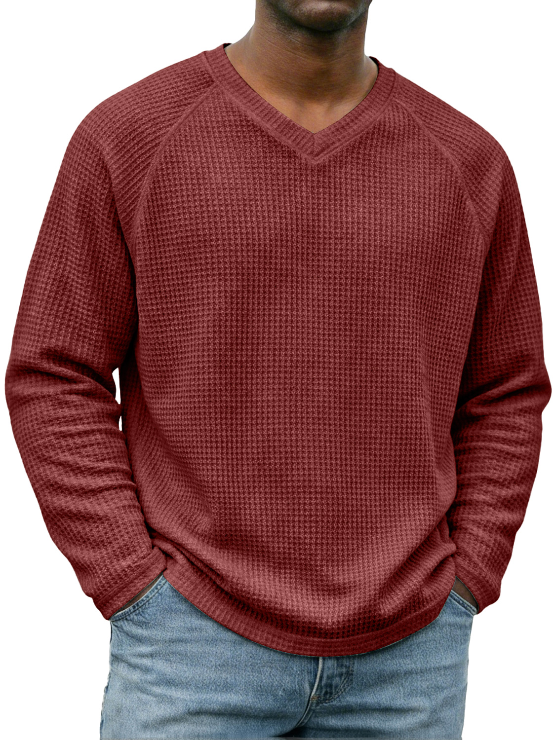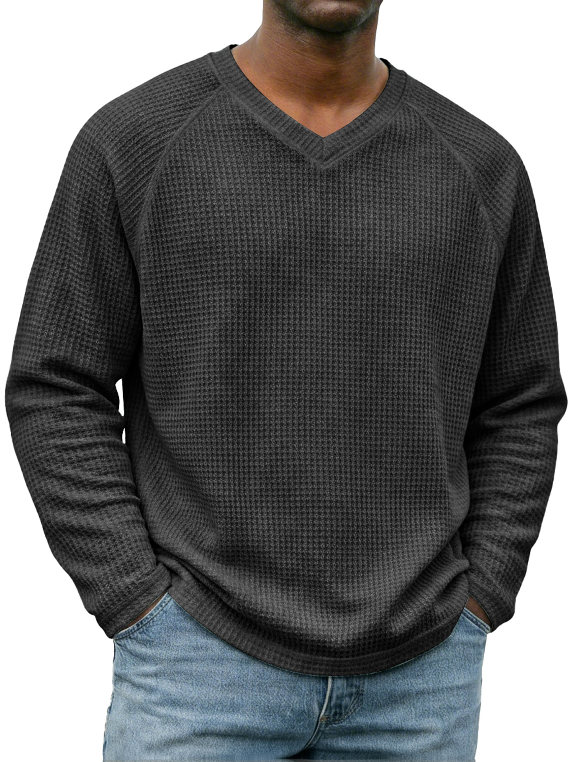 Men's Simple V-neck Raglan Sleeve Waffle Knit Casual Long-sleeved T-shirt