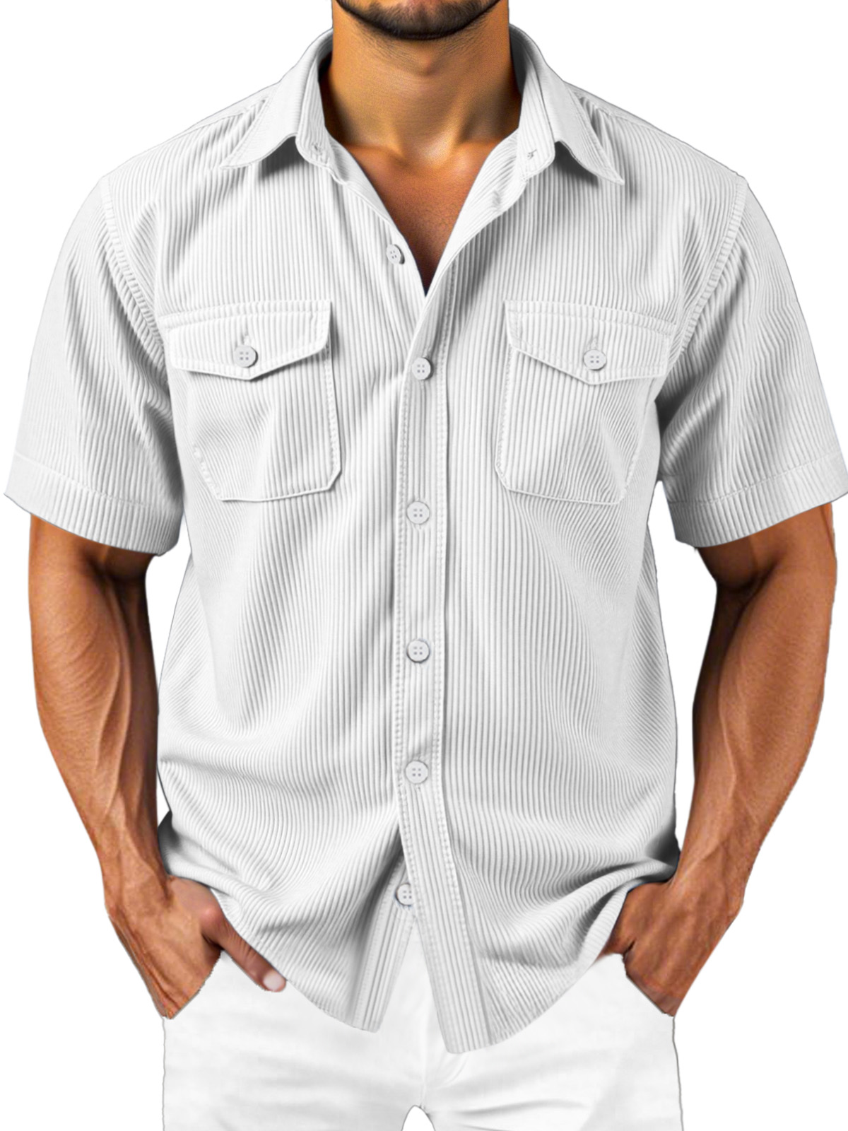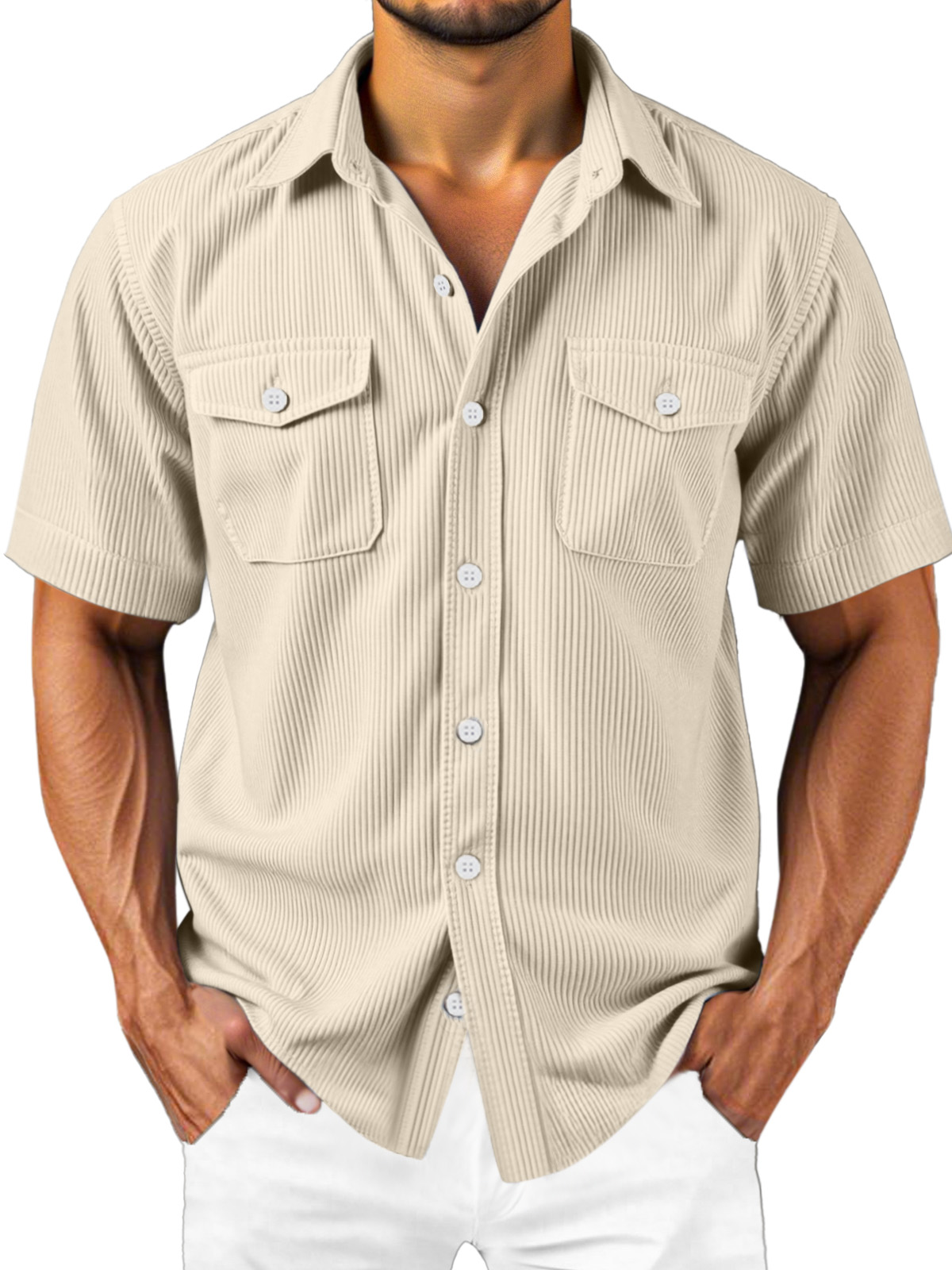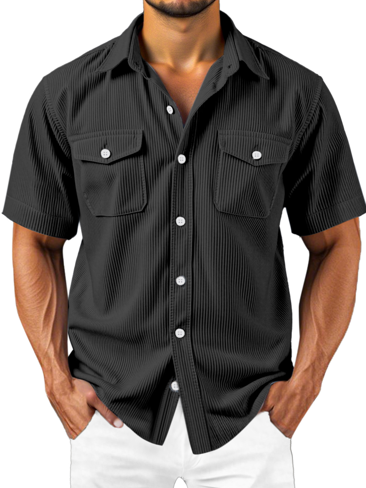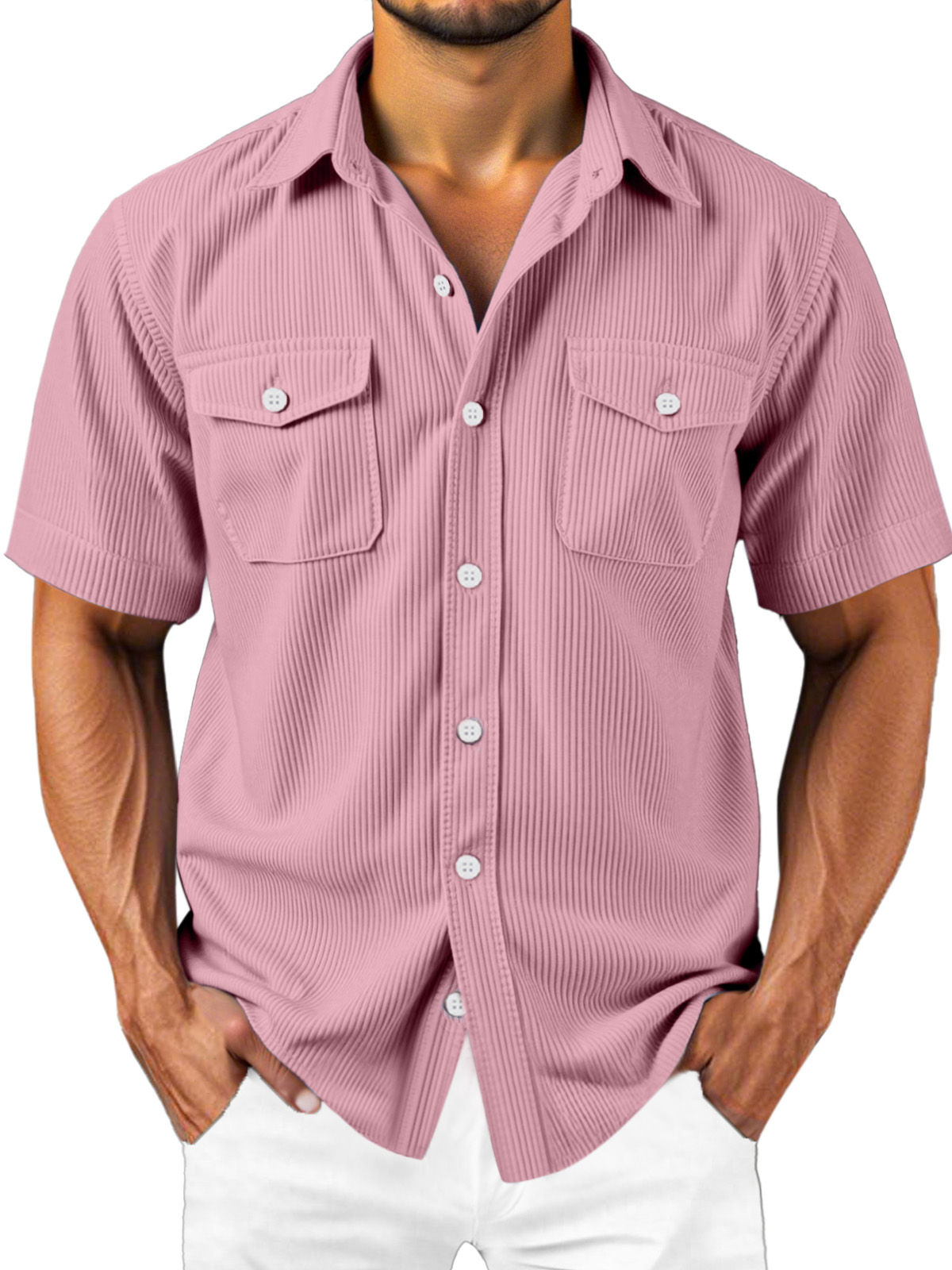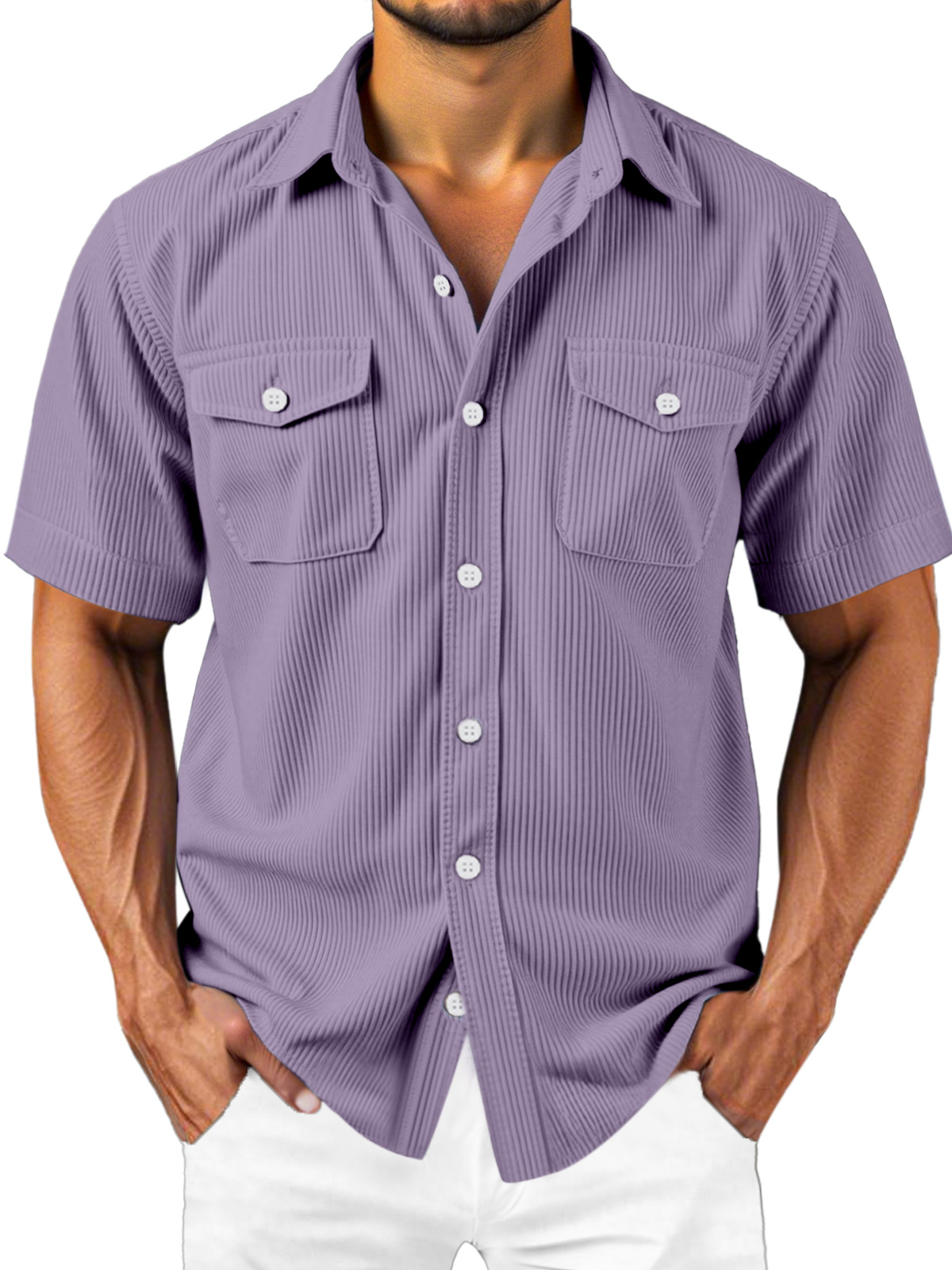 Men's Simple Vertical Pit Strip Solid Color Retro Double Pocket Short-sleeved Shirt