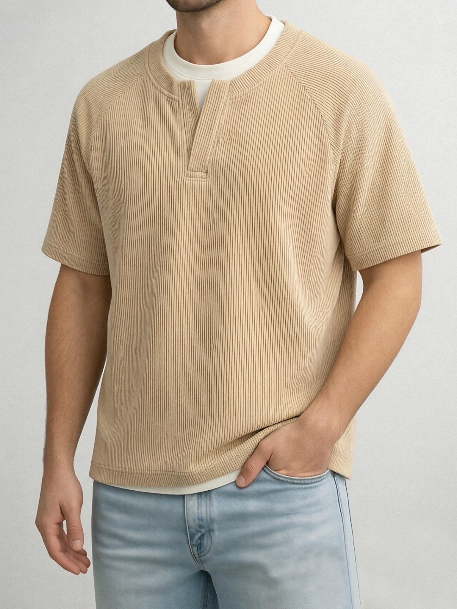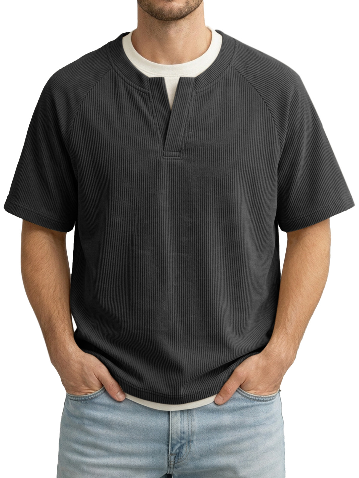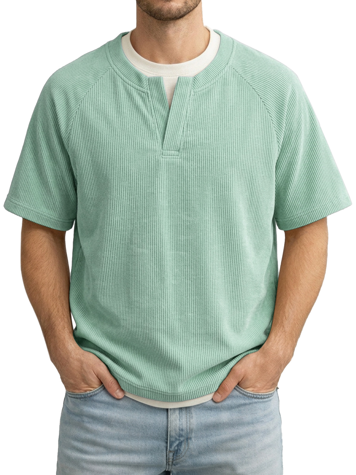 Men's Solid Color Fake Two-piece Vertical Pit V-neck Short-sleeved T-shirt