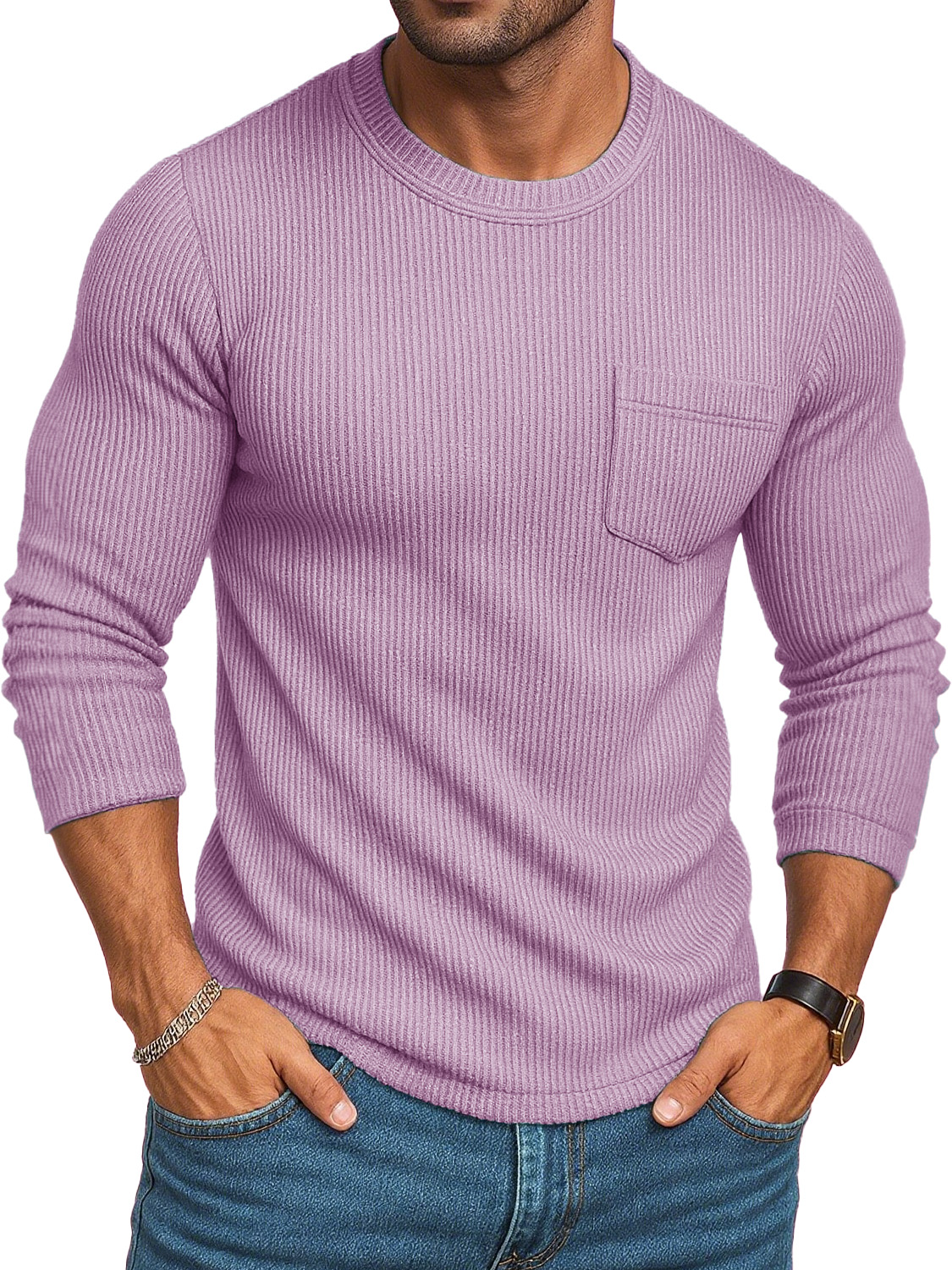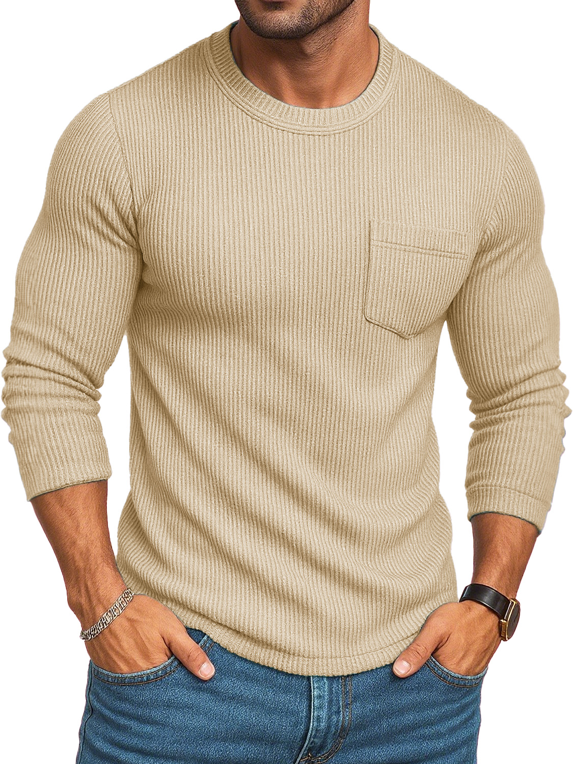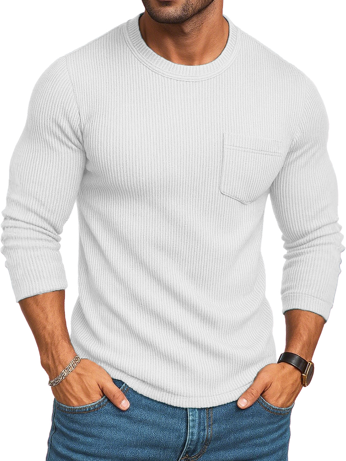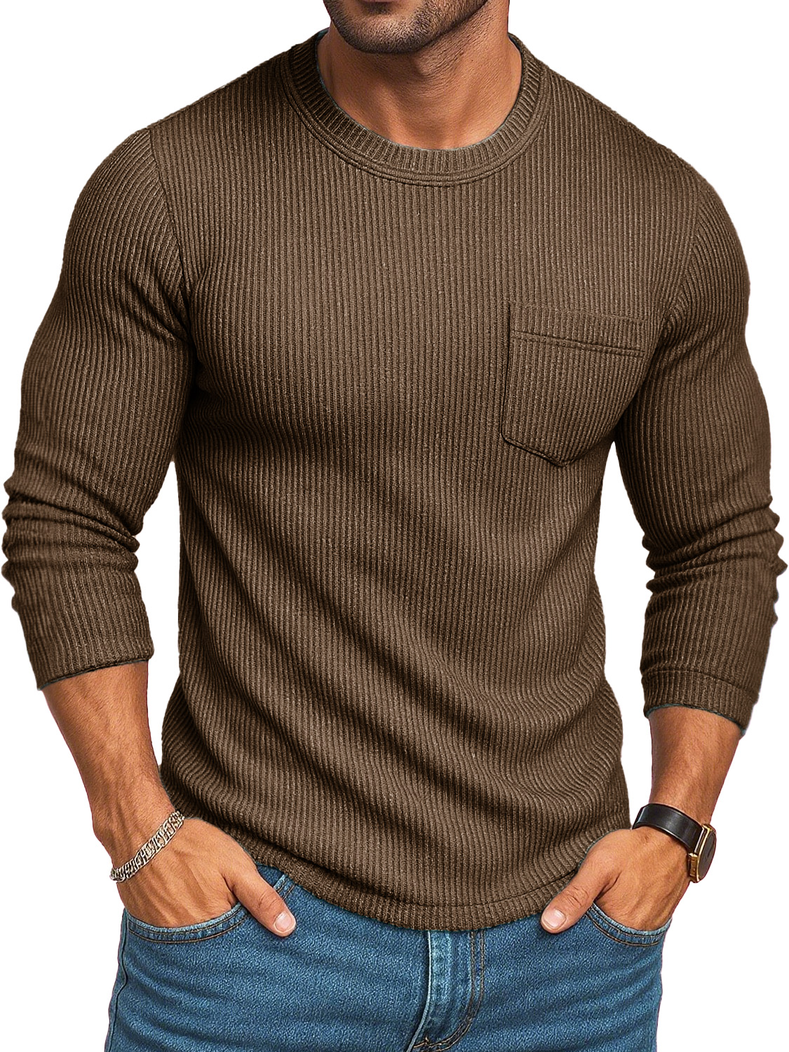Men's Stylish Casual Retro Round-neck Ribbed Fabric Long-sleeved Pocket T-shirt