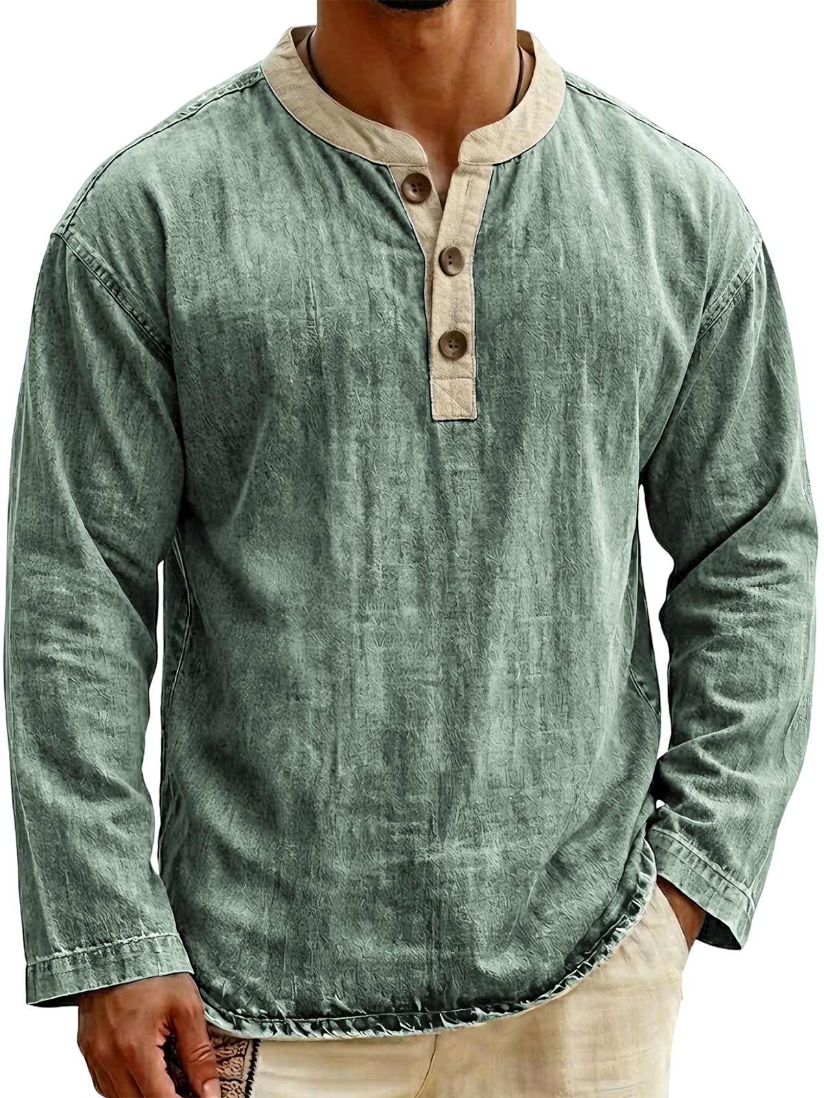 Men's Stylish Vintage Color-blocked Collar Pullover Henley Top