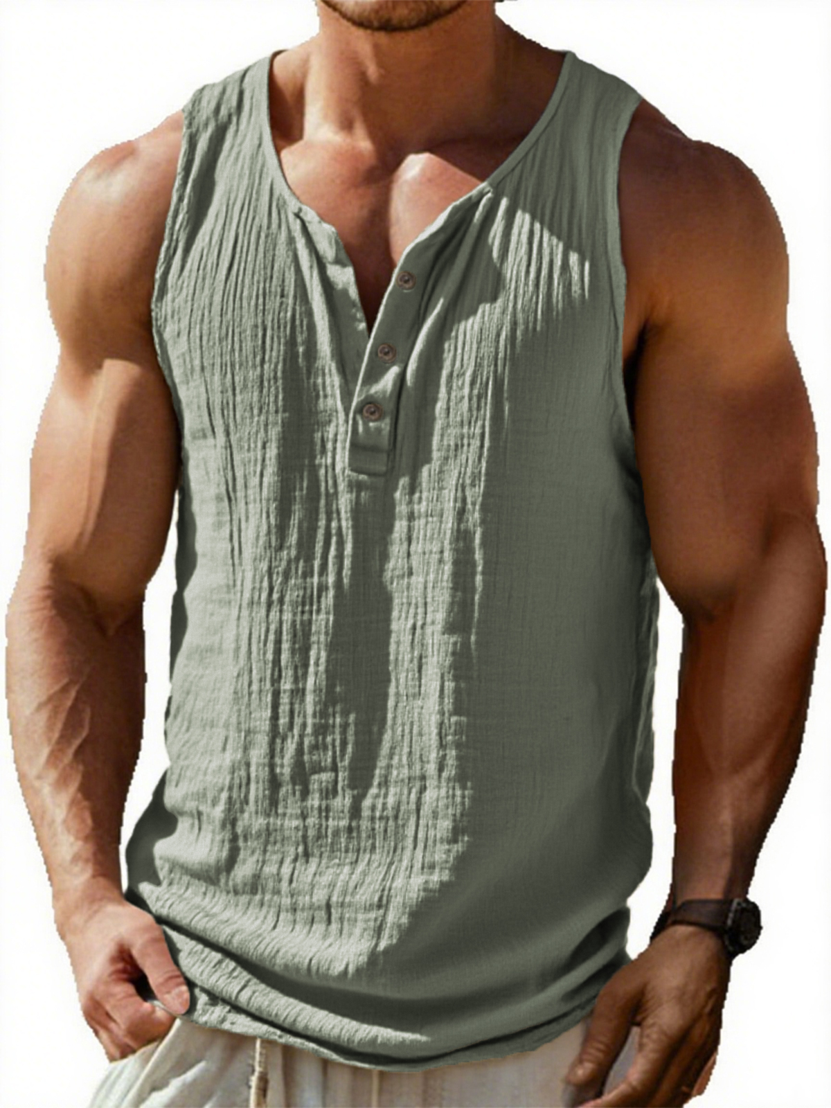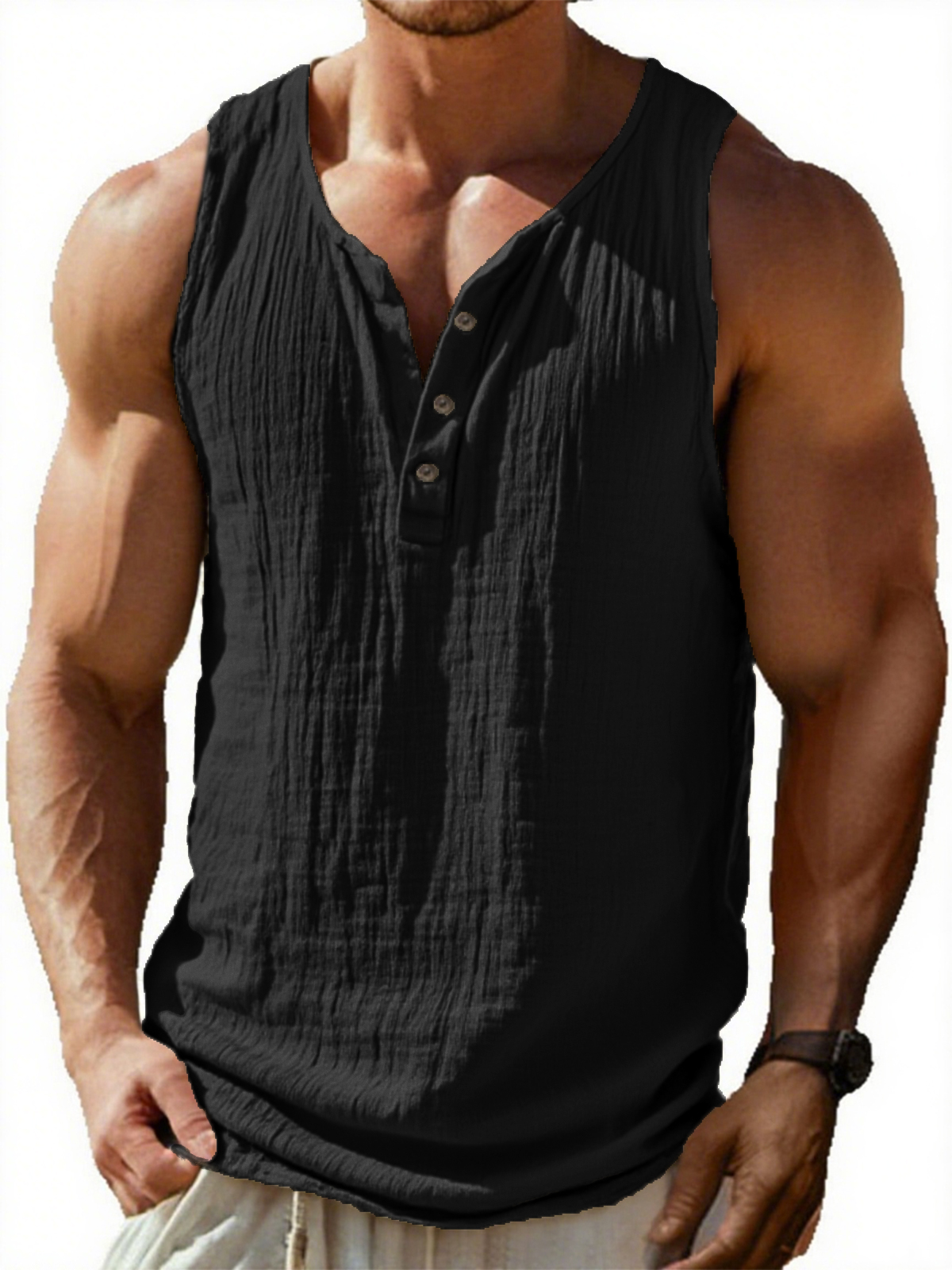 Men's Vintage Sleeveless Pleated Textured Three Button Henley T-Shirt