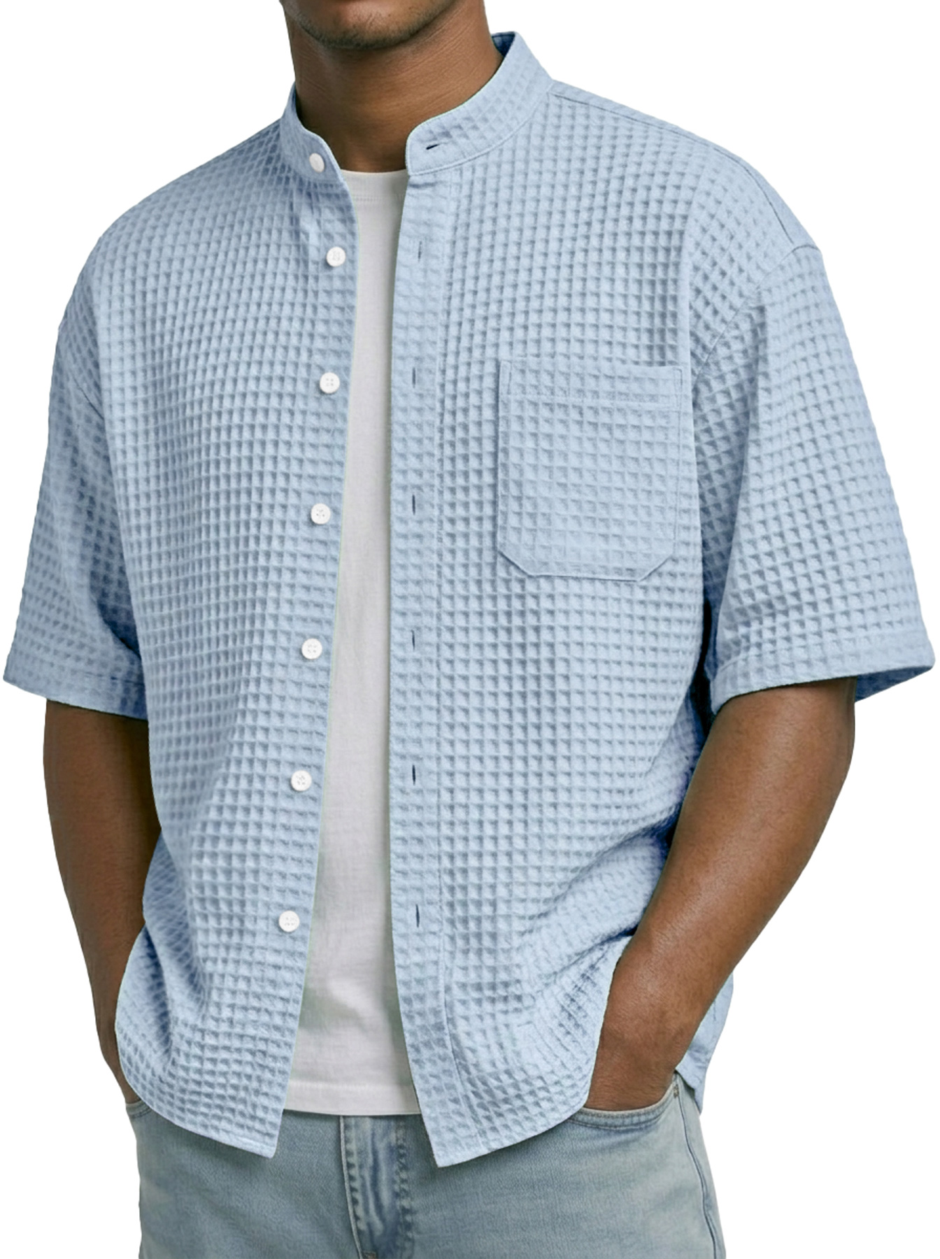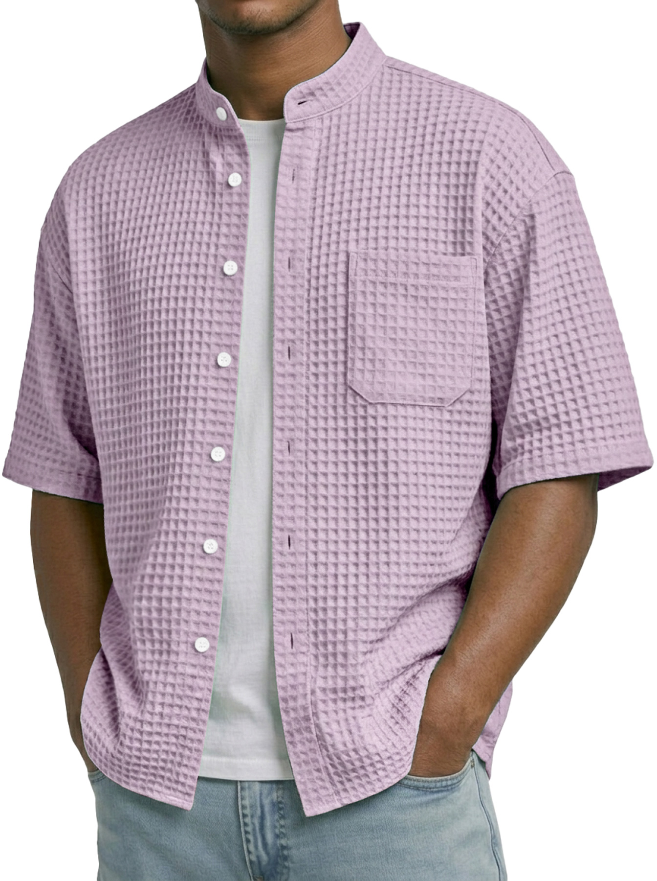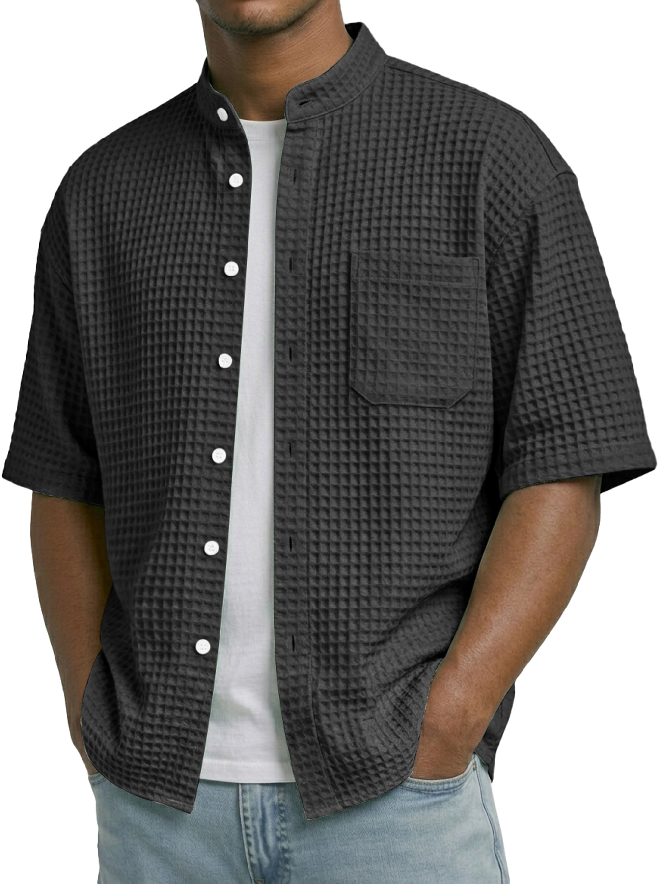 Men's Waffle Collar Stand Collar Pocket Casual Short-Sleeve Shirt