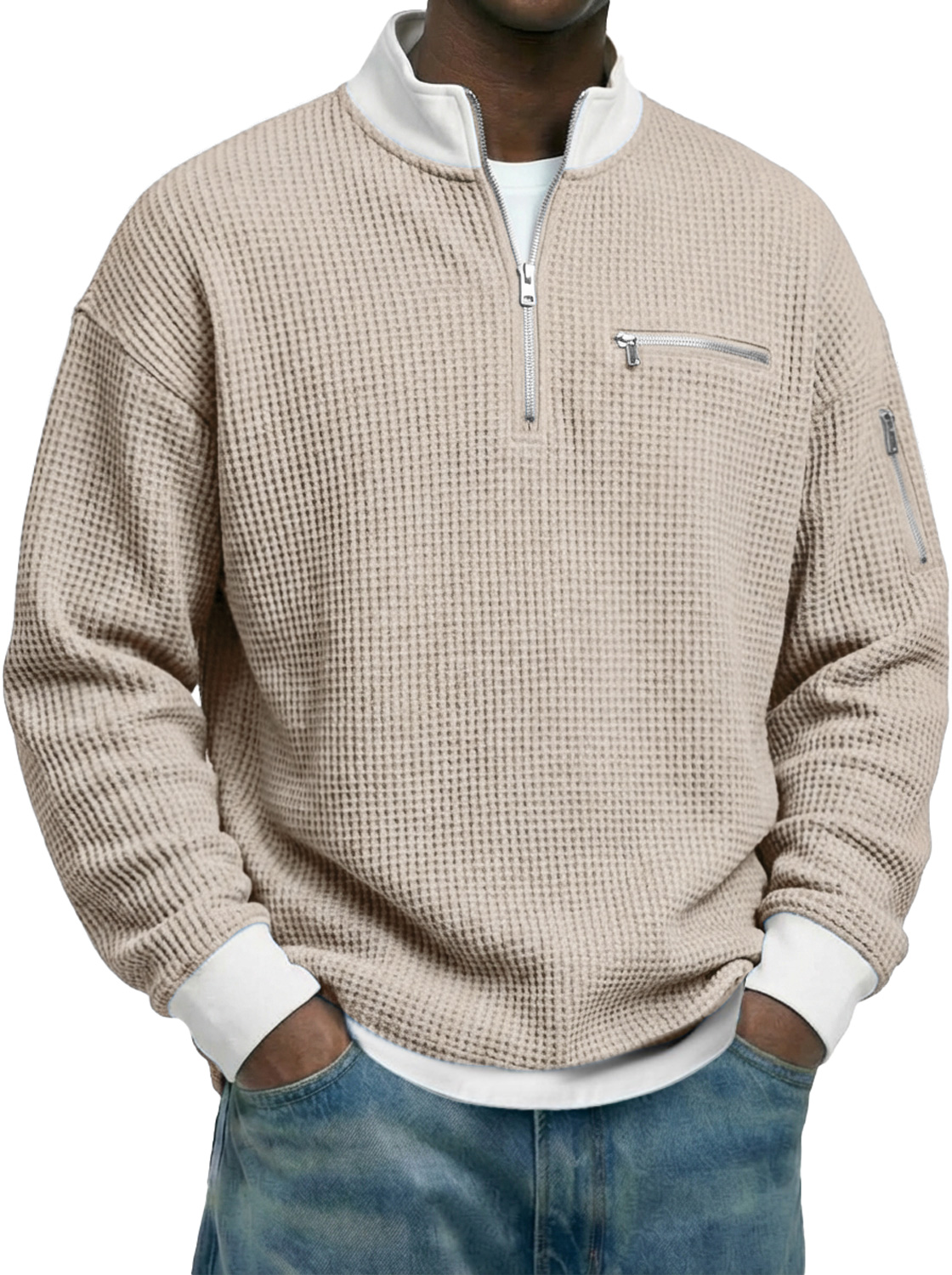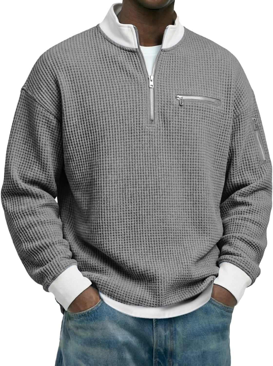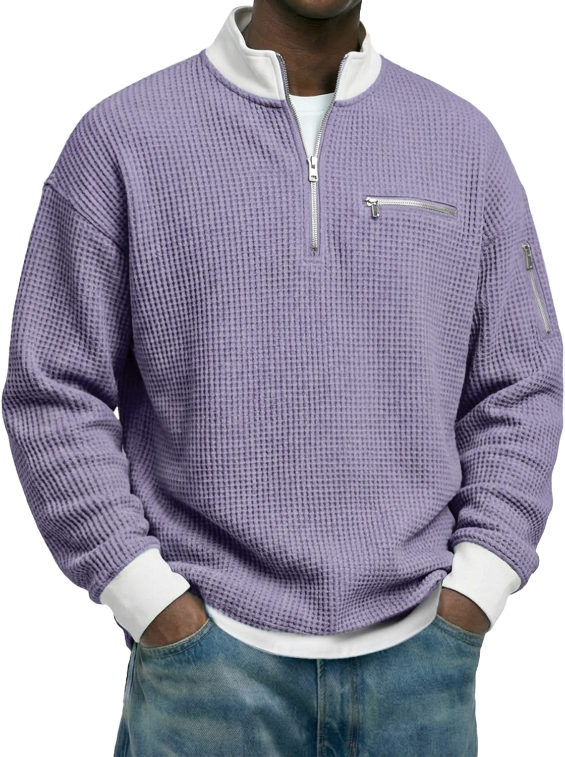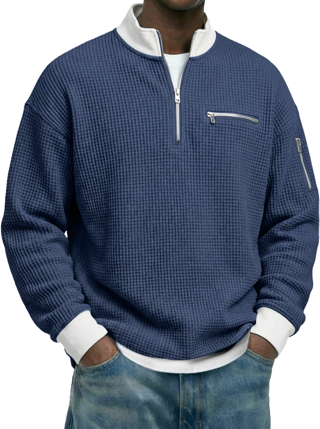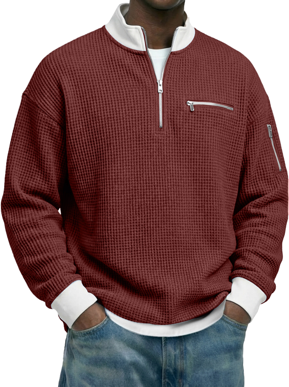 Men's Waffle-knit Stand-collar Color-block Zippered Casual Long-sleeved T-shirt
