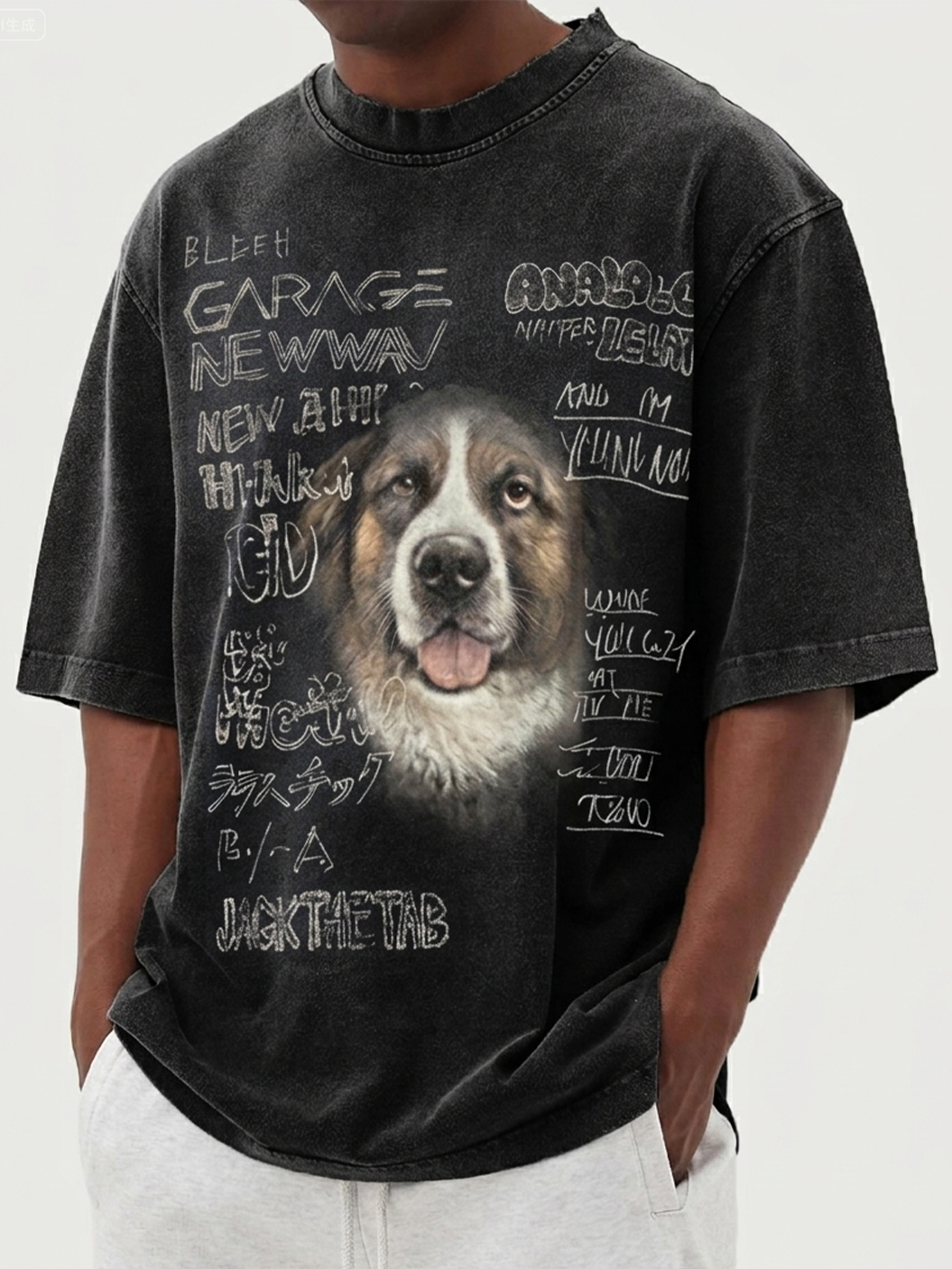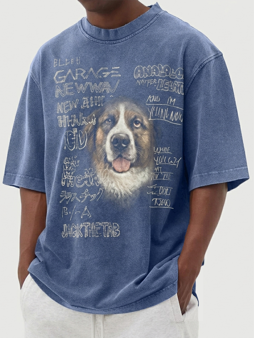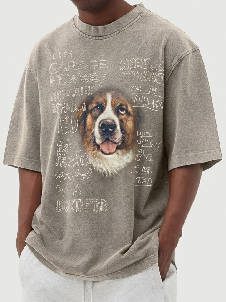 Men's Washed & Distressed Pure Cotton Dog-Print T-Shirt
